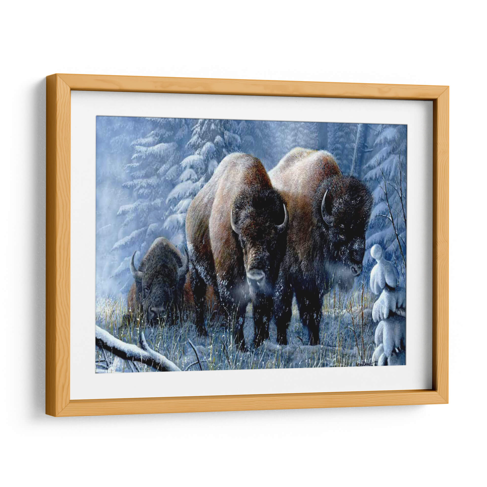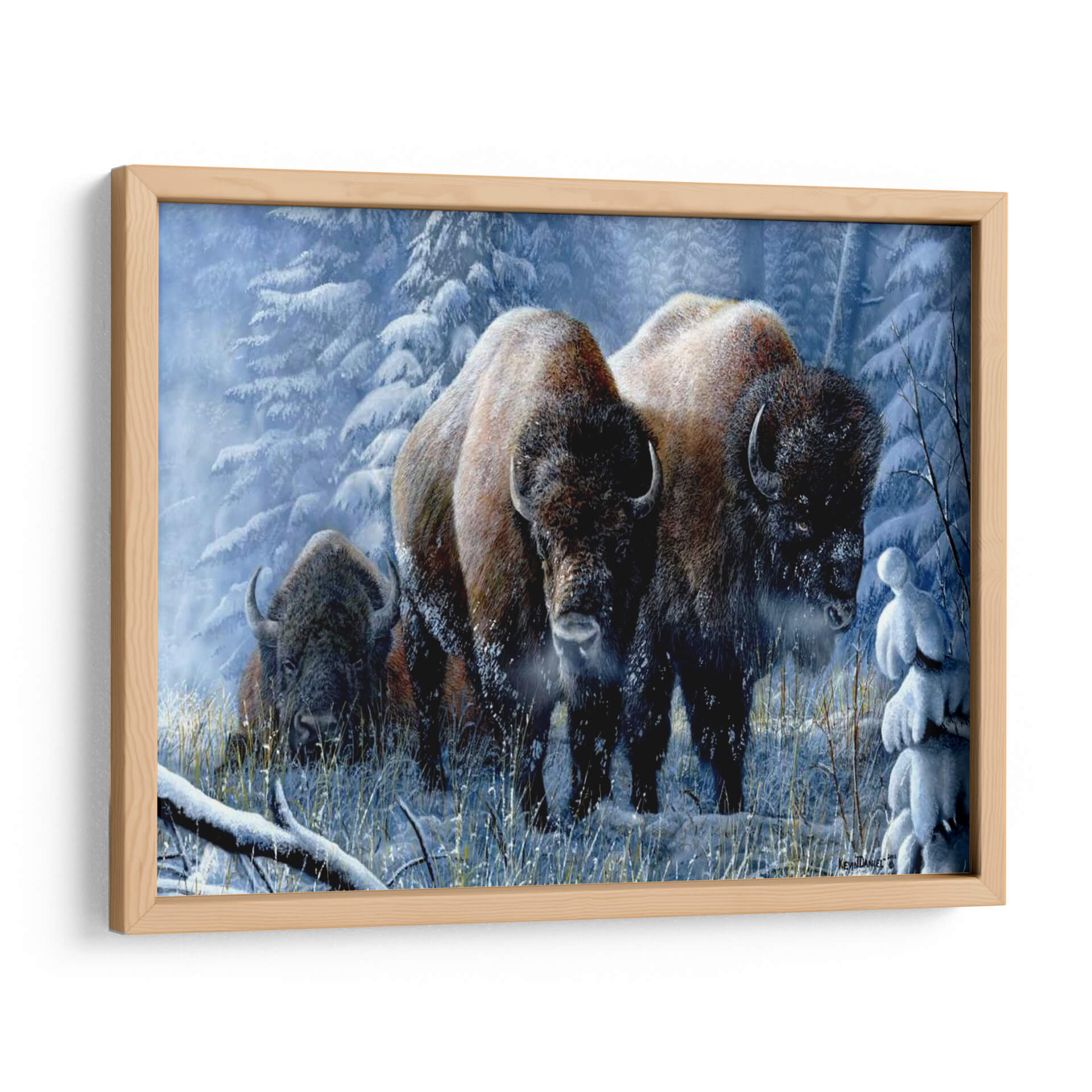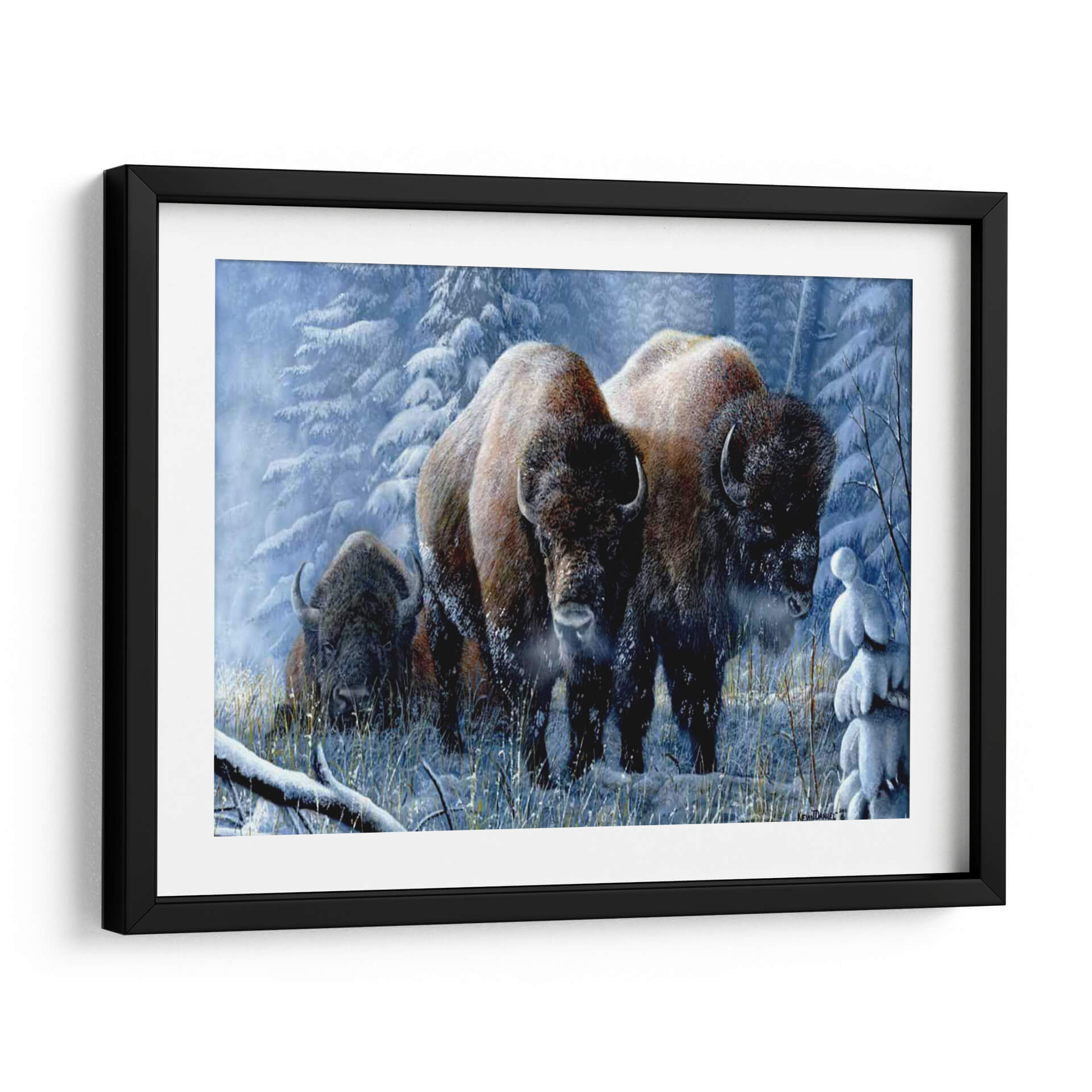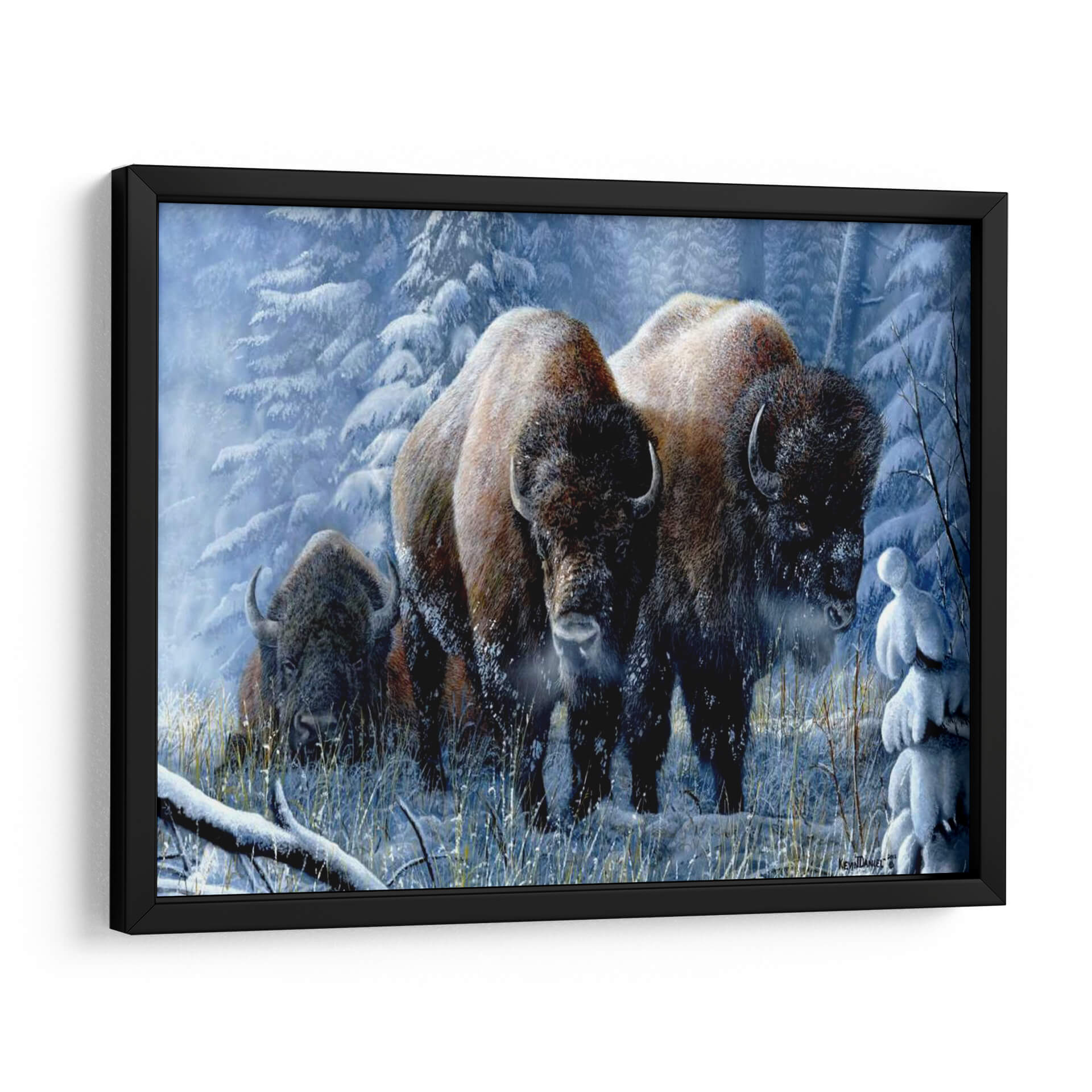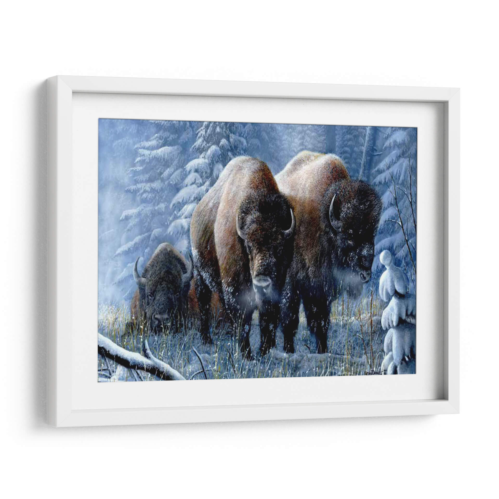 Sumérgete en la majestuosidad de "Respiro de Invierno", una obra de arte que captura la imponente belleza de los bisontes en un paisaje nevado y sereno. El artista Kevin Daniel nos transporta a un bosque invernal, donde la escarcha cubre los árboles y la nieve alfombra el suelo, creando una atmósfera de calma y resistencia. La paleta de colores fríos, dominada por azules pálidos, blancos helados y los cálidos tonos tierra de los bisontes, establece un contraste visual cautivador que evoca la pureza del invierno y la fuerza intrínseca de estos magníficos animales. La composición, con los bisontes emergiendo de la niebla invernal y mirando directamente al espectador, genera una conexión íntima y poderosa. Este cuadro decorativo es ideal para aquellos que buscan infundir sus espacios con una sensación de naturaleza salvaje, tranquilidad y la resistencia inherente a la vida en climas fríos. Perfecto para salones, estudios u oficinas que deseen un punto focal inspirador y una conexión con la fuerza indómita del reino animal. "Respiro de Invierno" no es solo una imagen, es una invitación a experimentar la paz y la potencia del invierno.