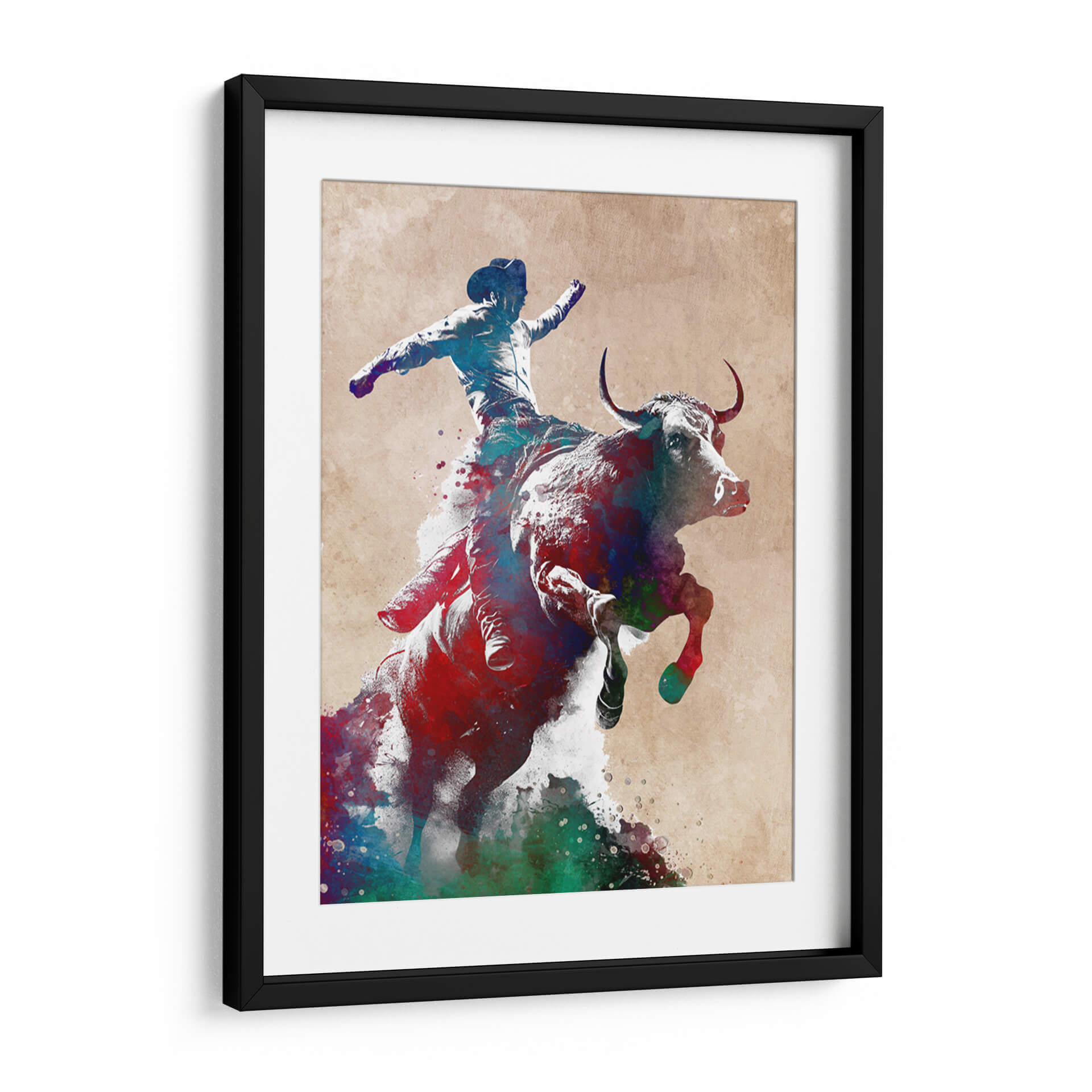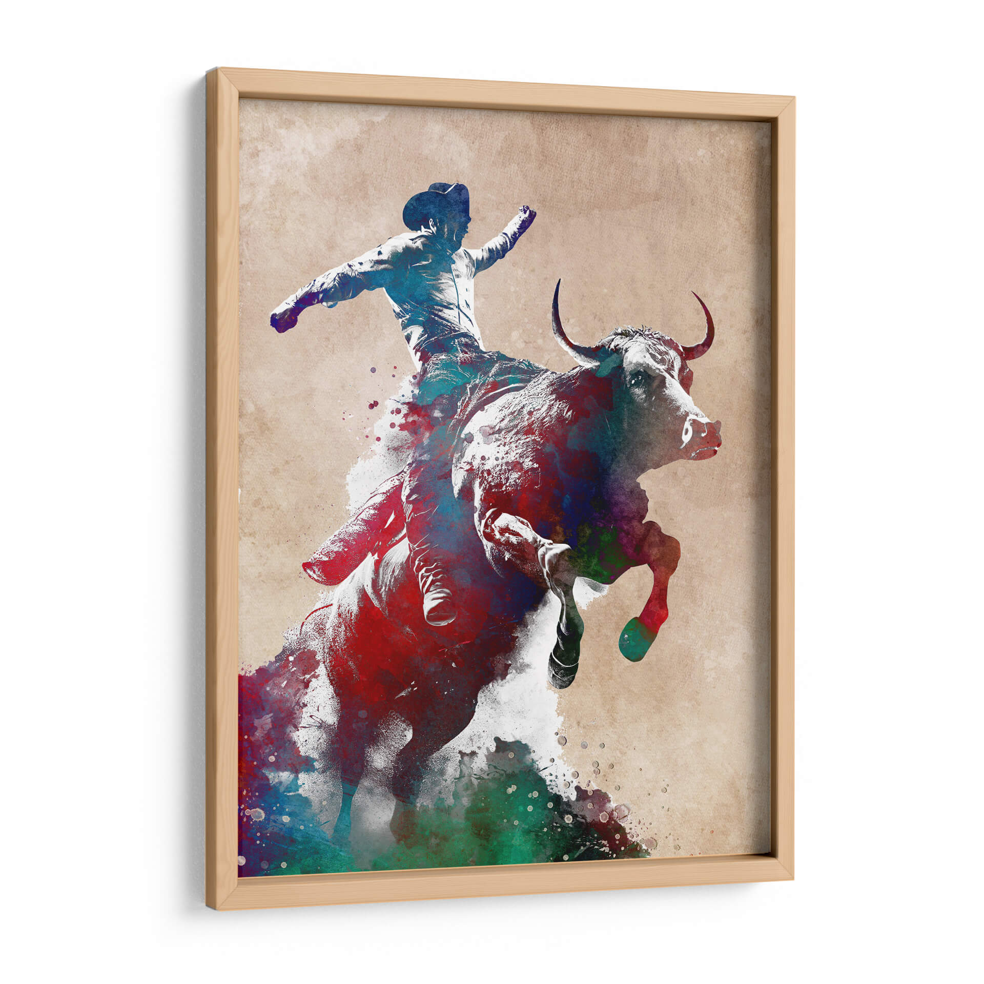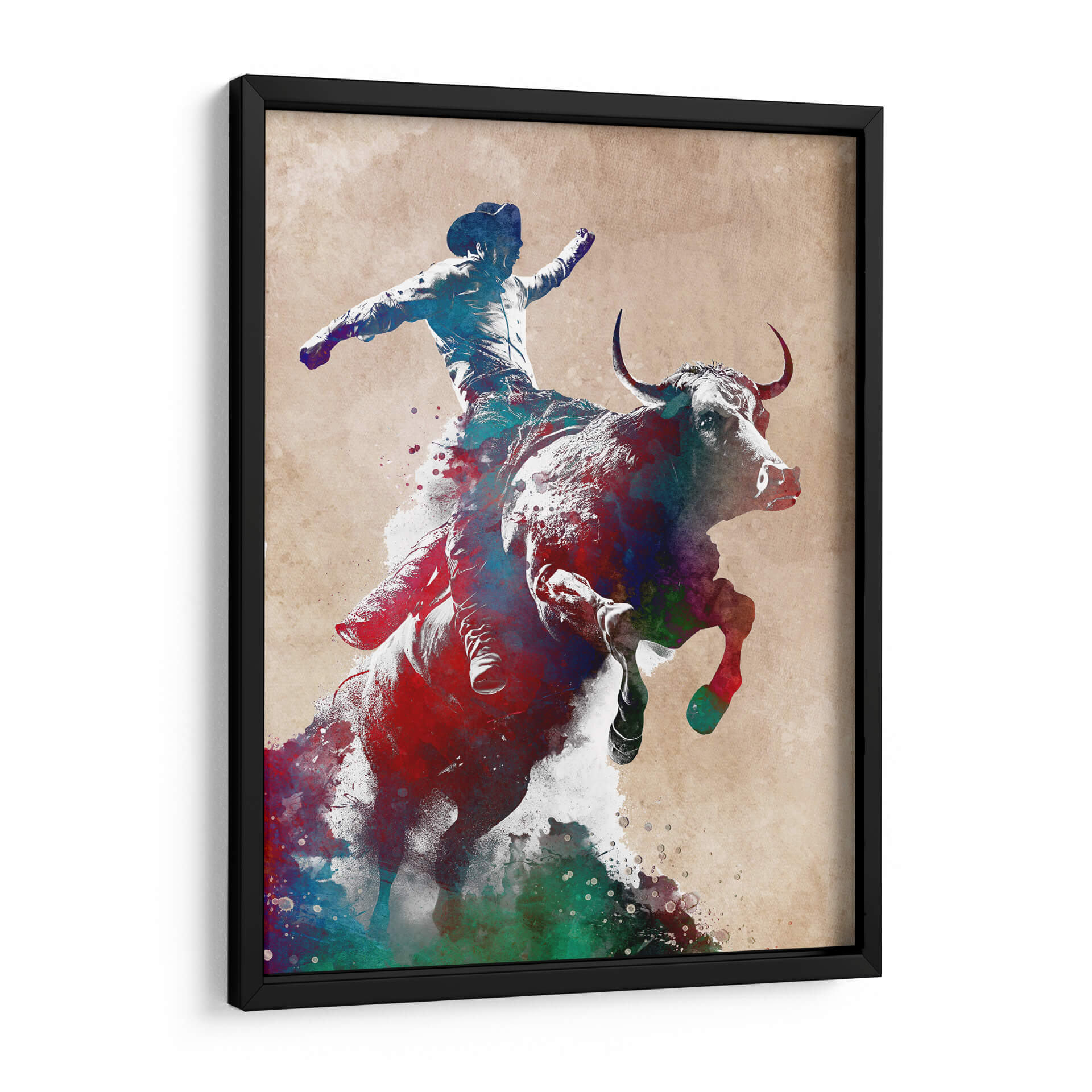 Sumérgete en la adrenalina y la pasión del rodeo con este impactante cuadro decorativo, "Rodeo Deportivo 1", de la artista Justyna Jaszke. Esta obra captura el momento cumbre de la doma de toros, donde la fuerza bruta del animal se encuentra con la destreza y el coraje del jinete. La técnica de acuarela digital utilizada aporta una dimensión vibrante y dinámica, con explosiones de color rojo intenso, azul eléctrico y verde esmeralda que contrastan magistralmente con el fondo texturizado de tonos tierra, evocando la arena del estadio y la crudeza del espectáculo. La composición dinámica, con el toro en pleno salto y el jinete aferrándose con determinación, transmite una sensación de movimiento y energía palpable. Es una pieza ideal para espacios que buscan un toque de audacia y carácter, como una sala de estar moderna, un estudio o una oficina, añadiendo un punto focal que sin duda atraerá miradas y conversaciones. Este cuadro decorativo no es solo una imagen, es una representación de la lucha, la resistencia y el espíritu indomable, perfecta para aquellos que aprecian la emoción de los deportes ecuestres y el arte contemporáneo con fuerza expresiva.