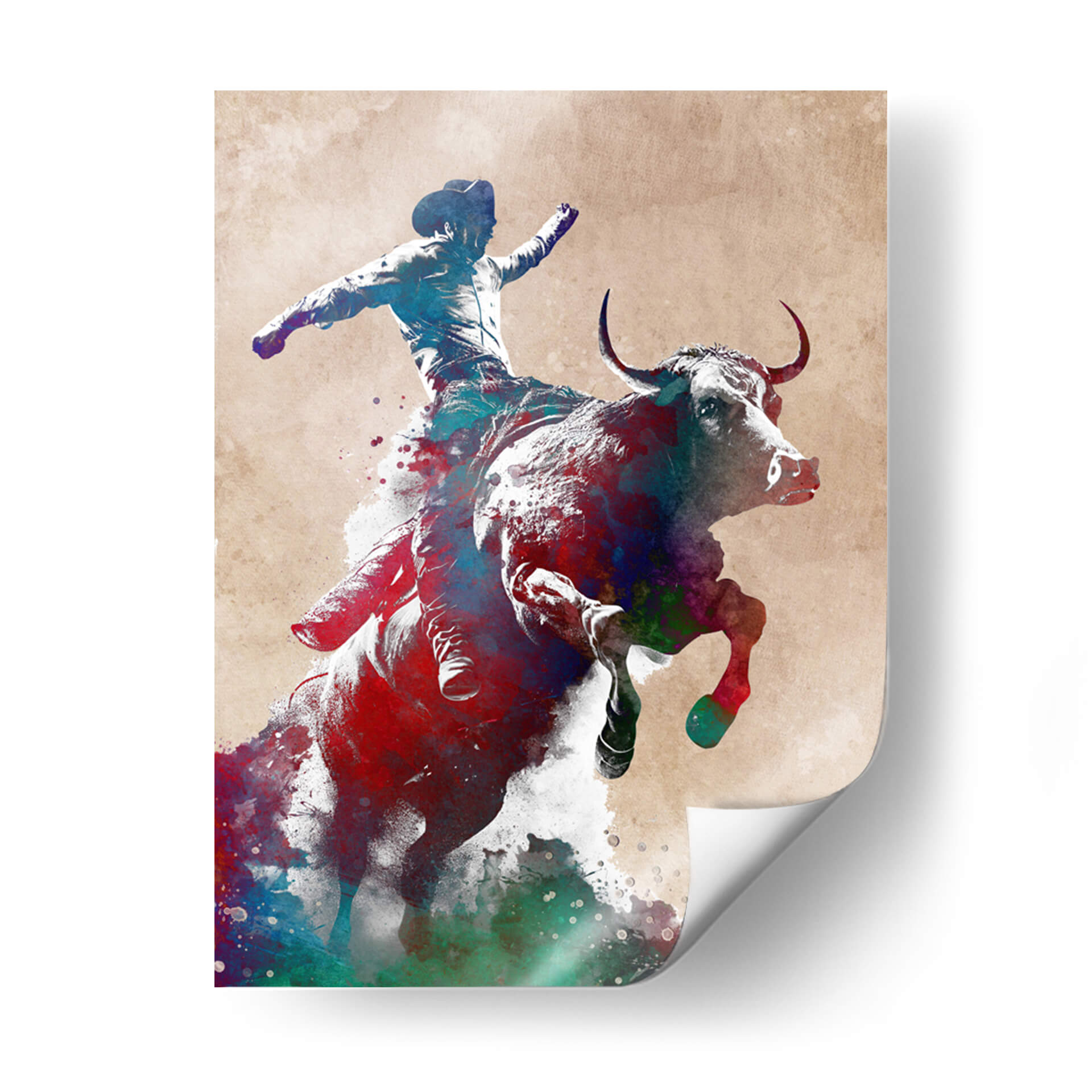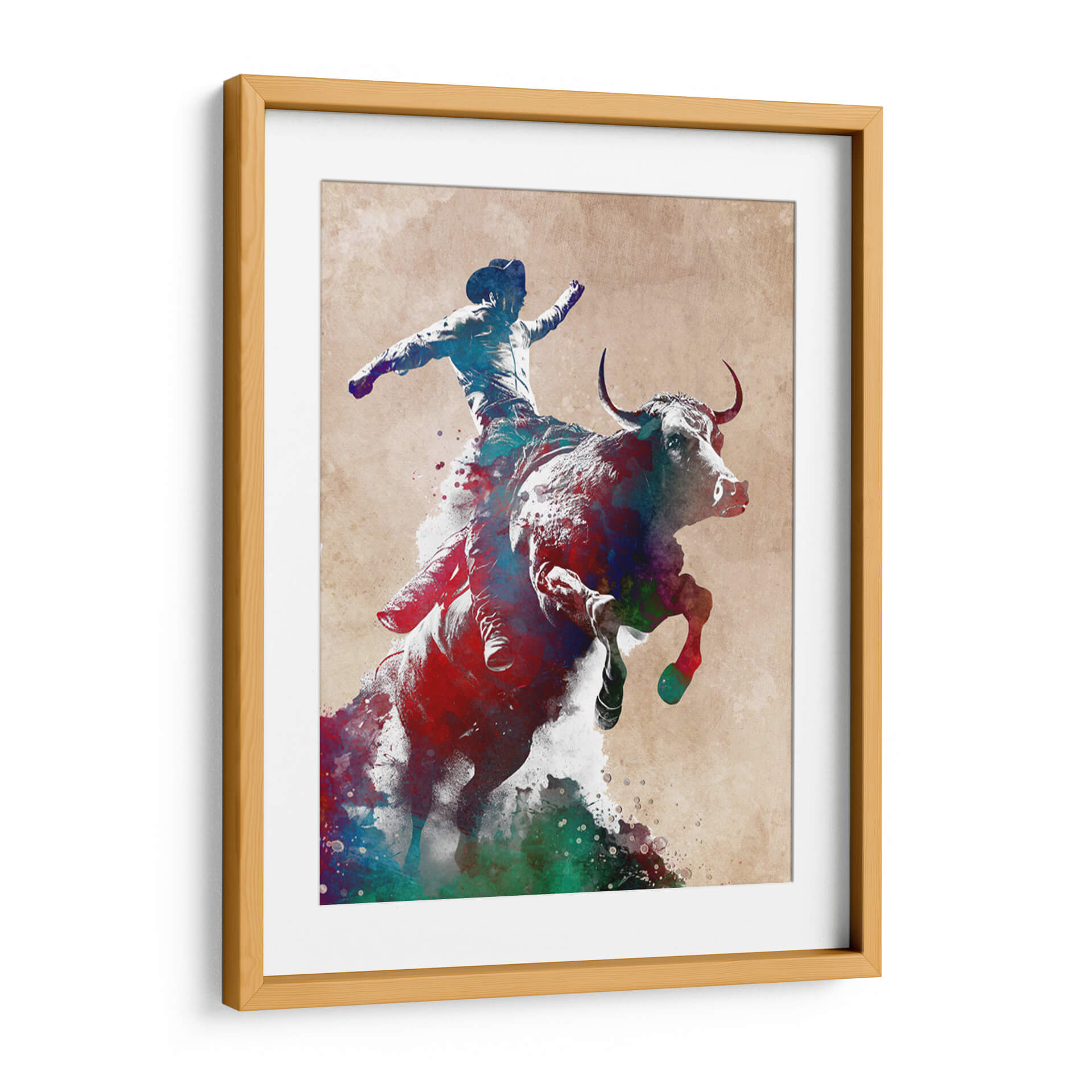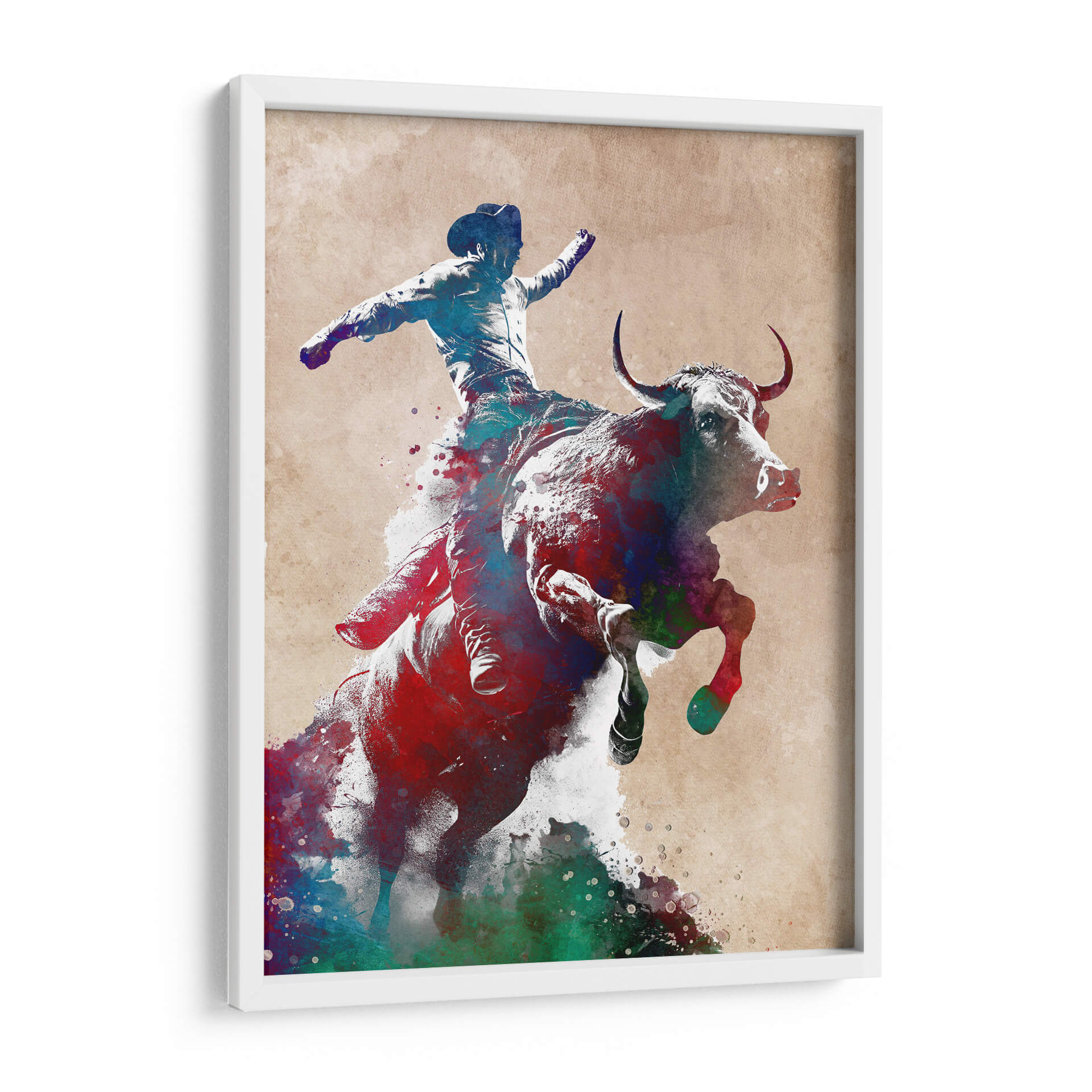 Sumérgete en la adrenalina y la pasión del rodeo con este impactante cuadro decorativo, "Rodeo Deportivo 1", de la artista Justyna Jaszke. Esta obra captura el momento cumbre de la doma de toros, donde la fuerza bruta del animal se encuentra con la destreza y el coraje del jinete. La técnica de acuarela digital utilizada aporta una dimensión vibrante y dinámica, con explosiones de color rojo intenso, azul eléctrico y verde esmeralda que contrastan magistralmente con el fondo texturizado de tonos tierra, evocando la arena del estadio y la crudeza del espectáculo. La composición dinámica, con el toro en pleno salto y el jinete aferrándose con determinación, transmite una sensación de movimiento y energía palpable. Es una pieza ideal para espacios que buscan un toque de audacia y carácter, como una sala de estar moderna, un estudio o una oficina, añadiendo un punto focal que sin duda atraerá miradas y conversaciones. Este cuadro decorativo no es solo una imagen, es una representación de la lucha, la resistencia y el espíritu indomable, perfecta para aquellos que aprecian la emoción de los deportes ecuestres y el arte contemporáneo con fuerza expresiva.
