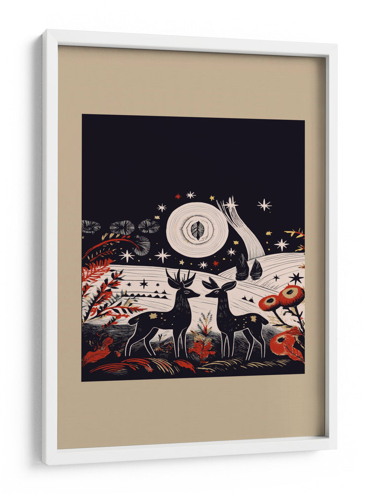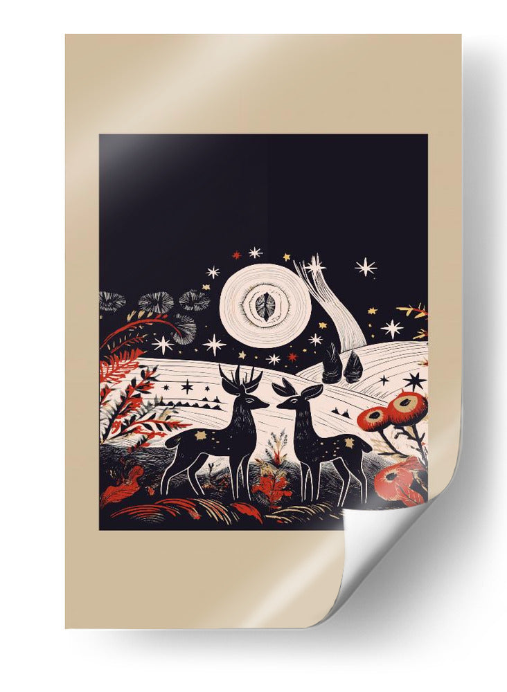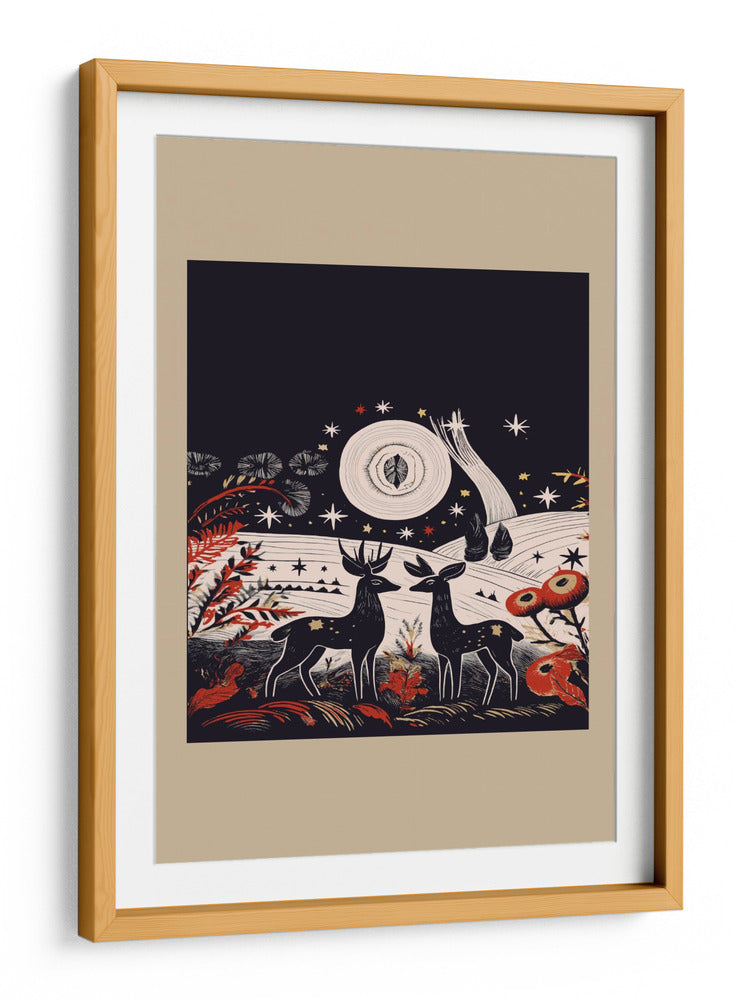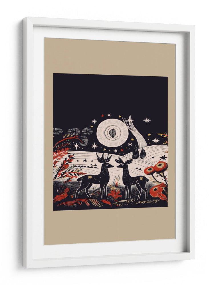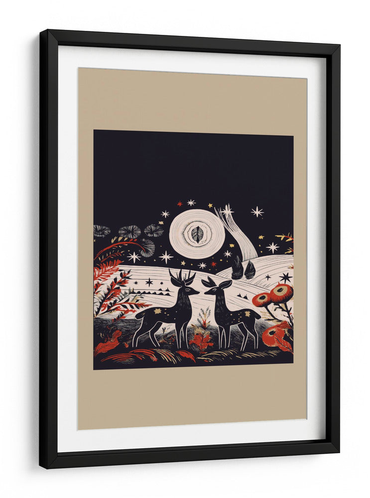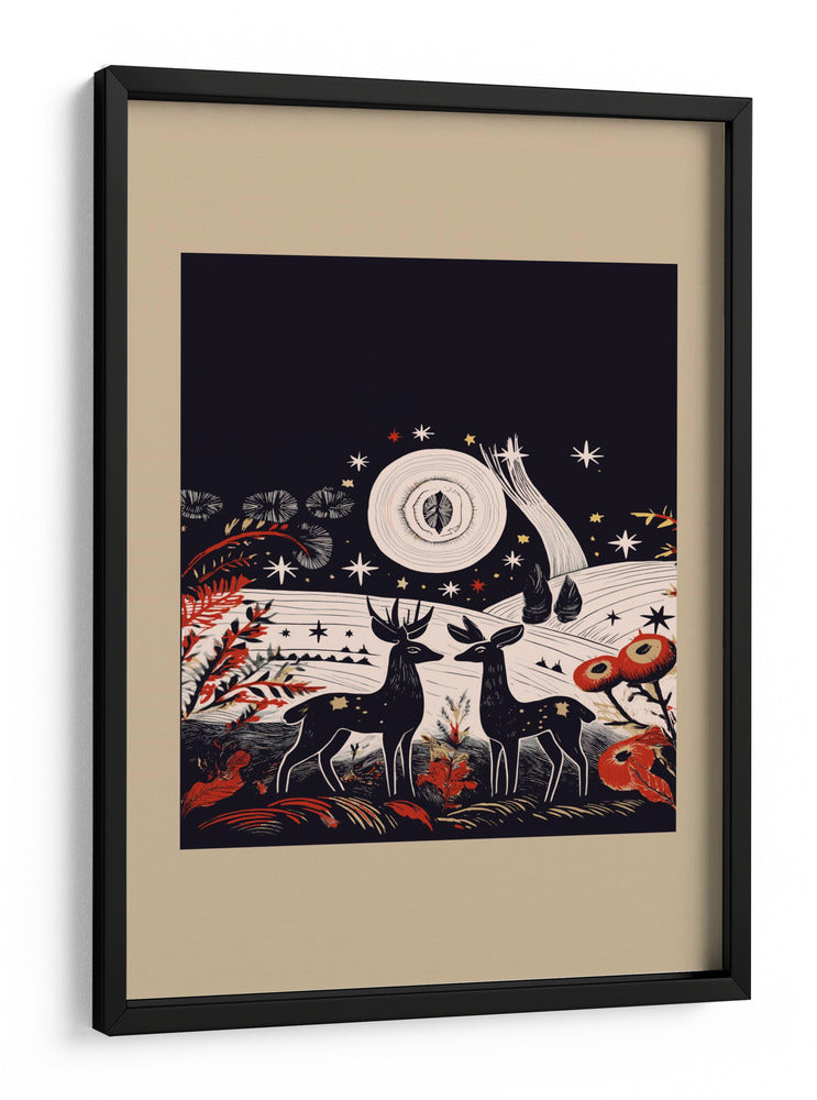 Adéntrate en un mundo de ensueño con este cautivador cuadro decorativo que evoca la magia del folclore y la calidez de las festividades. La obra presenta dos ciervos en un paisaje nocturno estrellado, rodeados de una flora estilizada en tonos tierra y rojos vibrantes. Una luna o sol estilizado domina el cielo oscuro, aportando un punto focal místico a la composición. El estilo, que recuerda a las ilustraciones de cuentos infantiles con un toque contemporáneo, combina siluetas oscuras con detalles lineales y toques de color que crean una atmósfera única y encantadora. Este lienzo decorativo es ideal para añadir un toque de misterio y serenidad a cualquier espacio, ya sea una sala de estar acogedora, un dormitorio tranquilo o un estudio creativo. Su paleta de colores terrosos y acentos vibrantes lo convierte en una pieza versátil que complementa una variedad de estilos decorativos, desde el escandinavo hasta el bohemio. Transforma tu hogar en un refugio de fantasía y estilo con esta obra de arte que celebra la conexión con la naturaleza y la imaginación. Añade esta pieza única a tu colección y deja que su encanto atemporal inspire tus días.