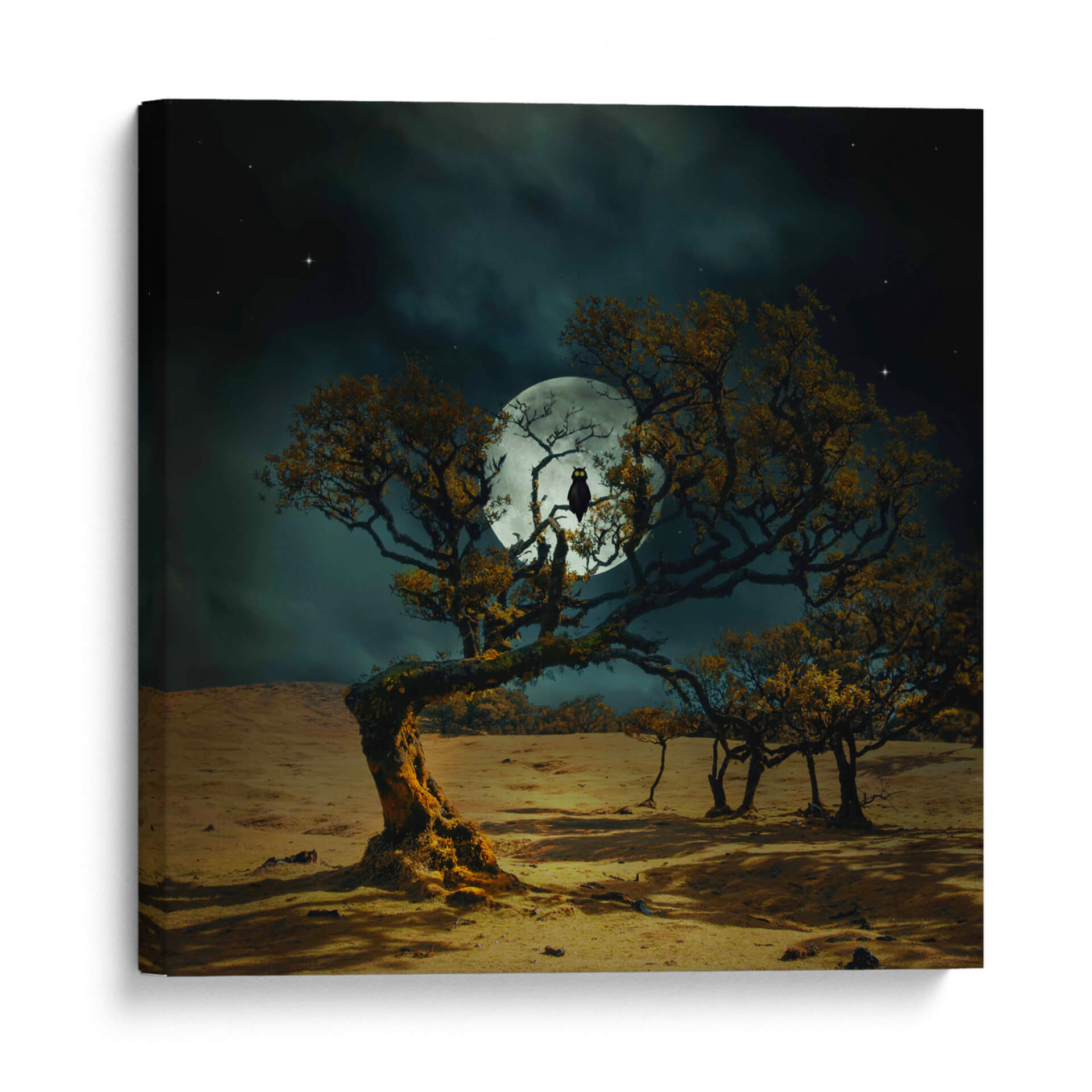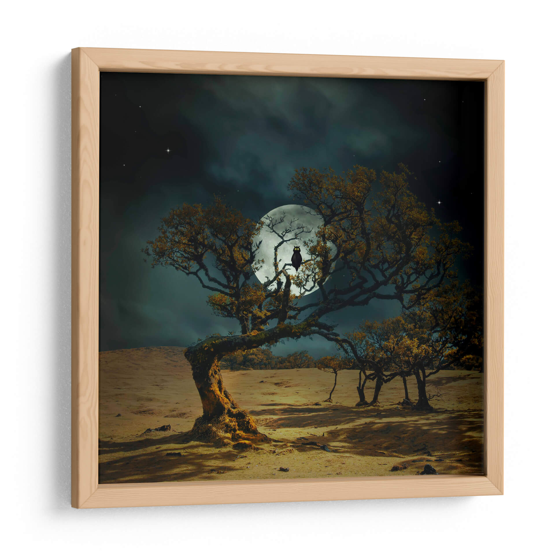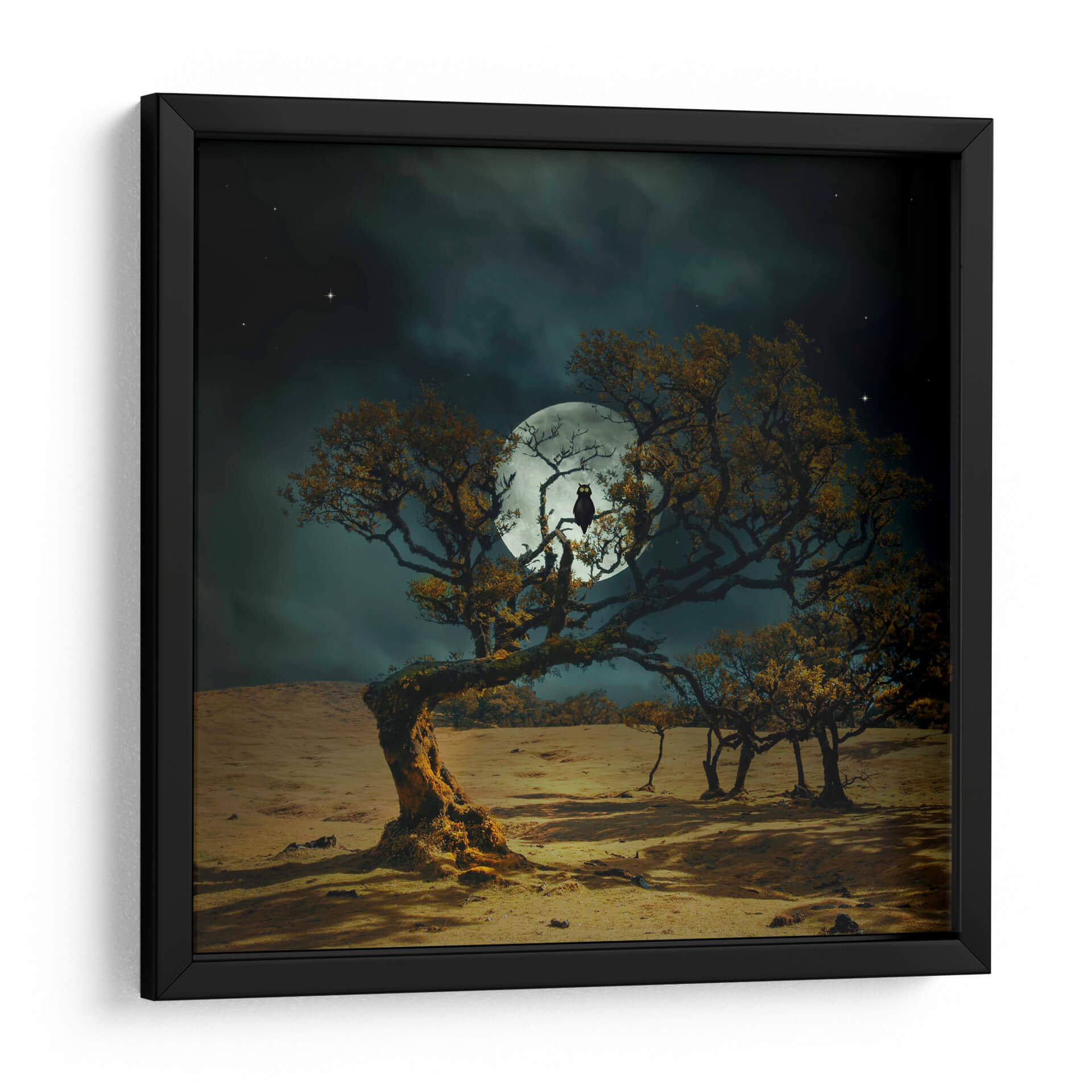 Sumérgete en la atmósfera mística de "Siempre te estoy mirando", una obra de arte digital que captura la serenidad y el misterio de una noche estrellada. La pieza presenta un árbol retorcido y antiguo, con ramas extendidas que enmarcan una luna llena imponente en el cielo oscuro y nublado. En una de las ramas, un búho solitario vigila la escena, añadiendo un toque de enigmática presencia. Los tonos ocres del paisaje árido contrastan con las sombras profundas del cielo nocturno, creando una paleta de colores terrosos y sombríos que evocan una sensación de calma contemplativa. El estilo detallado y ligeramente surrealista de Nikki Georgieva V transporta al espectador a un mundo de tranquilidad y observación silenciosa. Este cuadro decorativo es perfecto para quienes buscan añadir un elemento de naturaleza introspectiva y enigmática a su hogar u oficina, funcionando como un punto focal que invita a la reflexión y al asombro. Ideal para salas de estar, estudios o dormitorios que busquen un ambiente sosegado y con carácter.