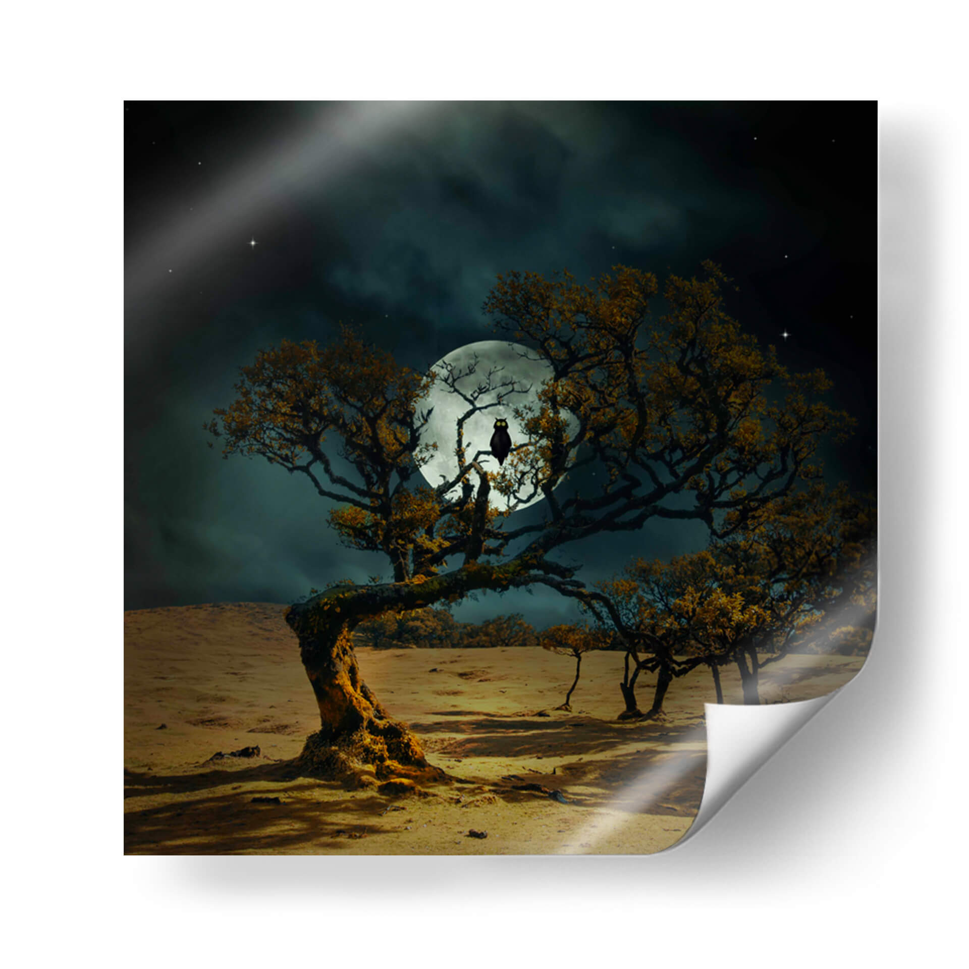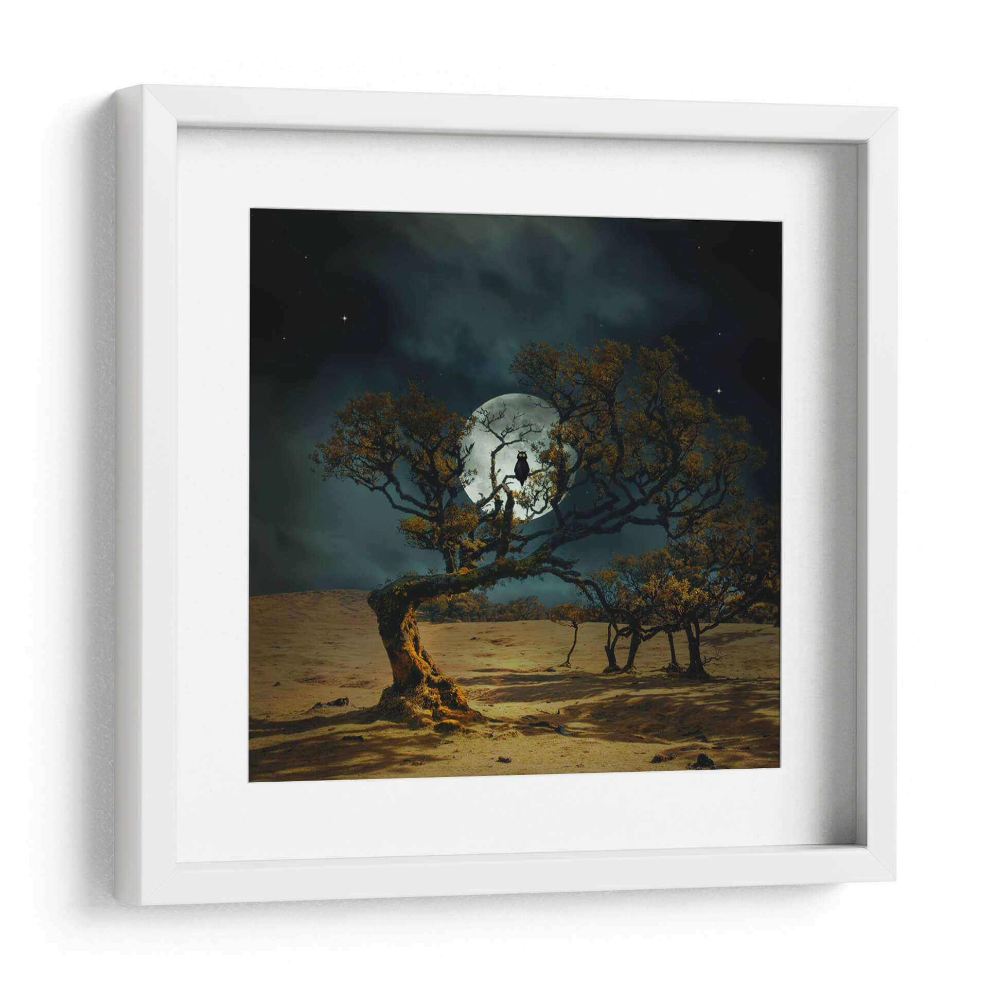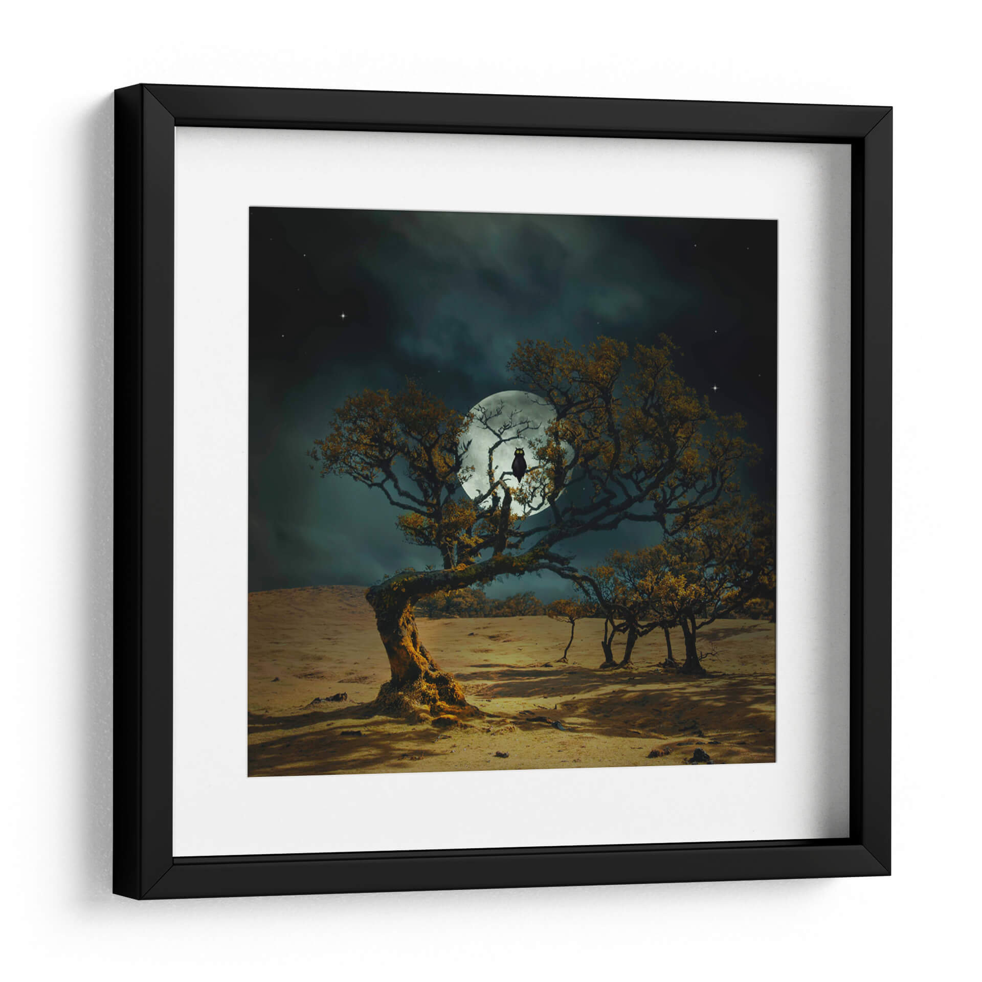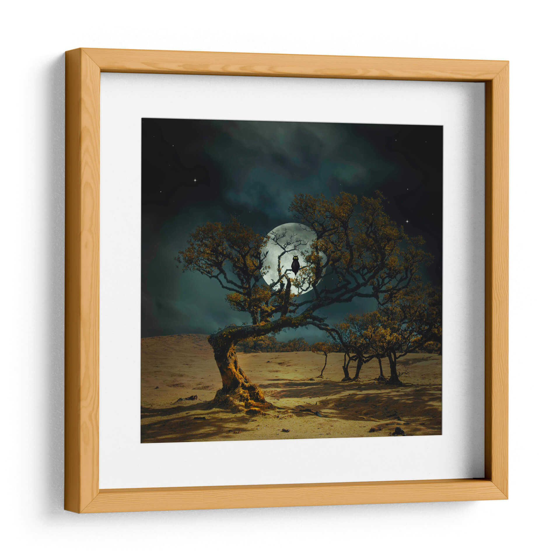 Sumérgete en la atmósfera mística de "Siempre te estoy mirando", una obra de arte digital que captura la serenidad y el misterio de una noche estrellada. La pieza presenta un árbol retorcido y antiguo, con ramas extendidas que enmarcan una luna llena imponente en el cielo oscuro y nublado. En una de las ramas, un búho solitario vigila la escena, añadiendo un toque de enigmática presencia. Los tonos ocres del paisaje árido contrastan con las sombras profundas del cielo nocturno, creando una paleta de colores terrosos y sombríos que evocan una sensación de calma contemplativa. El estilo detallado y ligeramente surrealista de Nikki Georgieva V transporta al espectador a un mundo de tranquilidad y observación silenciosa. Este cuadro decorativo es perfecto para quienes buscan añadir un elemento de naturaleza introspectiva y enigmática a su hogar u oficina, funcionando como un punto focal que invita a la reflexión y al asombro. Ideal para salas de estar, estudios o dormitorios que busquen un ambiente sosegado y con carácter.