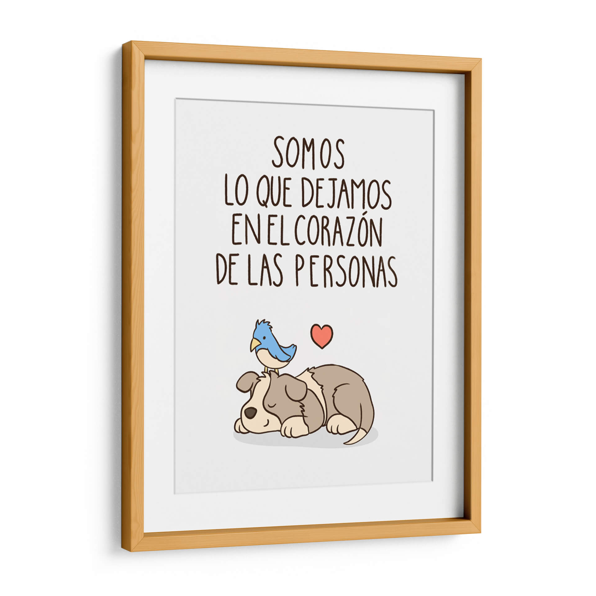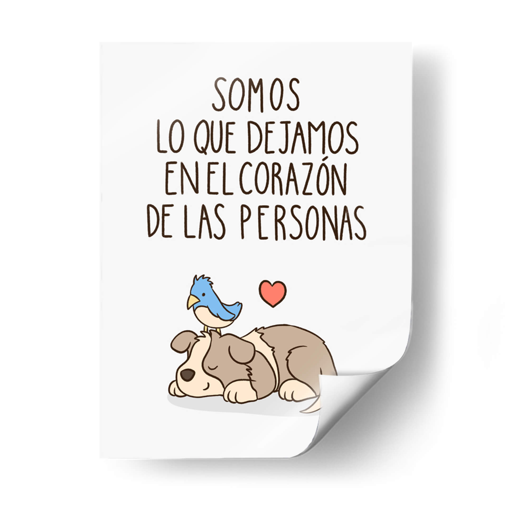 Captura la esencia de las relaciones y el impacto perdurable con este conmovedor cuadro decorativo "Somos lo que dejamos en el corazón de las personas". La obra presenta una ilustración tierna de un perro recostado, con un pequeño pájaro posado en su cabeza, y un corazón sutilmente representado. La paleta de colores se basa en tonos tierra y acentos suaves, creando una atmósfera de calidez, paz y conexión. El estilo es delicado y minimalista, con trazos sencillos que realzan el mensaje emocional de la pieza. Las letras dibujadas a mano transmiten autenticidad y cercanía, complementando la ternura de las figuras. Este cuadro es ideal para espacios que buscan infundir sentimientos de afecto, recuerdo y la importancia de las huellas que dejamos en los demás. Perfecto para añadir un toque emotivo a un salón, una entrada o incluso una oficina, recordando constantemente el valor de nuestras interacciones y el legado de amor. Es una pieza que invita a la reflexión y embellece cualquier ambiente con su mensaje positivo y su diseño encantador, haciendo que cada día sea un recordatorio de la profunda conexión humana.