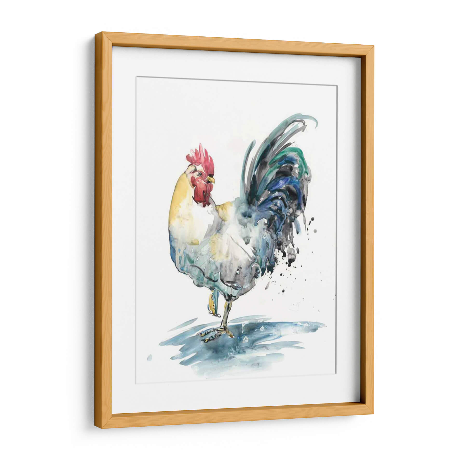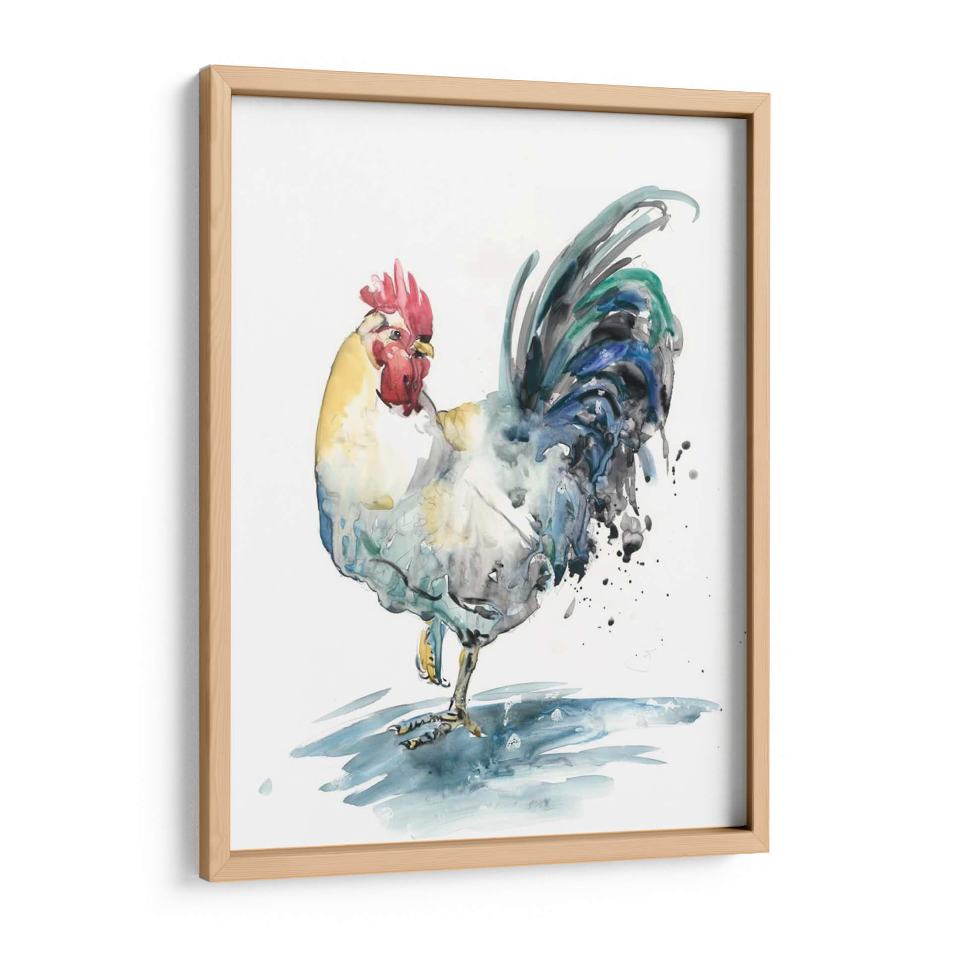 Captura la esencia de la vitalidad y el encanto rústico con "Splash De Gallo I", una obra de arte contemporáneo que irradia energía y personalidad. La artista Melissa Wang nos presenta un gallo en una pose dinámica, capturado con trazos sueltos y expresivos que evocan la técnica de la acuarela. La paleta de colores es vibrante y audaz, con tonos amarillos cálidos en el cuerpo, un rojo intenso en la cresta y el cuello, y un despliegue fascinante de azules, verdes y negros en la cola, que se disuelven en salpicaduras dinámicas. Esta composición enérgica y el uso magistral del color hacen de este cuadro decorativo una pieza central ideal para espacios que buscan un toque de carácter y originalidad. Su estilo, que combina la figuración con la abstracción, permite que se integre en diversas decoraciones, desde un estilo rústico y campestre hasta un entorno moderno y ecléctico. Imagina cómo este gallo, lleno de vida y movimiento, podría transformar tu cocina, sala de estar o incluso una oficina, aportando un punto focal artístico y una atmósfera de audacia y frescura. "Splash De Gallo I" no es solo una imagen, es una declaración de estilo que atraerá miradas y conversaciones.