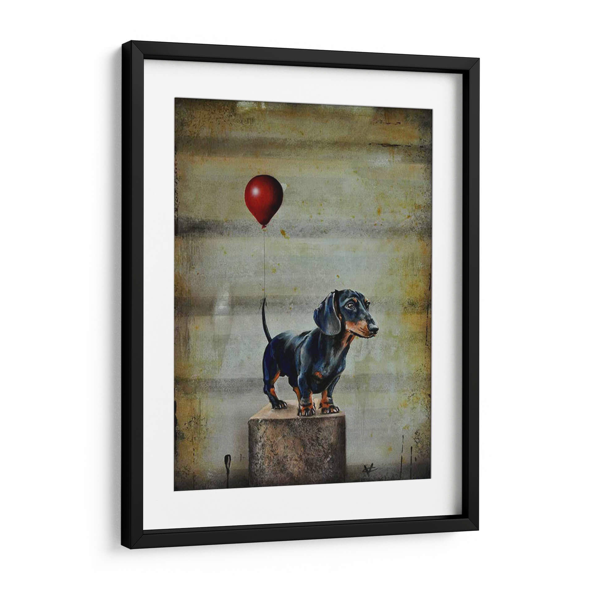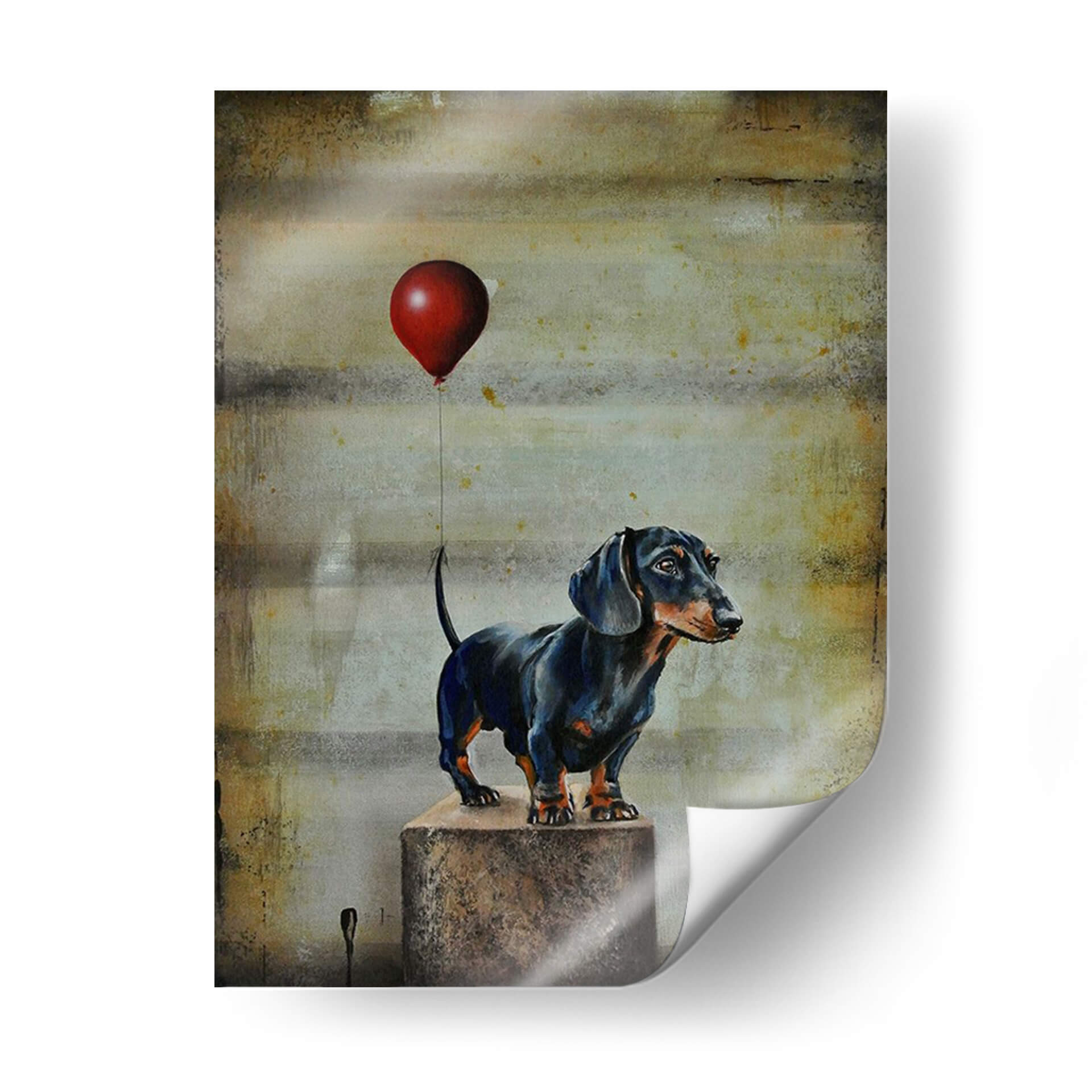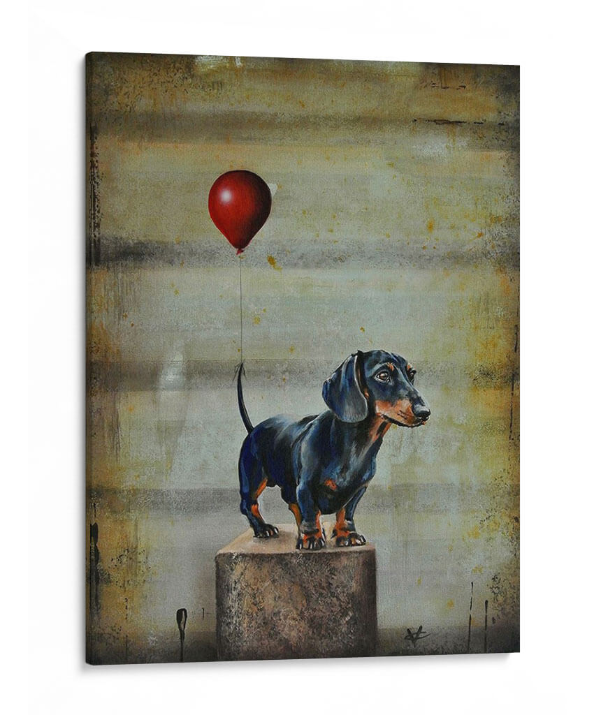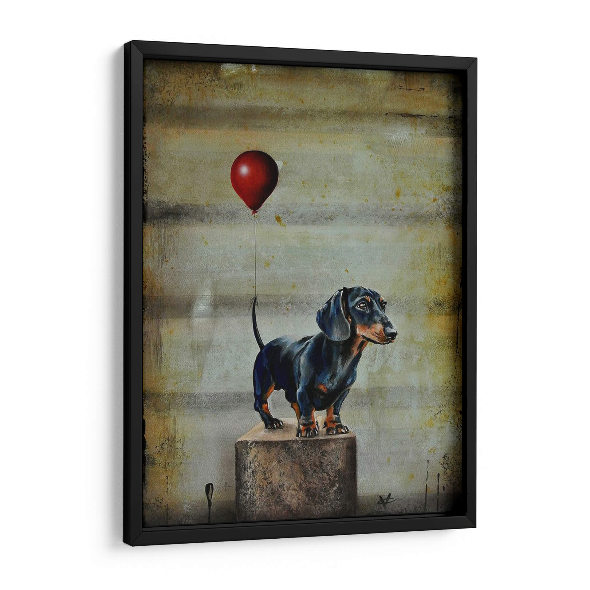 Este cautivador cuadro decorativo, 'Stanelys Globo' de Victoria Coleman, presenta un dachshund de pelaje negro y fuego de pie sobre un pedestal de madera rústica, con un globo rojo brillante flotando a su lado. La obra se caracteriza por su atmósfera melancólica y onírica, acentuada por una paleta de colores terrosos y texturas desgastadas que evocan un estilo vintage y artístico. El contraste entre la inocencia del globo y la firmeza del perro crea una narrativa visual intrigante que invita a la reflexión. Ideal para quienes buscan añadir un toque de originalidad y emoción a su hogar u oficina, este cuadro es perfecto para salas de estar modernas, estudios o incluso dormitorios, aportando un punto de conversación único y una dosis de encanto peculiar. La composición centra la atención en el personaje principal, mientras que el fondo texturizado proporciona profundidad y carácter. Descubre la magia de este arte contemporáneo que fusiona realismo con un toque surrealista, perfecto para decorar espacios que buscan expresar individualidad y un estilo distintivo.