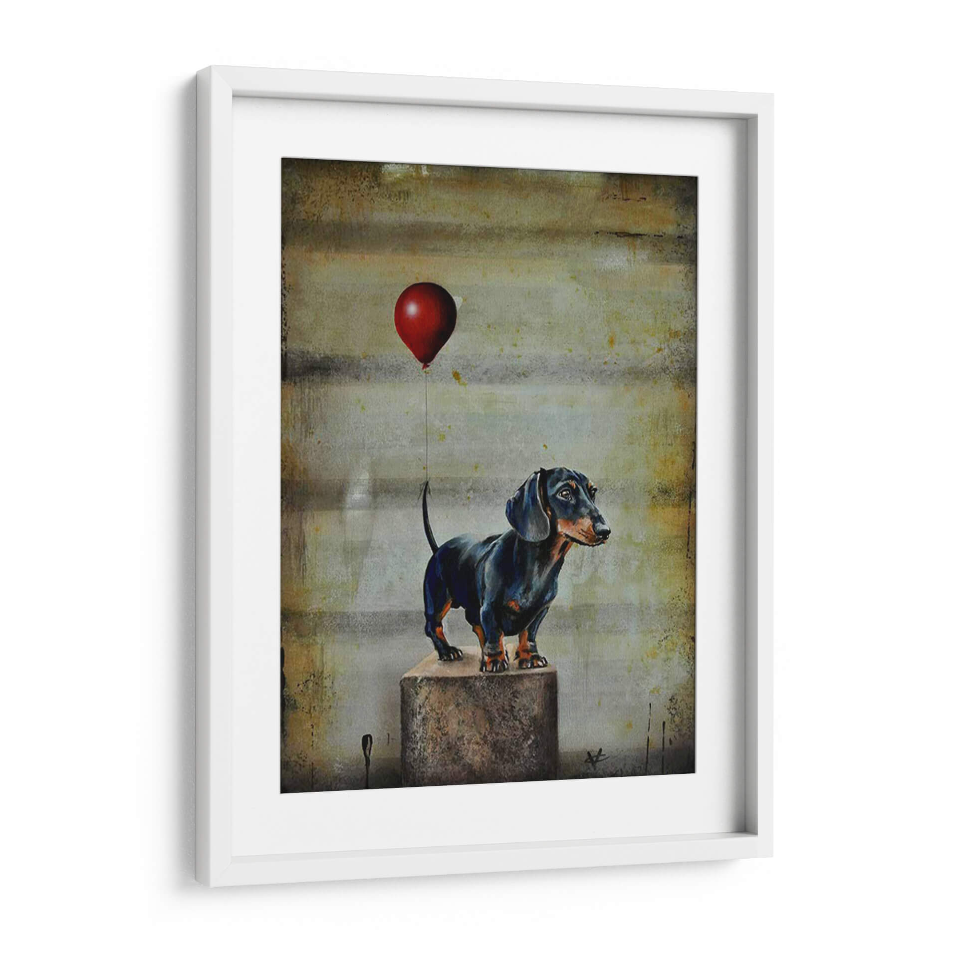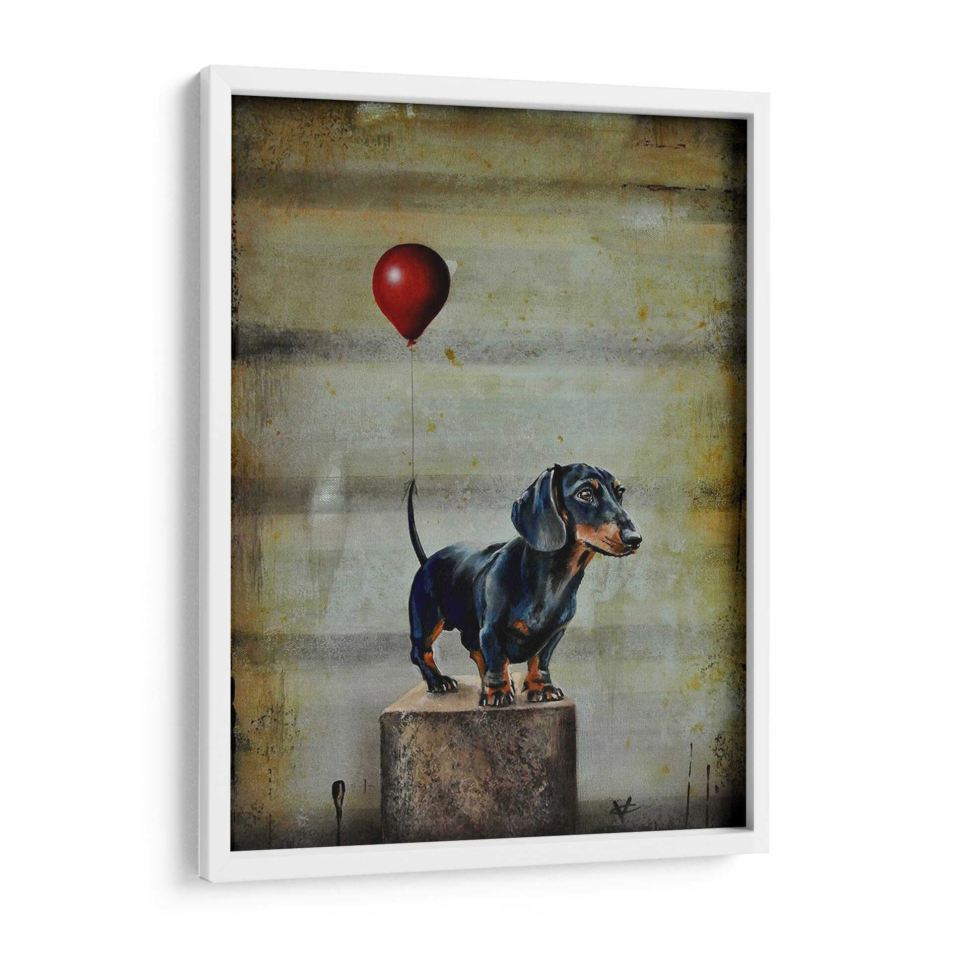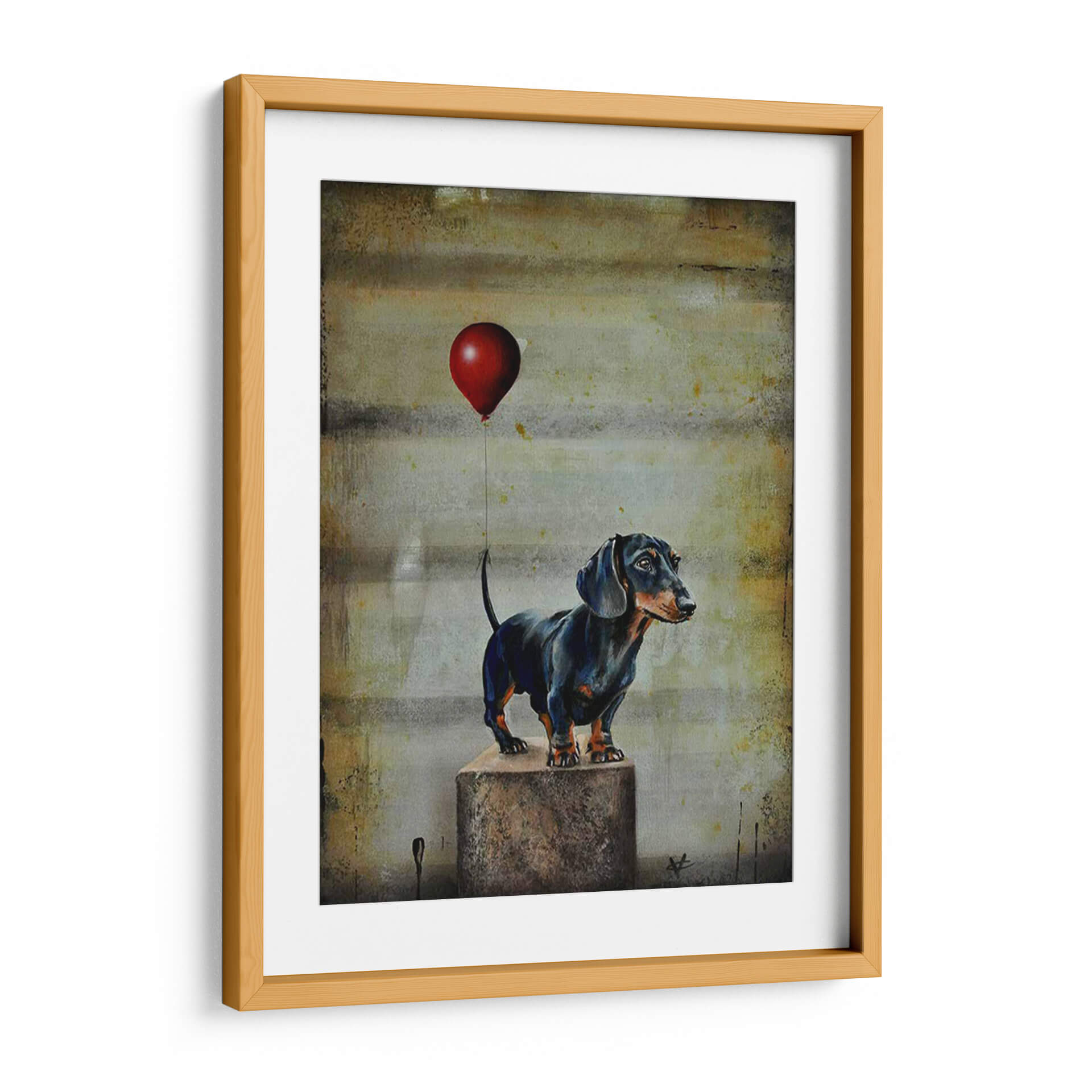 Este cautivador cuadro decorativo, 'Stanelys Globo' de Victoria Coleman, presenta un dachshund de pelaje negro y fuego de pie sobre un pedestal de madera rústica, con un globo rojo brillante flotando a su lado. La obra se caracteriza por su atmósfera melancólica y onírica, acentuada por una paleta de colores terrosos y texturas desgastadas que evocan un estilo vintage y artístico. El contraste entre la inocencia del globo y la firmeza del perro crea una narrativa visual intrigante que invita a la reflexión. Ideal para quienes buscan añadir un toque de originalidad y emoción a su hogar u oficina, este cuadro es perfecto para salas de estar modernas, estudios o incluso dormitorios, aportando un punto de conversación único y una dosis de encanto peculiar. La composición centra la atención en el personaje principal, mientras que el fondo texturizado proporciona profundidad y carácter. Descubre la magia de este arte contemporáneo que fusiona realismo con un toque surrealista, perfecto para decorar espacios que buscan expresar individualidad y un estilo distintivo.