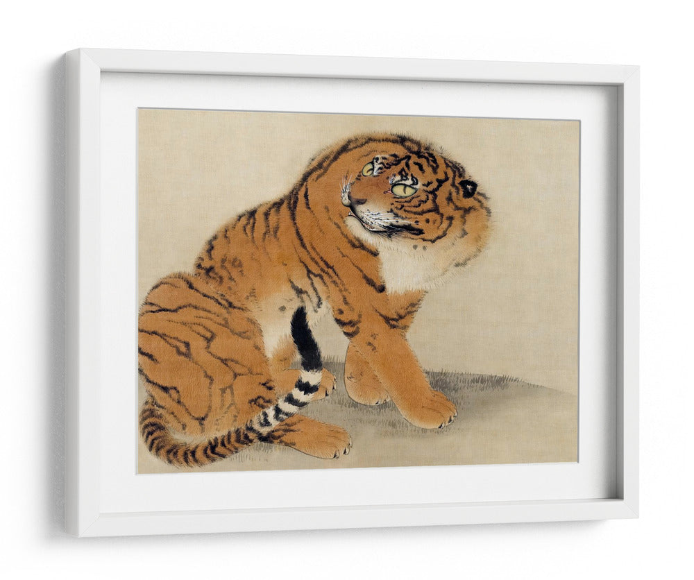 Inmortaliza la majestuosidad de la naturaleza con este cautivador cuadro decorativo de un tigre sentado, inspirado en la obra del icónico artista Maruyama Ōkyo. La pieza, titulada "Tigre Sentado (1777)", captura la esencia de este magnífico felino en una pose serena pero poderosa. La paleta de colores se centra en tonos cálidos y terrosos, con el naranja vibrante del pelaje del tigre contrastando sutilmente contra un fondo neutro y texturizado, evocando una sensación de calma y elegancia atemporal. La delicada pincelada y la atención al detalle en la expresión del tigre, sus ojos penetrantes y las marcas distintivas de su pelaje, le otorgan una profundidad y un realismo sorprendentes, a pesar de su estilo artístico que combina la tradición oriental con un toque contemporáneo. Este cuadro decorativo es perfecto para añadir un punto focal de carácter y sofisticación a cualquier estancia, desde una sala de estar moderna hasta un estudio o una oficina que busque infundir un aura de fuerza y tranquilidad. Su diseño atemporal y su temática universal lo convierten en una elección ideal para quienes aprecian el arte con alma y desean crear un ambiente inspirador en su hogar.