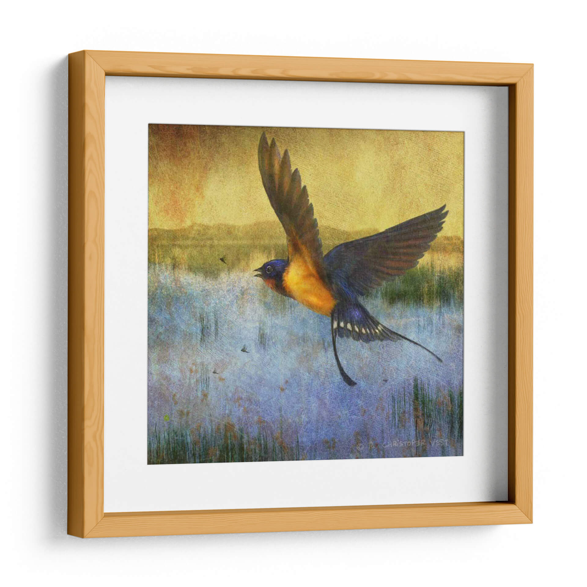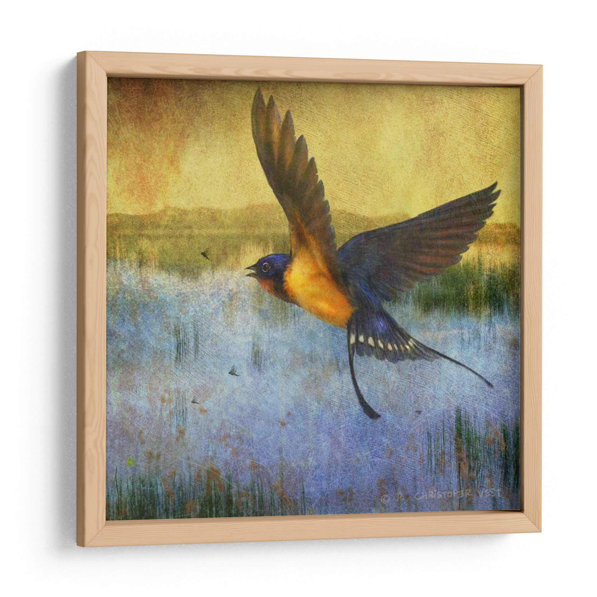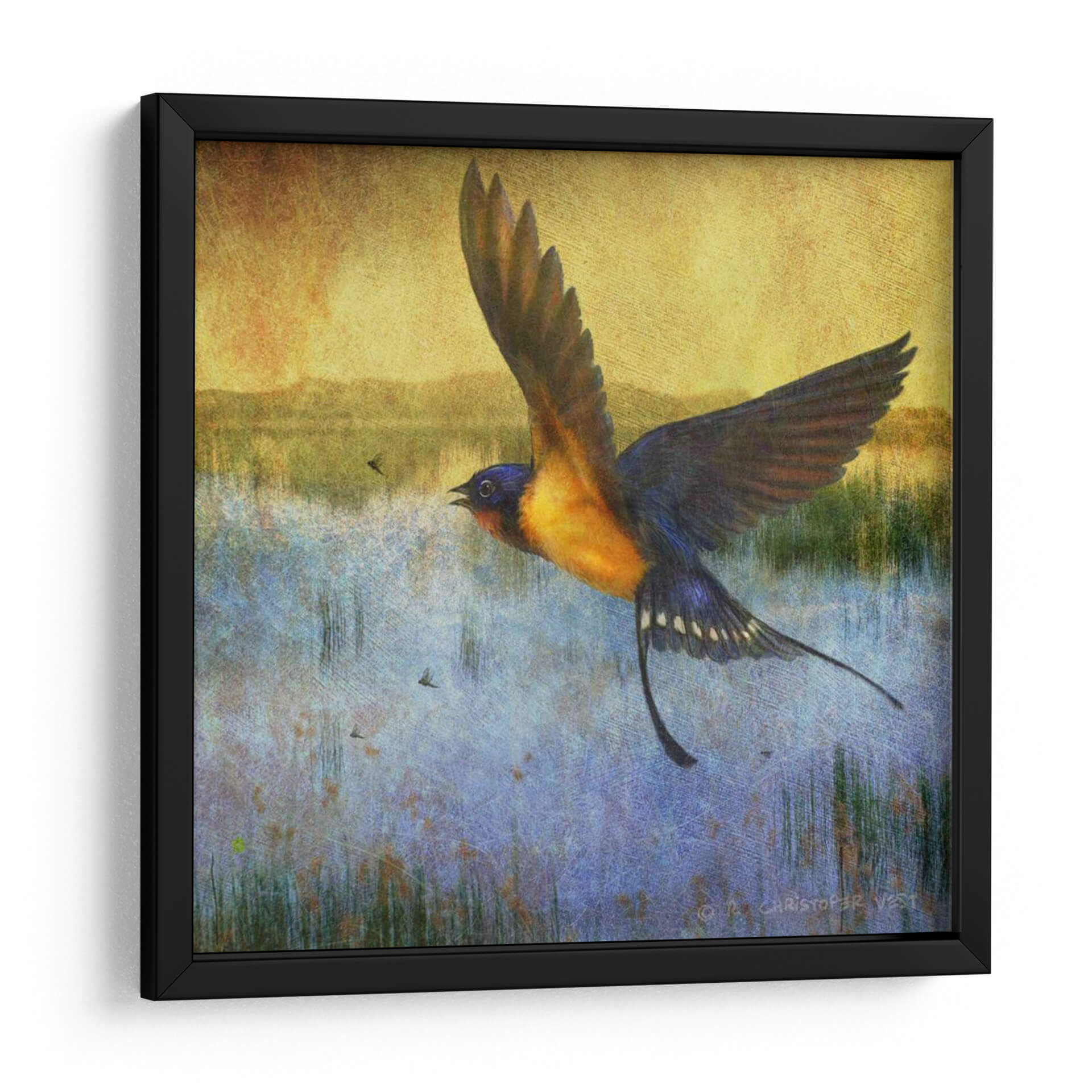 Capture la esencia de la libertad y la naturaleza con este evocador cuadro decorativo de una golondrina en pleno vuelo. La obra "Trago de Granero" de Chris Vest te transporta a un paisaje sereno, donde los tonos dorados y ocres del atardecer se funden con el azul vibrante del agua y el verde sutil de la vegetación. La figura del ave, representada con un detalle exquisito y una paleta de colores cálidos en su pecho anaranjado y azul profundo en sus alas, se despliega majestuosamente contra un fondo que evoca la textura y la atmósfera de una acuarela o un grabado antiguo. La composición dinámica del pájaro, con las alas extendidas y las plumas detalladas, transmite una sensación de movimiento y ligereza, invitando a la contemplación de la belleza efímera del mundo natural. Este cuadro decorativo es perfecto para añadir un toque de elegancia orgánica y tranquilidad a cualquier espacio, ya sea una sala de estar, un dormitorio o una oficina. Su estilo artístico, que mezcla realismo detallado con un toque impresionista en el fondo, lo convierte en una pieza versátil que complementa tanto decoraciones contemporáneas como rústicas. Descubre la magia de la naturaleza en tu hogar con esta impresionante obra de arte.