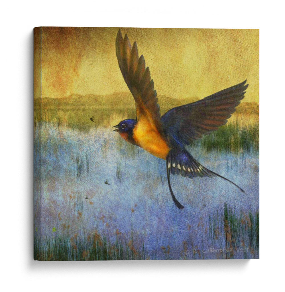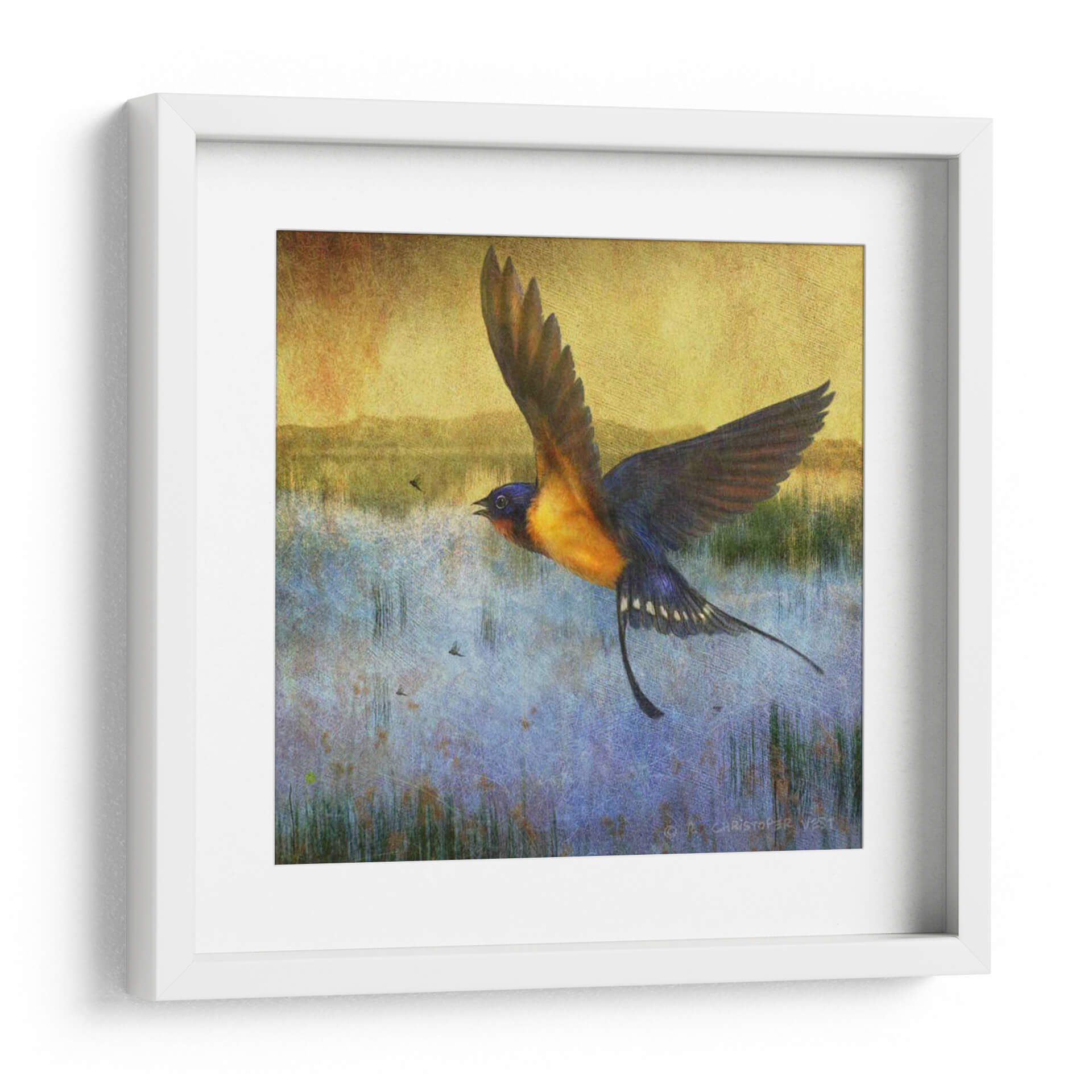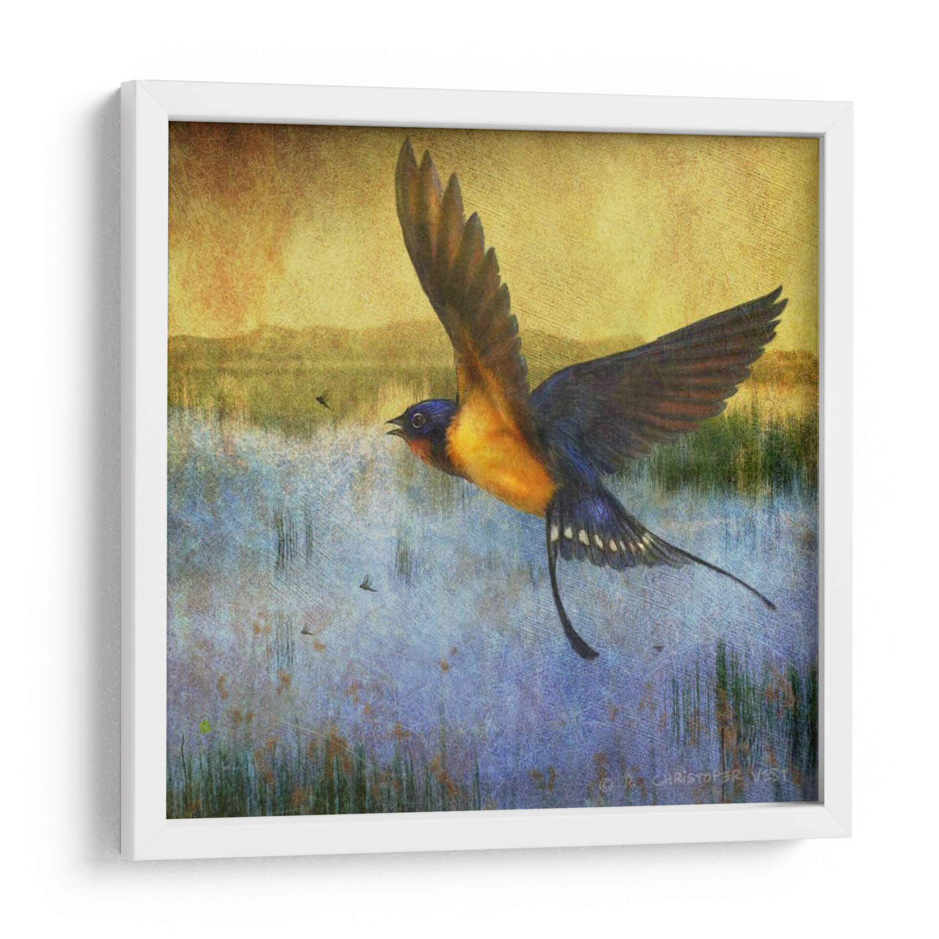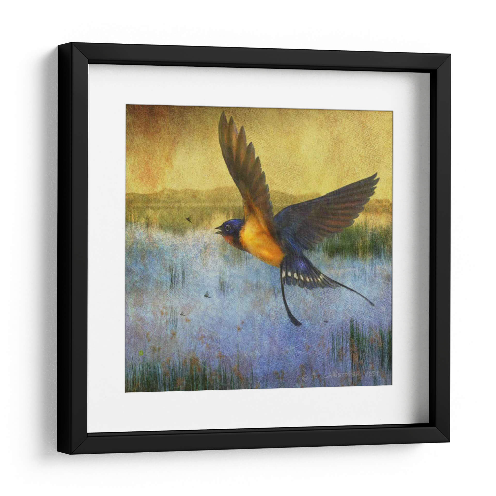 Capture la esencia de la libertad y la naturaleza con este evocador cuadro decorativo de una golondrina en pleno vuelo. La obra "Trago de Granero" de Chris Vest te transporta a un paisaje sereno, donde los tonos dorados y ocres del atardecer se funden con el azul vibrante del agua y el verde sutil de la vegetación. La figura del ave, representada con un detalle exquisito y una paleta de colores cálidos en su pecho anaranjado y azul profundo en sus alas, se despliega majestuosamente contra un fondo que evoca la textura y la atmósfera de una acuarela o un grabado antiguo. La composición dinámica del pájaro, con las alas extendidas y las plumas detalladas, transmite una sensación de movimiento y ligereza, invitando a la contemplación de la belleza efímera del mundo natural. Este cuadro decorativo es perfecto para añadir un toque de elegancia orgánica y tranquilidad a cualquier espacio, ya sea una sala de estar, un dormitorio o una oficina. Su estilo artístico, que mezcla realismo detallado con un toque impresionista en el fondo, lo convierte en una pieza versátil que complementa tanto decoraciones contemporáneas como rústicas. Descubre la magia de la naturaleza en tu hogar con esta impresionante obra de arte.