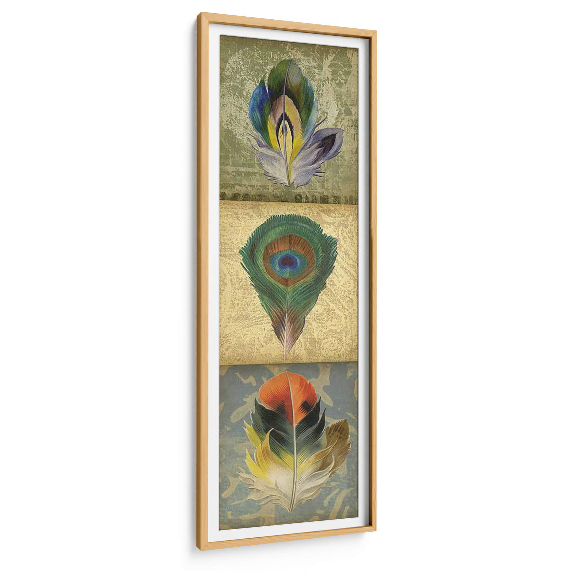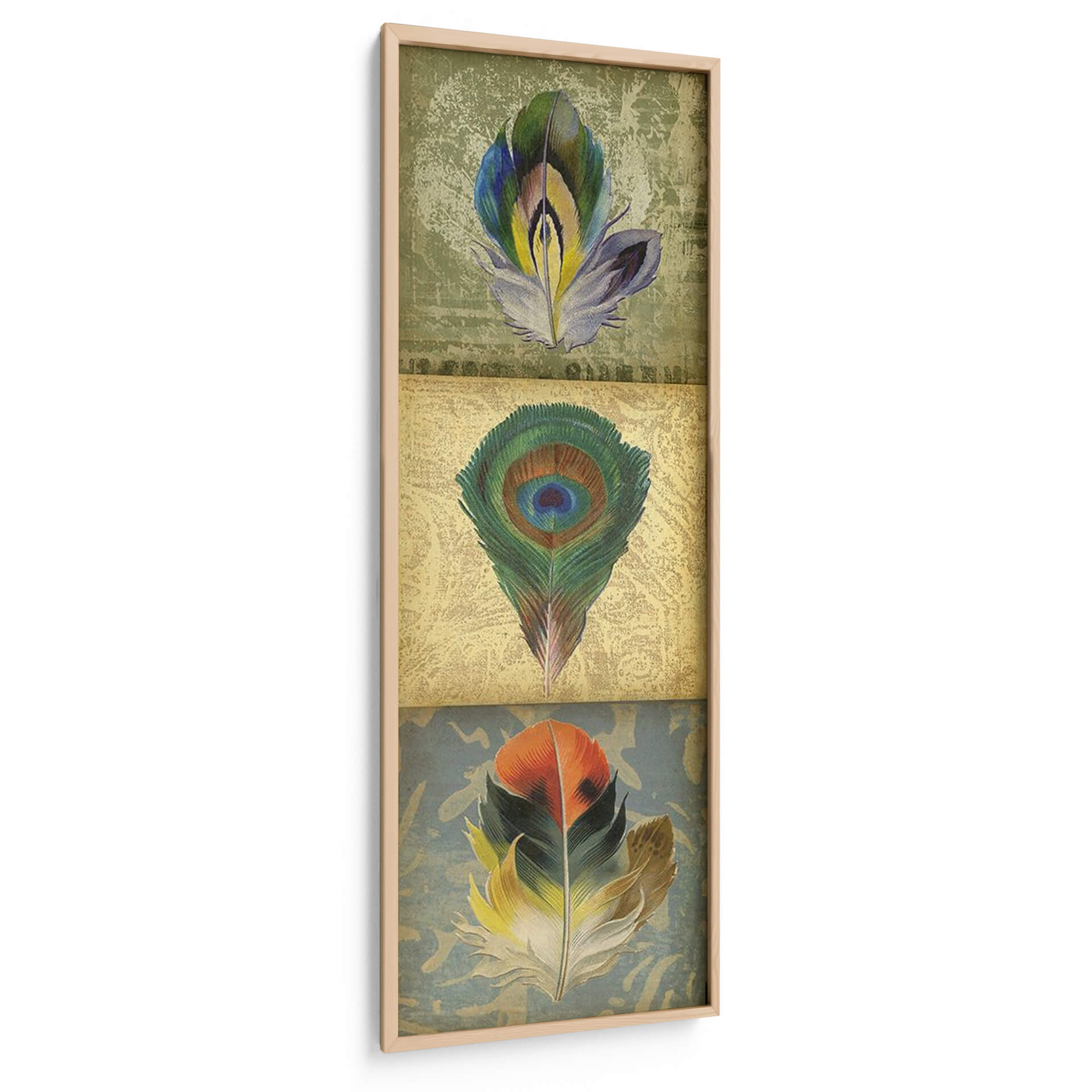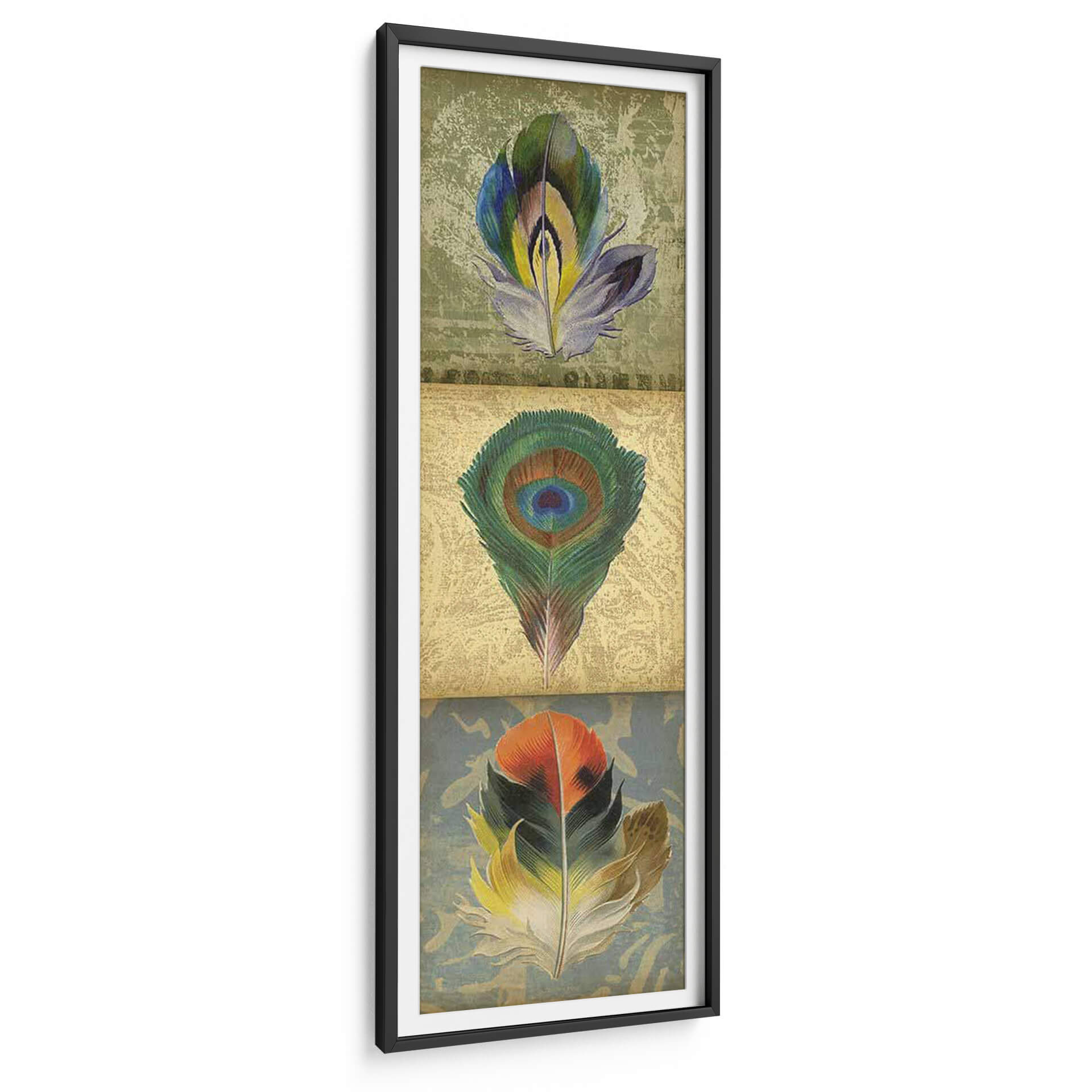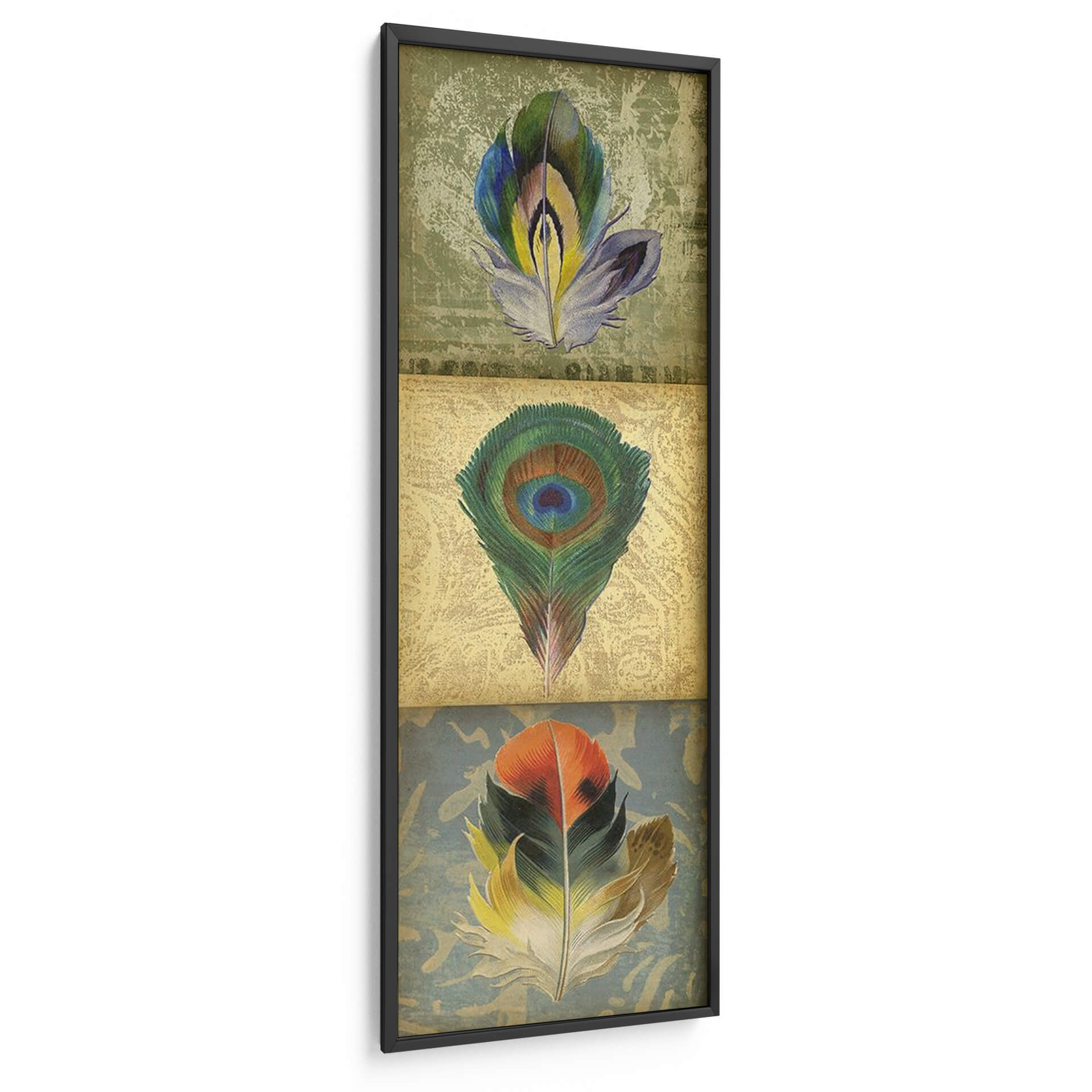 Embellezca su hogar u oficina con el cautivador 'Tríptico De Plumas 2-Up Ii' de Jennifer Goldberger, una obra de arte que evoca la belleza delicada y la diversidad de la naturaleza. Este tríptico presenta tres plumas estilizadas, cada una con una paleta de colores única y vibrante, dispuestas sobre fondos texturizados que añaden profundidad y carácter. La pluma central, un icónico ojo de pavo real, despliega sus intrincados verdes y azules, mientras que la pluma superior exhibe tonos morados, verdes y amarillos, y la inferior cautiva con naranjas y verdes intensos. La composición vertical y la técnica detallada de Goldberger dan vida a estas formas orgánicas, creando una pieza que transmite serenidad, elegancia y un toque de sofisticación natural. Ideal para espacios que buscan un acento de color y un guiño a la riqueza natural, este cuadro decorativo es perfecto para salas de estar, dormitorios o pasillos, aportando un aire de refinamiento y calma. Su estilo contemporáneo con toques vintage lo hace versátil, complementando una variedad de decoraciones, desde las más modernas hasta las clásicas, convirtiéndose en un punto focal de conversación y admiración.