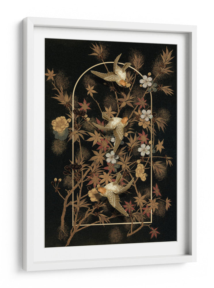 Sumérgete en la serenidad del "Un collage de otoño japonés", una obra de arte cautivadora que evoca la delicadeza de la naturaleza en su máxima expresión. Tres aves, representadas con exquisito detalle, revolotean entre ramas cargadas de hojas de arce en tonos ocres y rojizos, salpicadas por delicadas flores blancas y amarillas. El fondo oscuro y texturizado, con sutiles toques dorados, realza la elegancia y el misterio de la escena, creando un contraste impactante que atrapa la mirada. La composición, enmarcada por un sutil arco dorado, dirige la atención hacia el movimiento armonioso de las aves y la riqueza cromática del otoño. Esta pieza es ideal para añadir un toque de sofisticación y calma a cualquier espacio, ya sea una sala de estar moderna, un dormitorio acogedor o una oficina que busca inspiración. El estilo, que fusiona elementos del arte japonés tradicional con una sensibilidad contemporánea, hace de este cuadro decorativo una pieza única. Los tonos tierra, dorados y los sutiles toques de color invitan a la contemplación y la conexión con la naturaleza. Si buscas arte de pared que transmita paz y belleza, este collage te transportará a un jardín japonés en plena estación otoñal.