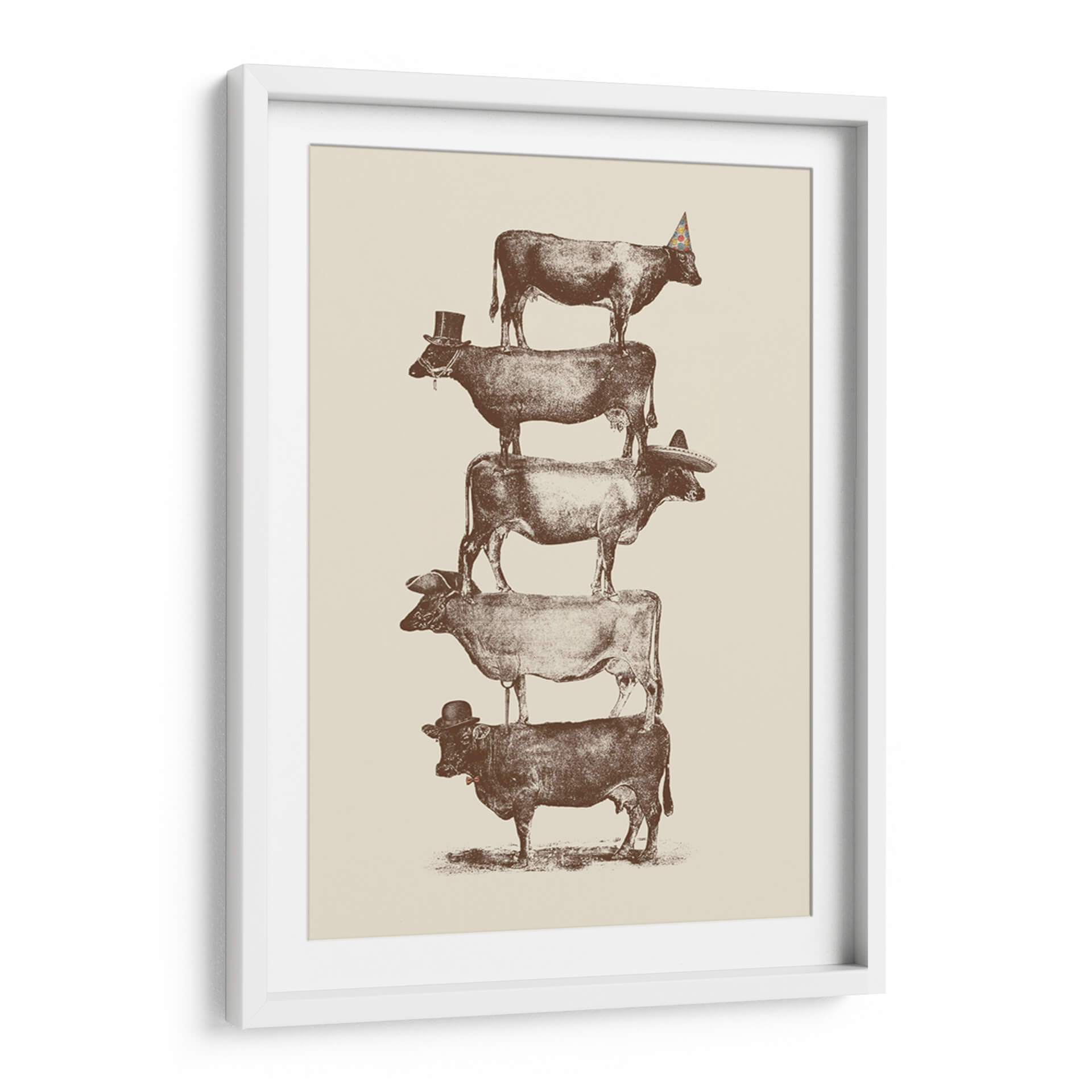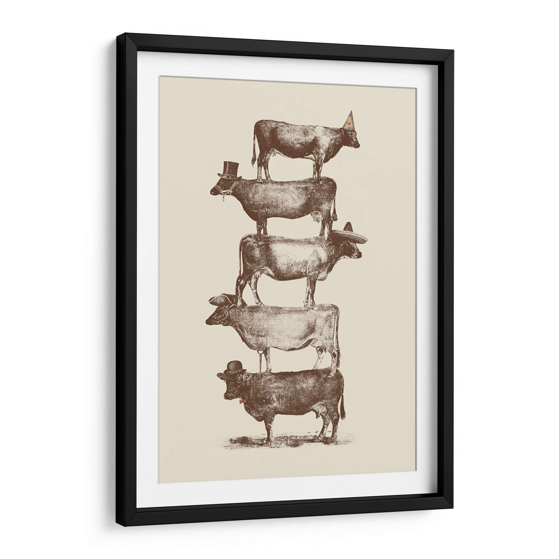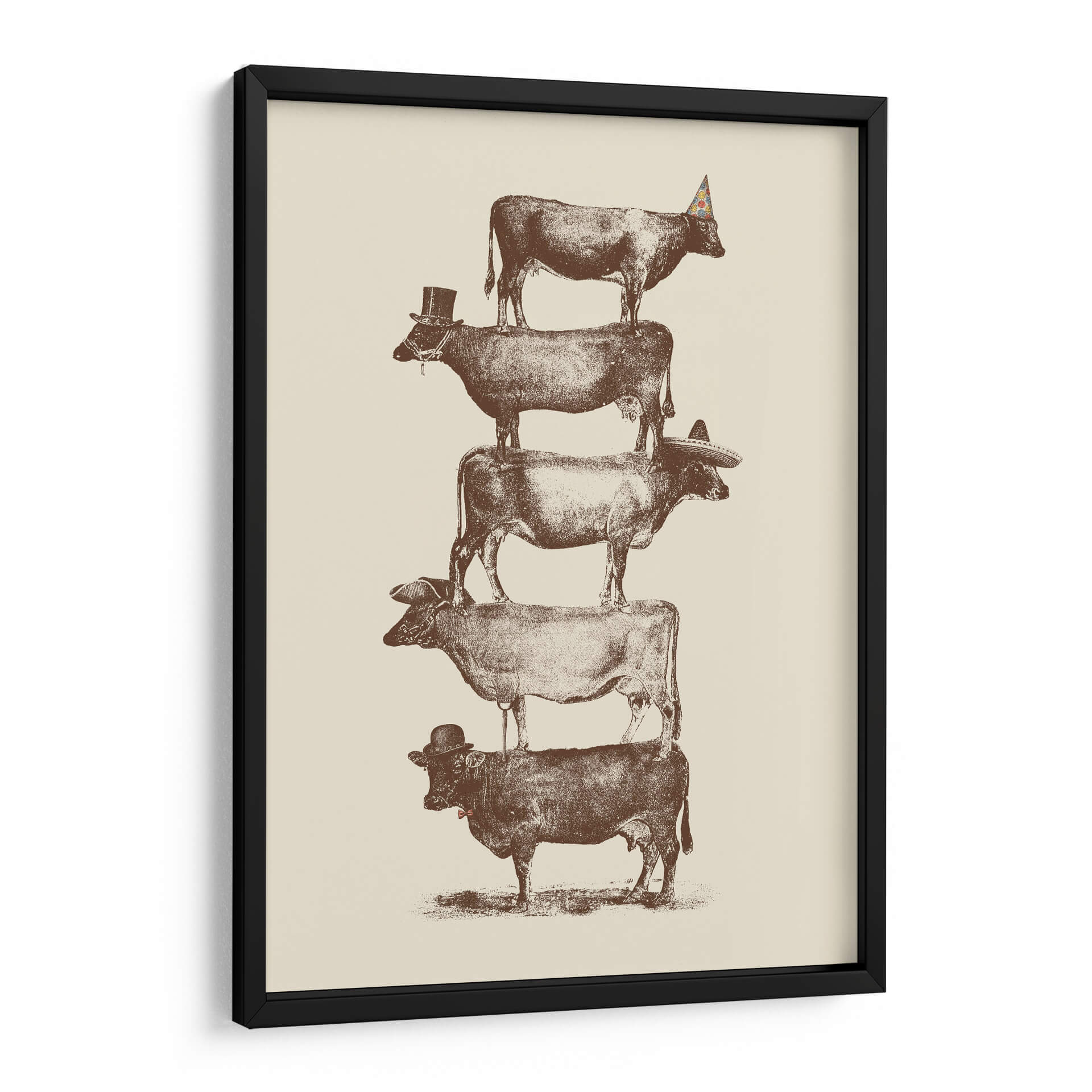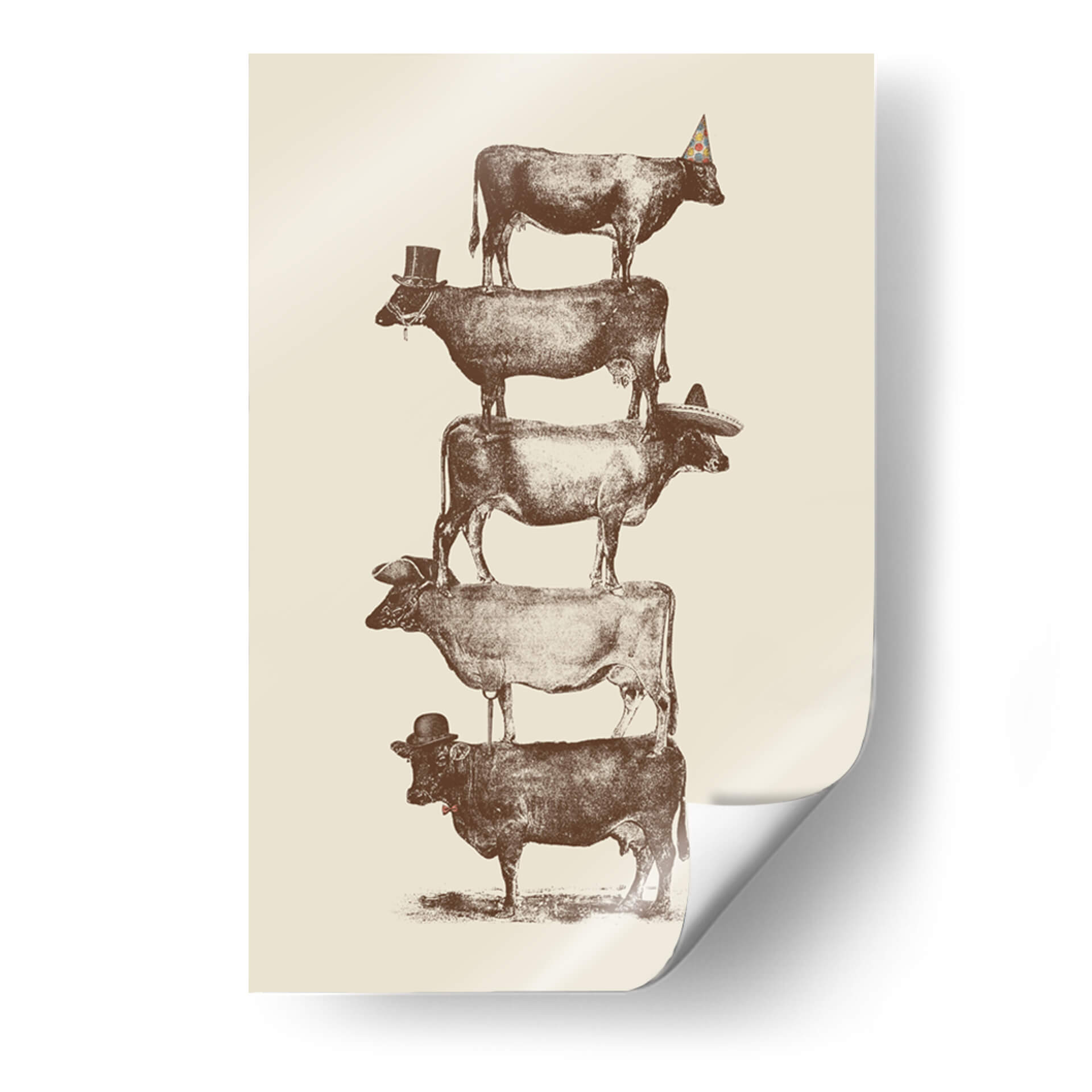Transforma tu espacio con el enigmático cuadro decorativo "Vaca, Vaca, Nueces" del artista Florent Bodart. Esta obra maestra presenta una audaz composición vertical de vacas apiladas, cada una adornada con un accesorio distintivo: un sombrero de copa, un sombrero mexicano, un gorro de fiesta y un bombín. La paleta de colores sepia y beige evoca una sensación de nostalgia y calidez, mientras que el estilo detallado, que recuerda a ilustraciones antiguas, añade un toque de sofisticación y humor. La pieza invita a la reflexión sobre el equilibrio, la perseverancia y la individualidad, a pesar de la aparente uniformidad del tema. Su diseño único y juguetón la convierte en una pieza de conversación ideal para cualquier sala de estar, estudio u oficina. Este cuadro decorativo es perfecto para quienes buscan añadir un toque de originalidad y carácter a su decoración, rompiendo con lo convencional y aportando una atmósfera de diversión inteligente. Ideal para amantes del arte contemporáneo con un giro irónico y para aquellos que aprecian las representaciones únicas de la vida cotidiana.