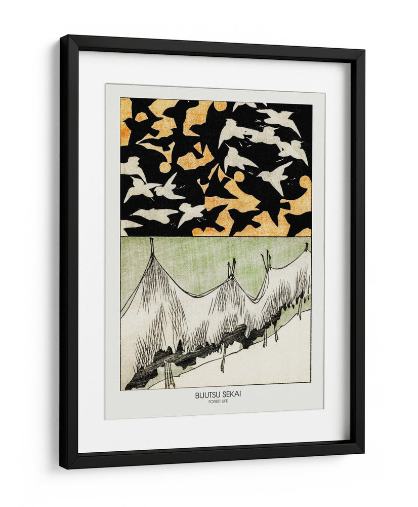 Sumérgete en la serena belleza de "Vida en el Bosque", una cautivadora obra de arte que evoca la armonía de la naturaleza. Este cuadro decorativo presenta una escena dividida en dos, donde un cielo vibrante en tonos ocres y negros sirve de telón de fondo a una bandada de pájaros blancos en pleno vuelo, creando una sensación de movimiento y libertad. La parte inferior de la obra se adentra en un paisaje boscoso estilizado, con delicadas pinceladas verdes y blancas que sugieren la exuberancia y la frescura del entorno. La composición, inspirada en el arte japonés tradicional, combina elementos figurativos con un toque abstracto, invitando a la contemplación. Los colores contrastantes y las formas dinámicas generan una atmósfera de paz y vitalidad, perfecta para transformar cualquier espacio. Ideal para añadir un toque de sofisticación natural a tu sala de estar, dormitorio u oficina, este cuadro decorativo es una ventana a la tranquilidad del mundo natural. "Vida en el Bosque" es más que una simple decoración; es una invitación a conectar con la esencia de la vida silvestre y encontrar la calma en tu día a día.