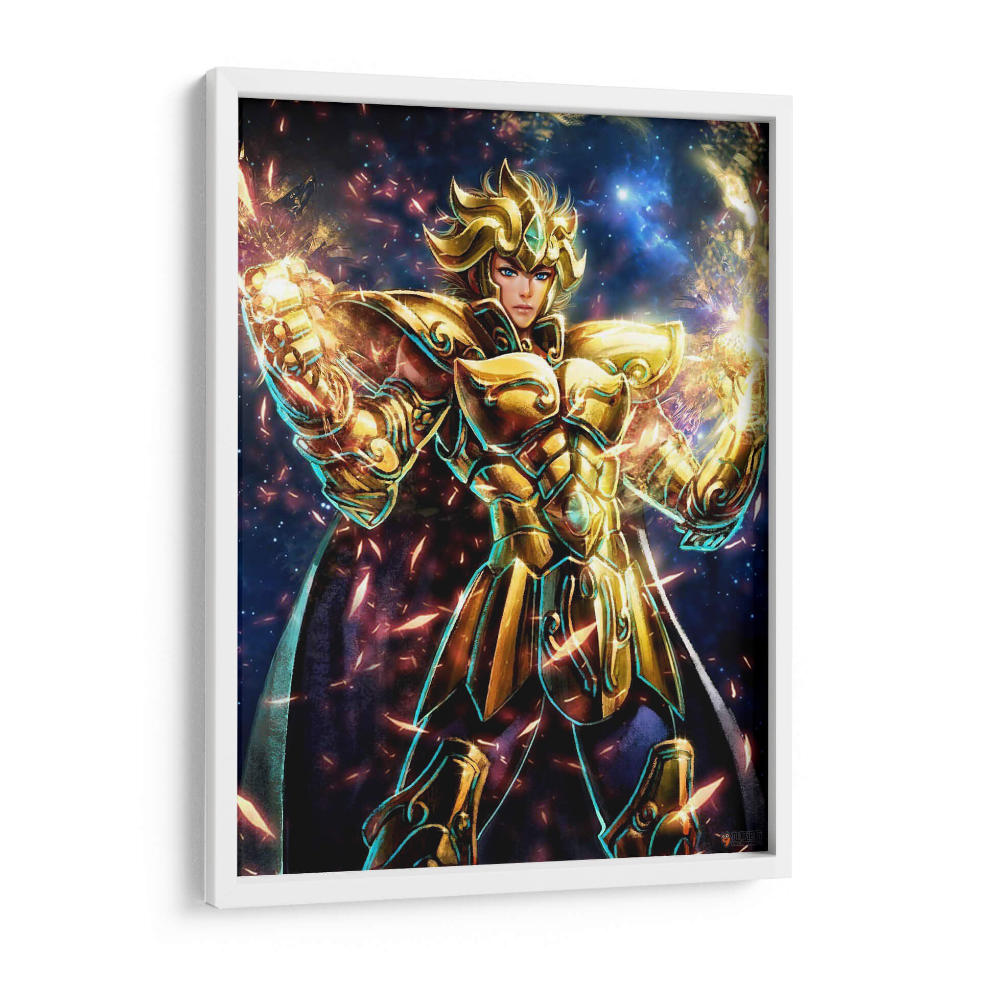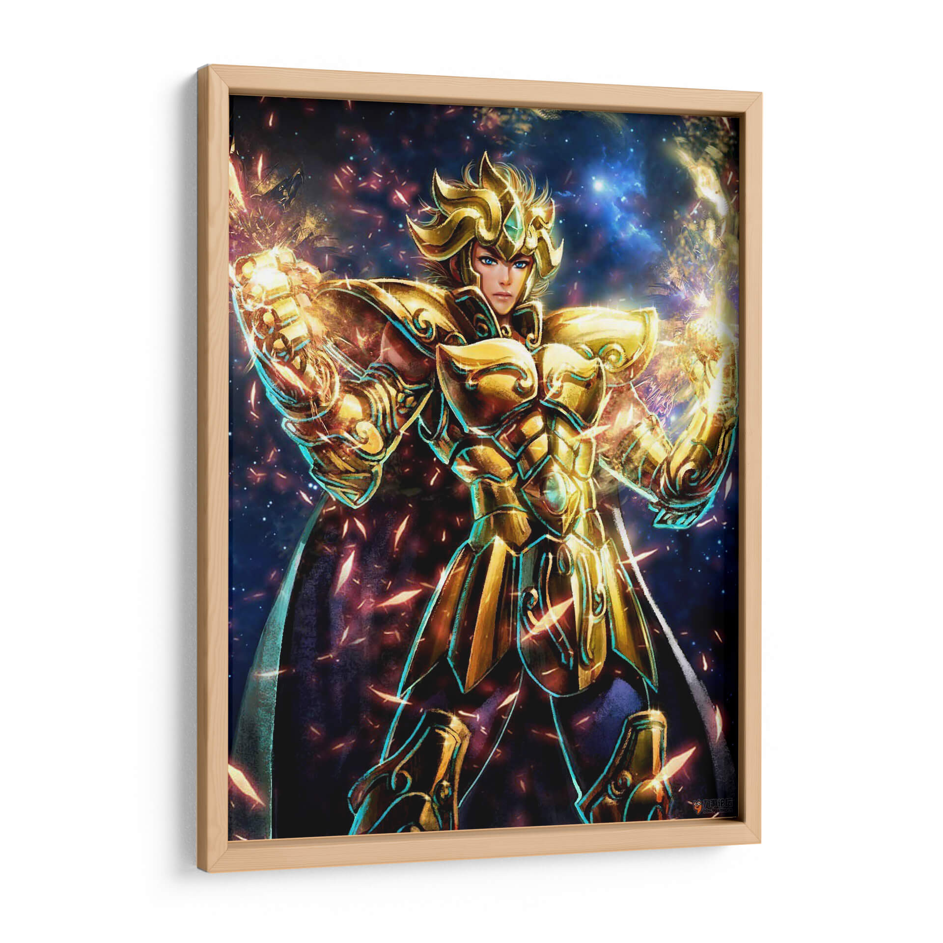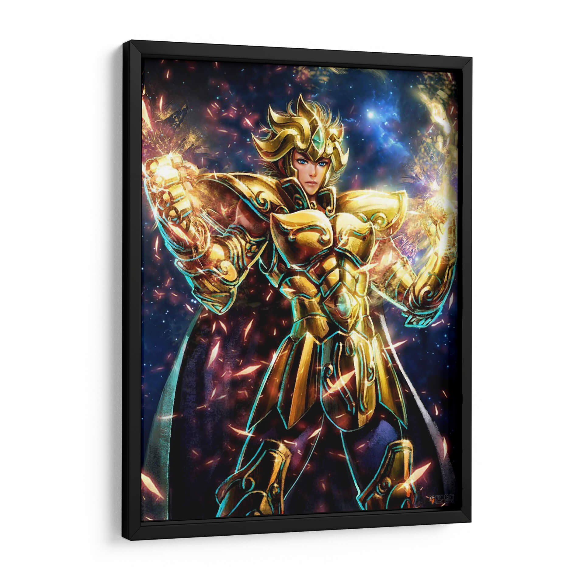 Sumérgete en la fuerza y el misterio con este impactante cuadro decorativo titulado "Caballero Fuerte". La obra presenta a una figura masculina imponente, vestida con una armadura dorada reluciente que evoca poder y determinación. El fondo cósmico, salpicado de luces y energía, crea una atmósfera de batalla épica o de un viaje galáctico. Los tonos dorados predominantes en la armadura contrastan con los azules profundos y los destellos anaranjados del fondo, generando una vibrante tensión visual. La composición centra la atención en la figura central, cuya mirada intensa y postura firme sugieren coraje y resiliencia. Este cuadro es ideal para aquellos que buscan infundir sus espacios con un sentido de valentía y aventura. Perfecto como punto focal en una sala de estar moderna, un estudio o una oficina, este arte de pared contemporáneo no solo decora, sino que también inspira. Añade un toque de heroísmo y sofisticación a tu decoración y deja que esta pieza hable de fuerza y gloria.