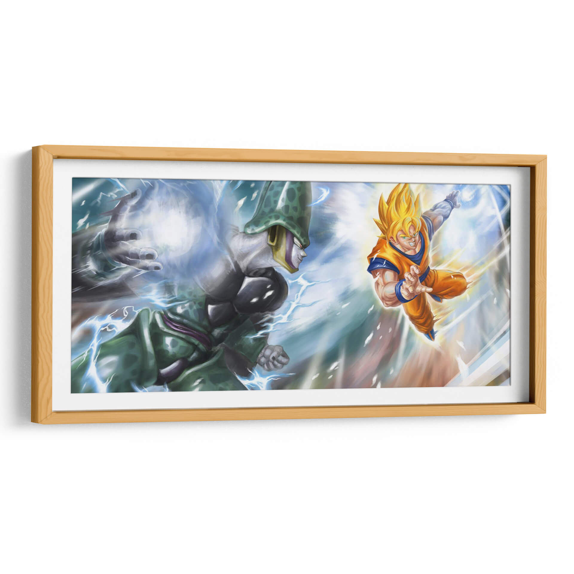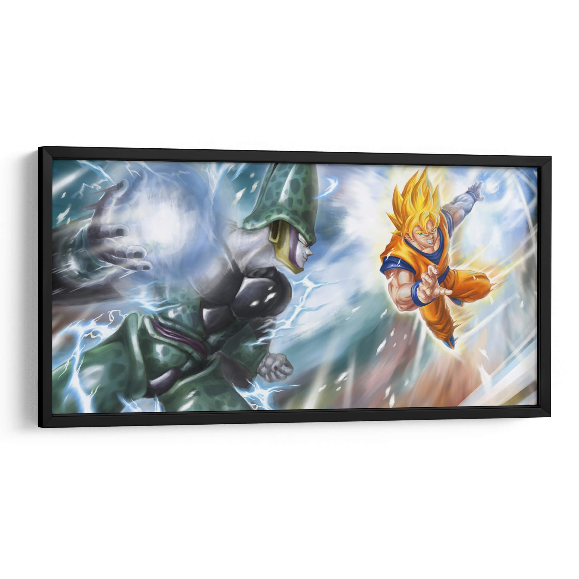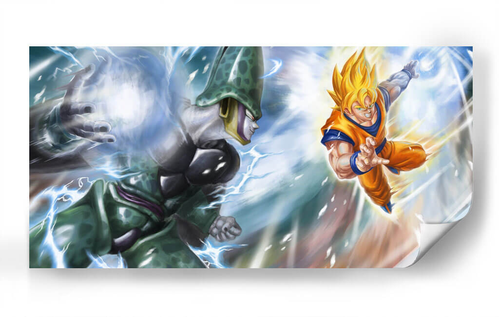 Sumérgete en la intensidad épica de 'Cell vs Super Saiyan', un cuadro decorativo que captura uno de los enfrentamientos más icónicos del anime. Esta obra de arte digital plasma la tensión y la energía desbordante de un momento cumbre, con personajes que parecen cobrar vida a través de pinceladas dinámicas y una paleta de colores vibrantes. Los tonos azules eléctricos y los amarillos intensos de los ataques chocan contra los verdes y grises de los personajes, creando un contraste visual impactante que evoca poder y determinación. El estilo artístico, aunque inspirado en el anime, se presenta con una calidad de pintura que añade profundidad y textura, haciéndolo apto para coleccionistas y entusiastas del arte por igual. Ideal para una sala de juegos, un estudio o cualquier espacio que busque un toque de acción y nostalgia, este cuadro decorativo es una pieza central que atraerá todas las miradas y encenderá conversaciones. Transforma tu ambiente con la fuerza y el dramatismo de este duelo legendario, añadiendo un elemento único y lleno de carácter a tu decoración.