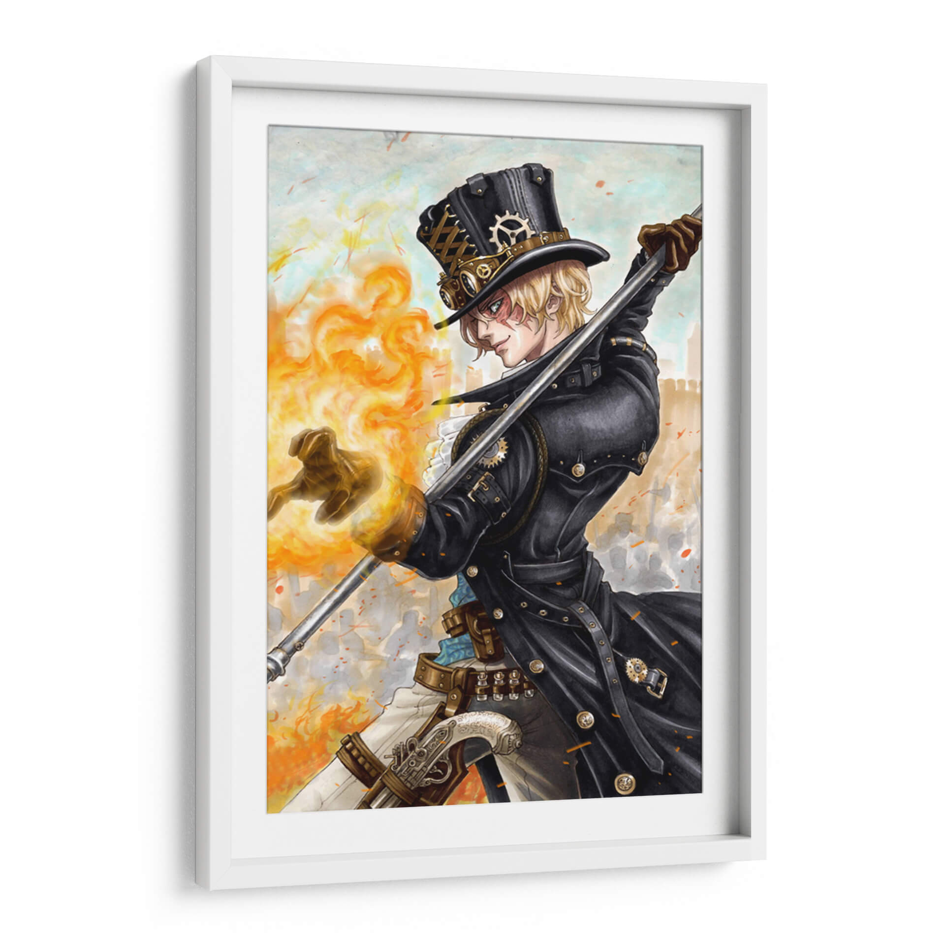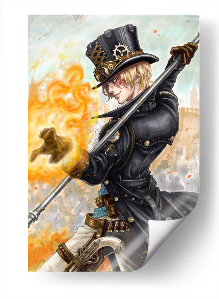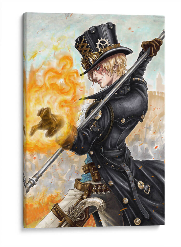 Adéntrate en un mundo de fantasía y acción con este impactante cuadro decorativo, inspirado en el vibrante estilo Steampunk. La obra presenta a un enigmático personaje con un sombrero de copa adornado con engranajes y gafas de aviador, vestido con un elegante abrigo negro de corte militar y guantes de cuero. Su mirada intensa y una sonrisa desafiante sugieren un espíritu audaz y aventurero. Alrededor de su mano, que empuña un bastón metálico, emerge un torbellino de llamas naranjas y amarillas, aportando dinamismo y una sensación de poder desatado. El fondo, con siluetas de edificios al estilo victoriano y un cielo en tonos grises y ocre, evoca una atmósfera de ciudad industrial en plena efervescencia o quizás en conflicto. La paleta de colores, dominada por el negro, el dorado, el naranja y el azul pálido, crea un contraste llamativo y una estética sofisticada y audaz. Este cuadro decorativo es perfecto para añadir un toque de carácter y originalidad a cualquier espacio, ideal para salones modernos, estudios o incluso oficinas que busquen una declaración de estilo única y llena de personalidad. Una pieza que captura la imaginación y evoca historias de aventuras y un futuro retro-futurista.