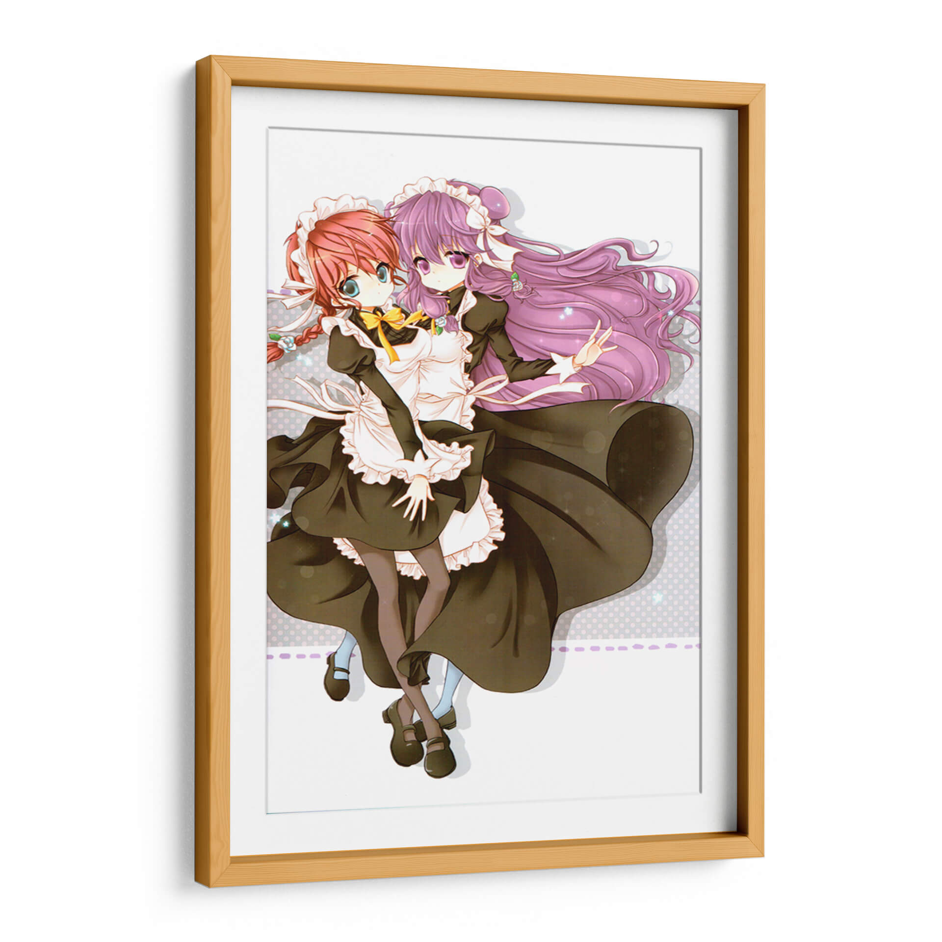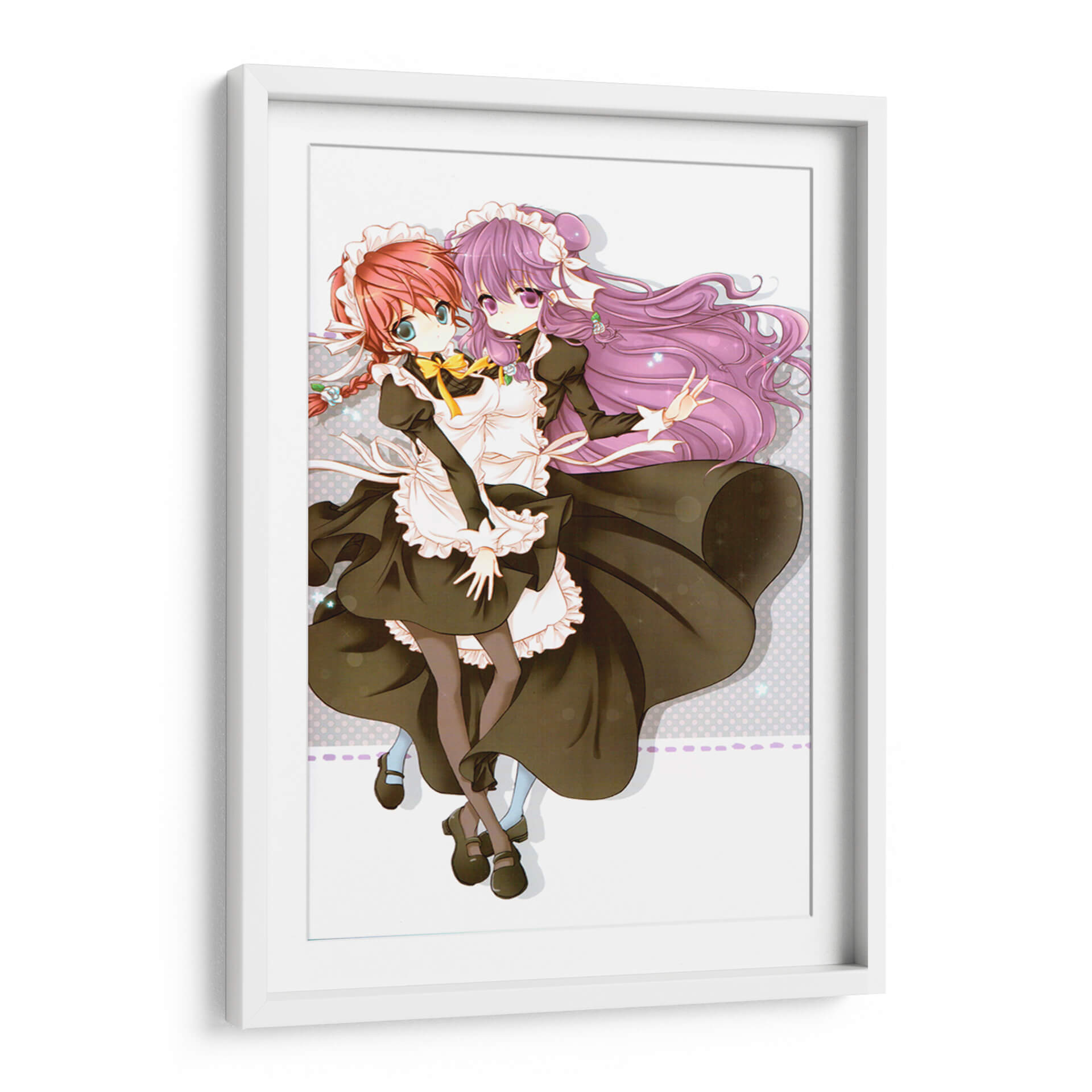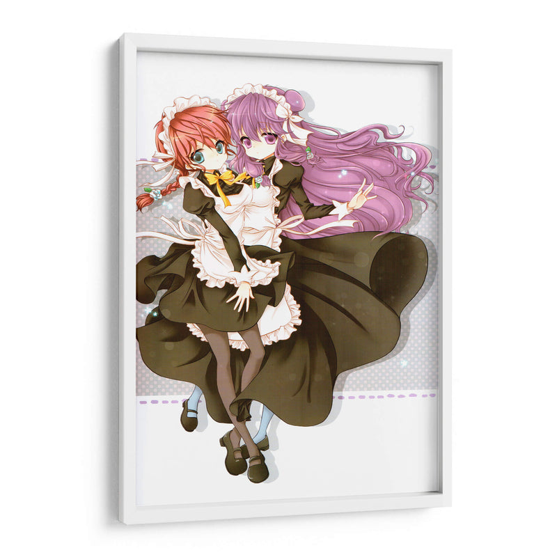Sumérgete en el encanto y la dulzura de "Mucamas a la vista", un cuadro decorativo que captura la esencia de la inocencia y la amistad. Esta cautivadora obra de arte digital presenta a dos jóvenes doncellas con trajes clásicos, sus expresiones y gestos irradian una calidez que invita a la contemplación. La paleta de colores, dominada por tonos oscuros y contrastes suaves, crea una atmósfera delicada y un poco nostálgica, mientras que los detalles vibrantes en sus peinados y lazos añaden un toque de alegría. El estilo artístico, inspirado en el anime, ofrece una estética limpia y expresiva, perfecta para añadir un punto focal distintivo a cualquier habitación. Ideal para espacios que buscan un aire de fantasía y ternura, como dormitorios juveniles, estudios o áreas de descanso, este cuadro decorativo es una elección excepcional para quienes aprecian el arte con alma y narrativa. Transforma tu hogar en un santuario de belleza y emoción con esta pieza única.