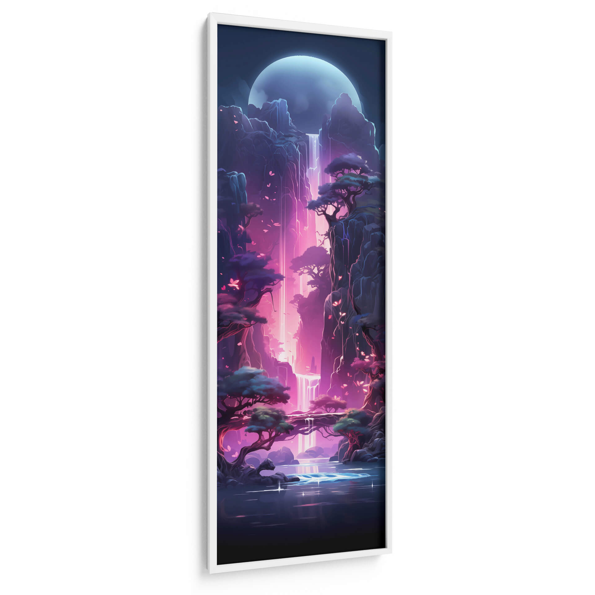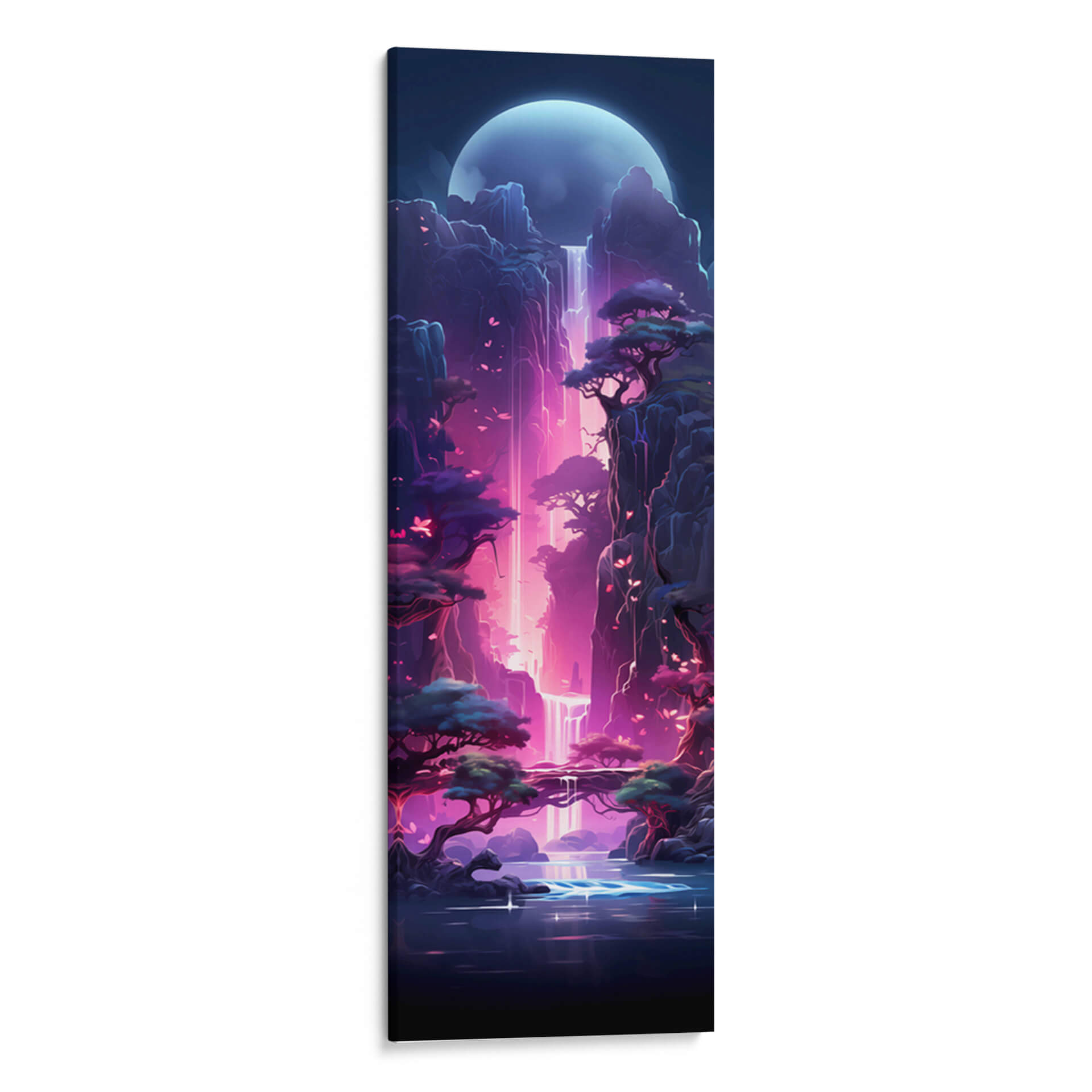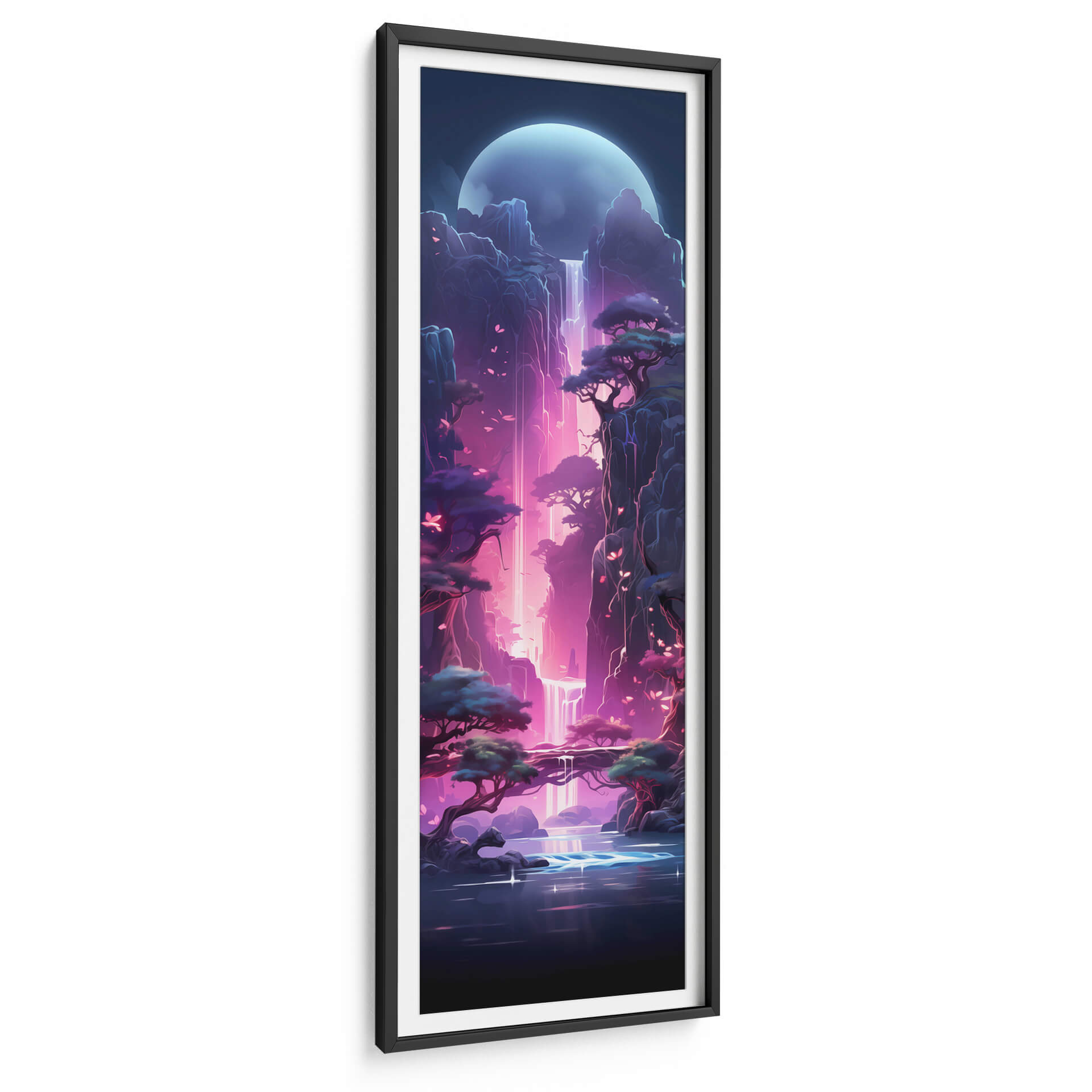 Sumérgete en la serenidad mística de "Cascada de la Vida - 10", una obra de arte digital que captura la esencia de un paisaje onírico. Esta pieza vertical presenta una majestuosa cascada que irradia una luz vibrante de tonos rosados y púrpuras, descendiendo entre formaciones rocosas escarpadas y árboles de silueta exótica. La paleta de colores, dominada por azules profundos, púrpuras etéreos y destellos de rosa fucsia, crea una atmósfera de ensueño y tranquilidad, bañada por la luz de una luna llena que preside la escena. La composición, con sus contrastes de luces y sombras y la delicadeza de las flores flotantes, evoca una sensación de paz y armonía natural. "Cascada de la Vida - 10" es ideal para añadir un toque de magia y serenidad a cualquier espacio, transformando tu hogar u oficina en un santuario de calma y belleza. Este cuadro decorativo es perfecto para quienes buscan una pieza que inspire tranquilidad y conecte con la naturaleza en su versión más fantástica. Descubre la magia de este paisaje místico y llévalo a tu hogar.