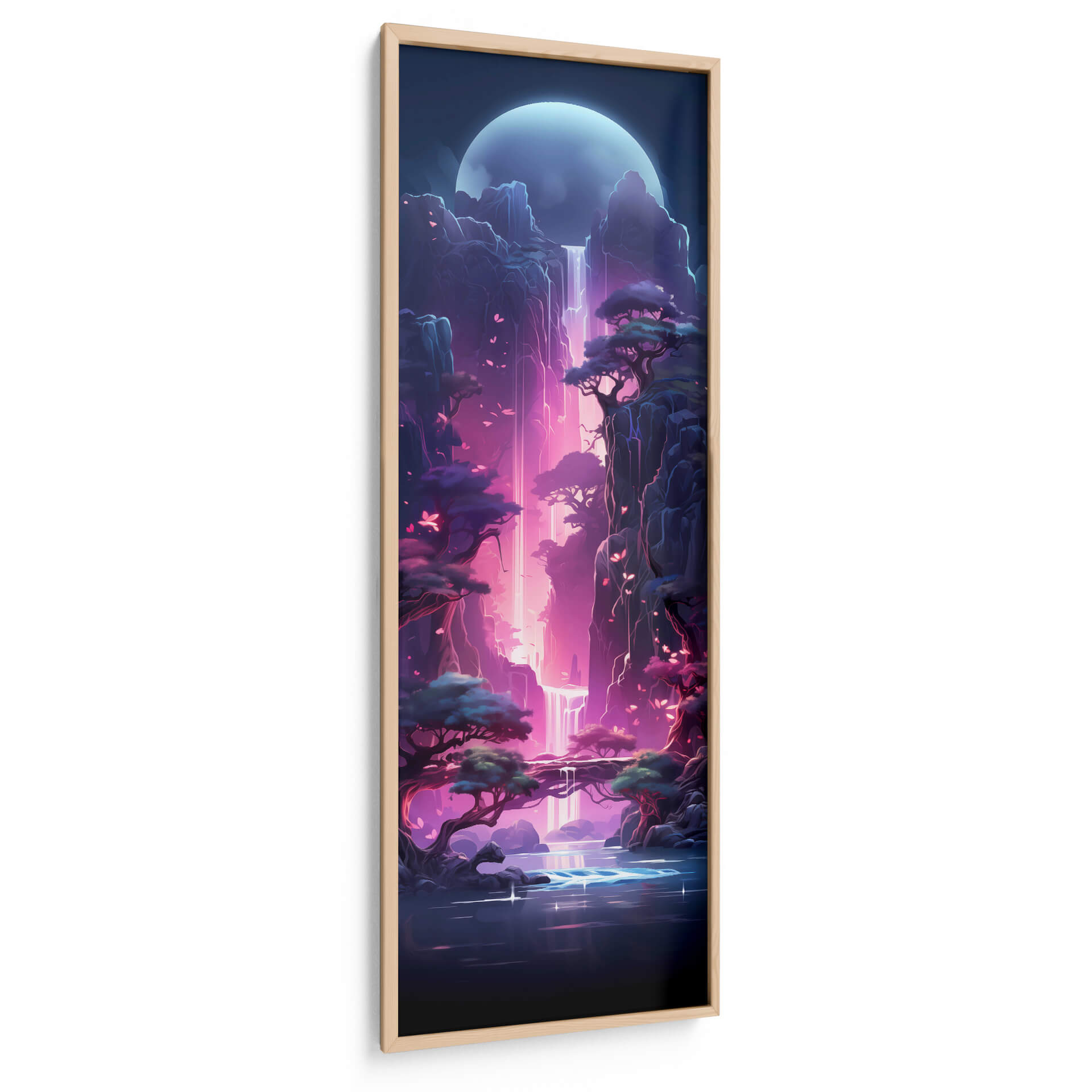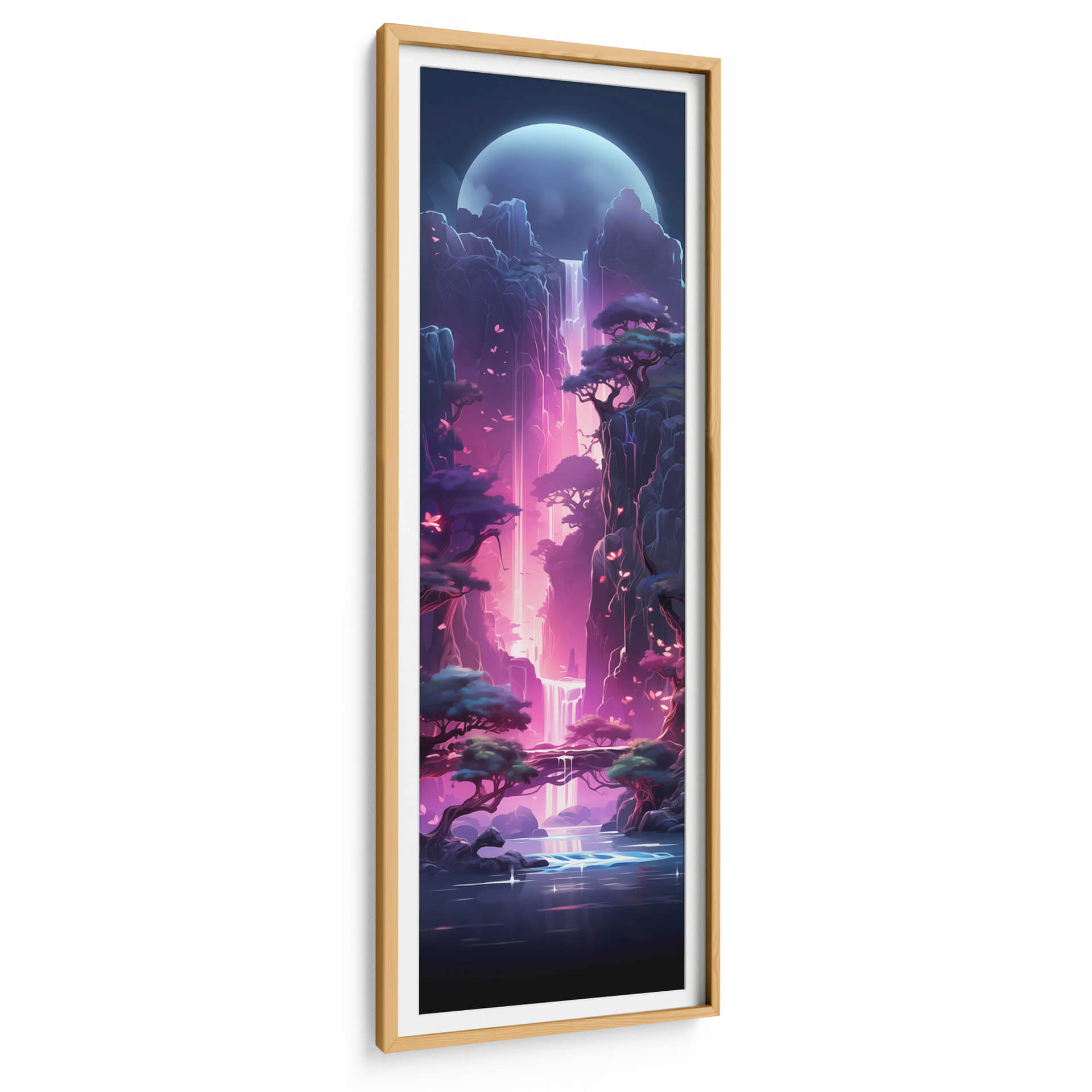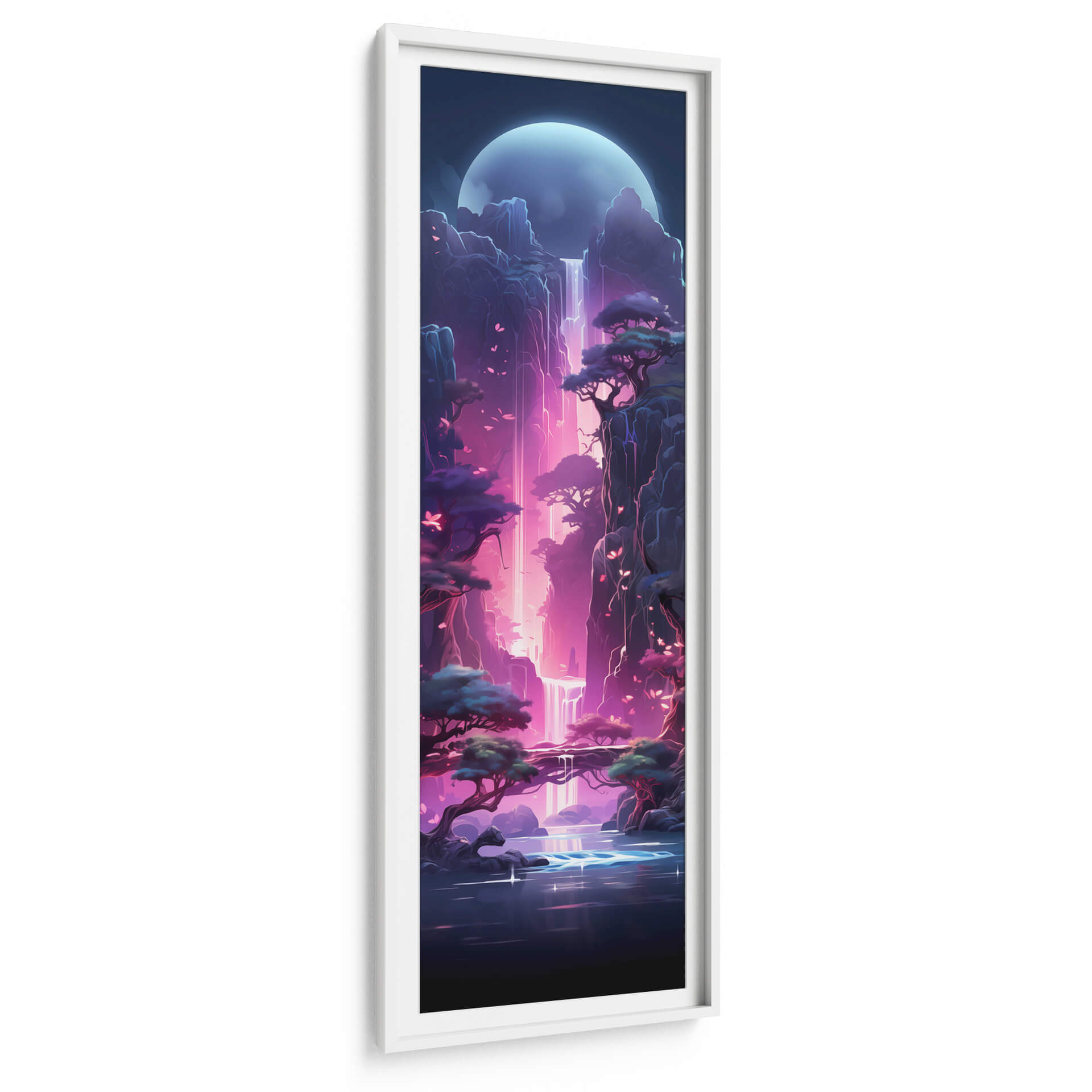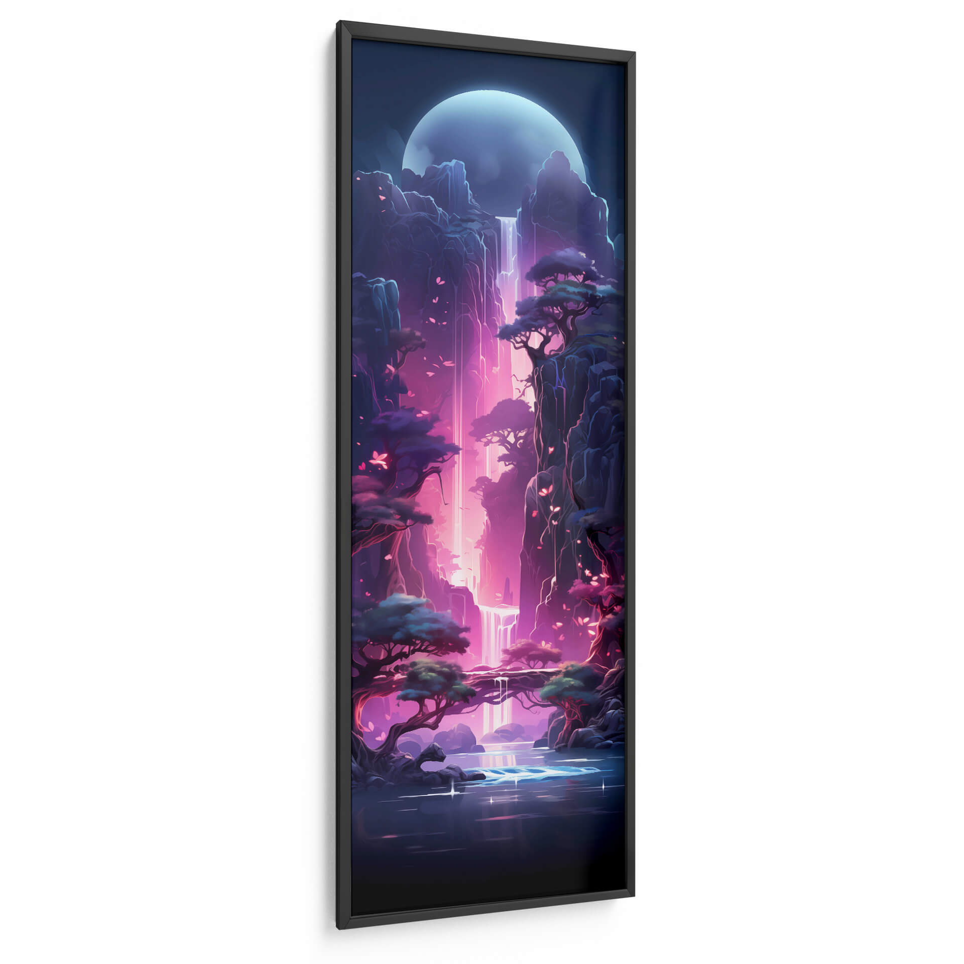 Sumérgete en la serenidad mística de "Cascada de la Vida - 10", una obra de arte digital que captura la esencia de un paisaje onírico. Esta pieza vertical presenta una majestuosa cascada que irradia una luz vibrante de tonos rosados y púrpuras, descendiendo entre formaciones rocosas escarpadas y árboles de silueta exótica. La paleta de colores, dominada por azules profundos, púrpuras etéreos y destellos de rosa fucsia, crea una atmósfera de ensueño y tranquilidad, bañada por la luz de una luna llena que preside la escena. La composición, con sus contrastes de luces y sombras y la delicadeza de las flores flotantes, evoca una sensación de paz y armonía natural. "Cascada de la Vida - 10" es ideal para añadir un toque de magia y serenidad a cualquier espacio, transformando tu hogar u oficina en un santuario de calma y belleza. Este cuadro decorativo es perfecto para quienes buscan una pieza que inspire tranquilidad y conecte con la naturaleza en su versión más fantástica. Descubre la magia de este paisaje místico y llévalo a tu hogar.