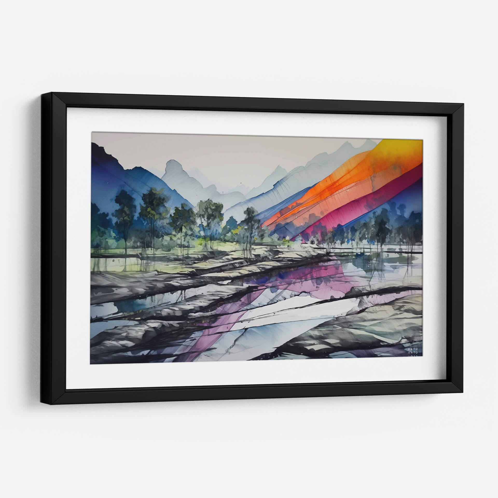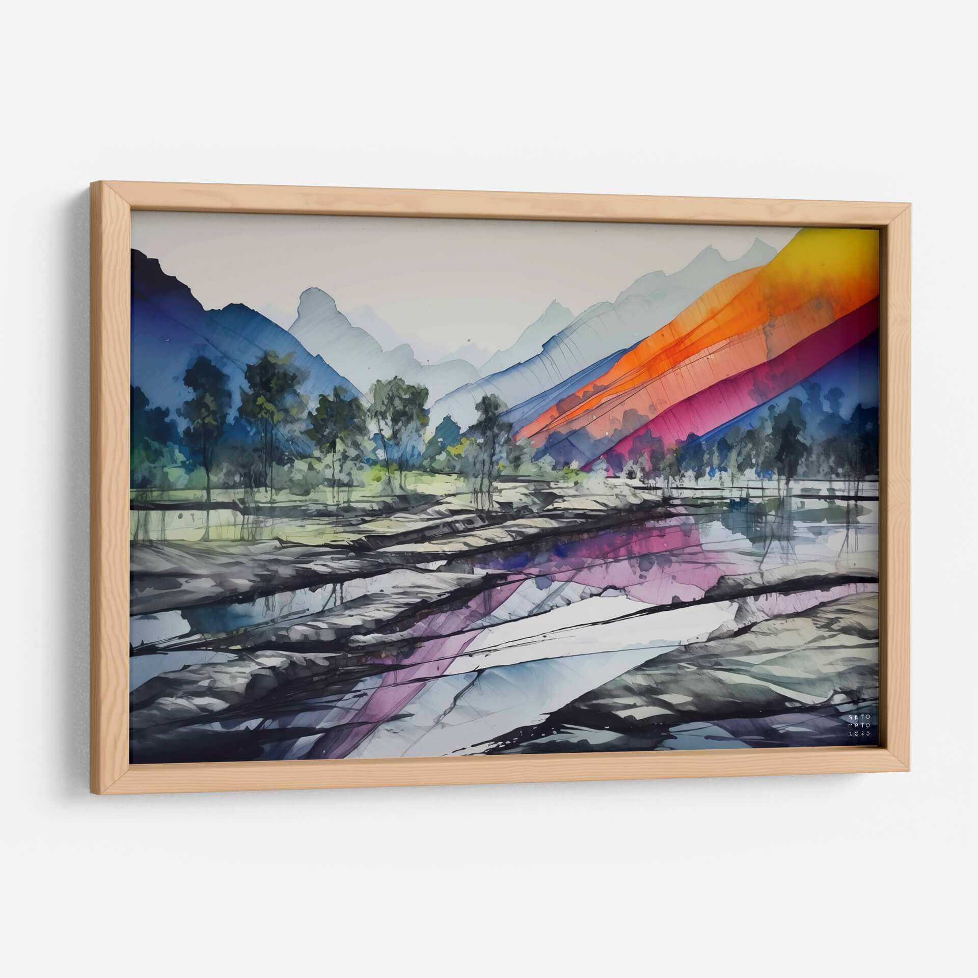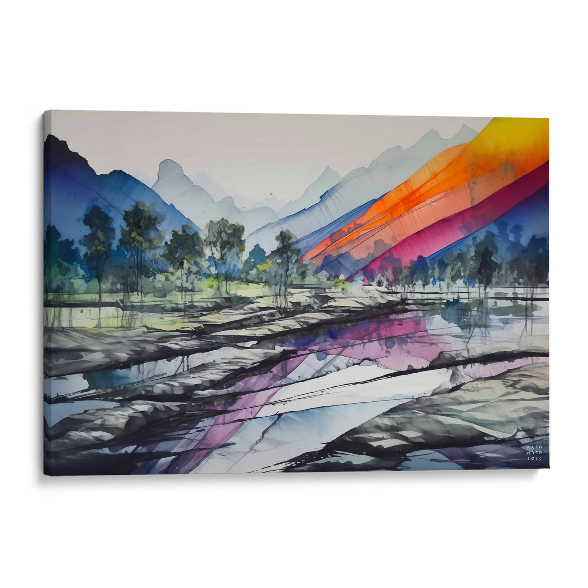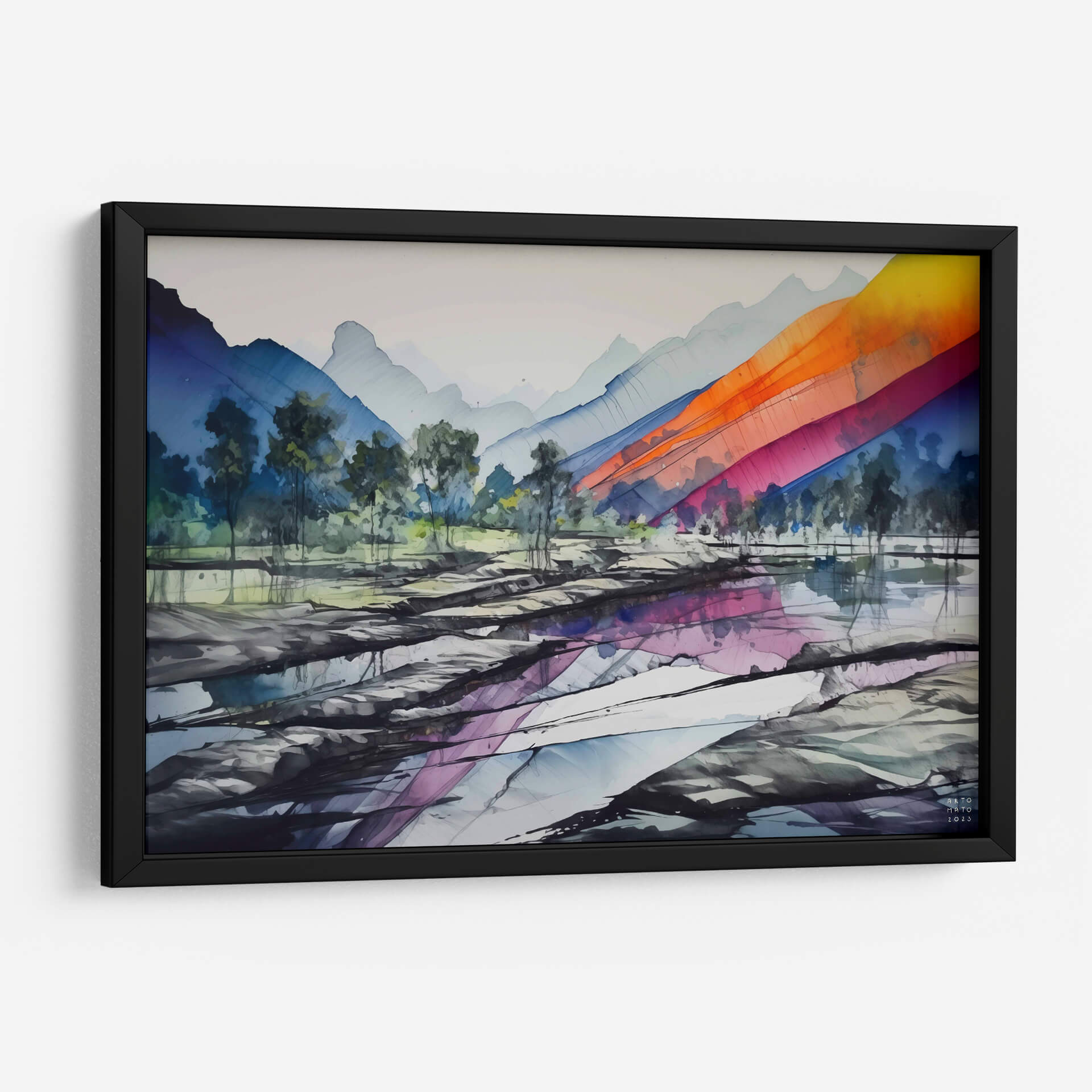 Sumérgete en la majestuosidad de 'Sierra Madre Oriental', una obra de arte contemporáneo que captura la esencia de un paisaje montañoso con un giro vibrante y moderno. La pieza presenta imponentes siluetas de montañas en tonos fríos de azul y gris, que se difuminan suavemente en el cielo brumoso, creando una sensación de profundidad y serenidad. En contraste, una cascada de colores intensos, que abarca desde el naranja ardiente hasta el fucsia y el azul eléctrico, desciende diagonalmente sobre las laderas, inyectando una energía dinámica y un toque de audacia a la composición. El primer plano revela un terreno rocoso y aguas tranquilas que reflejan sutilmente los tonos del cielo y las montañas, añadiendo una capa de misticismo y realismo a la escena. La técnica, que evoca la fluidez de la acuarela pero con trazos definidos, aporta una textura visual cautivadora. Este cuadro decorativo es perfecto para quienes buscan añadir un punto focal lleno de color y carácter a su hogar u oficina, infundiendo un ambiente de aventura y sofisticación.