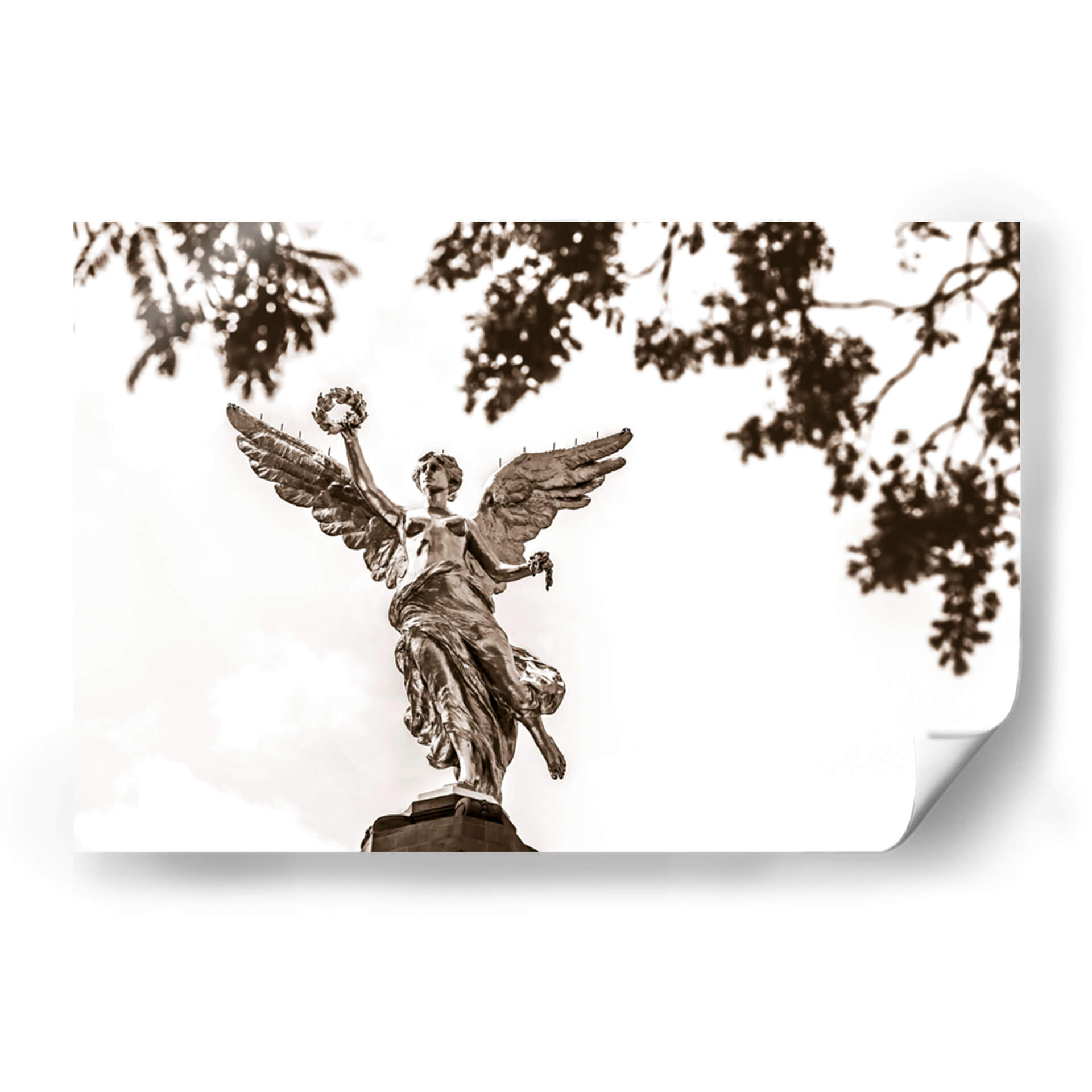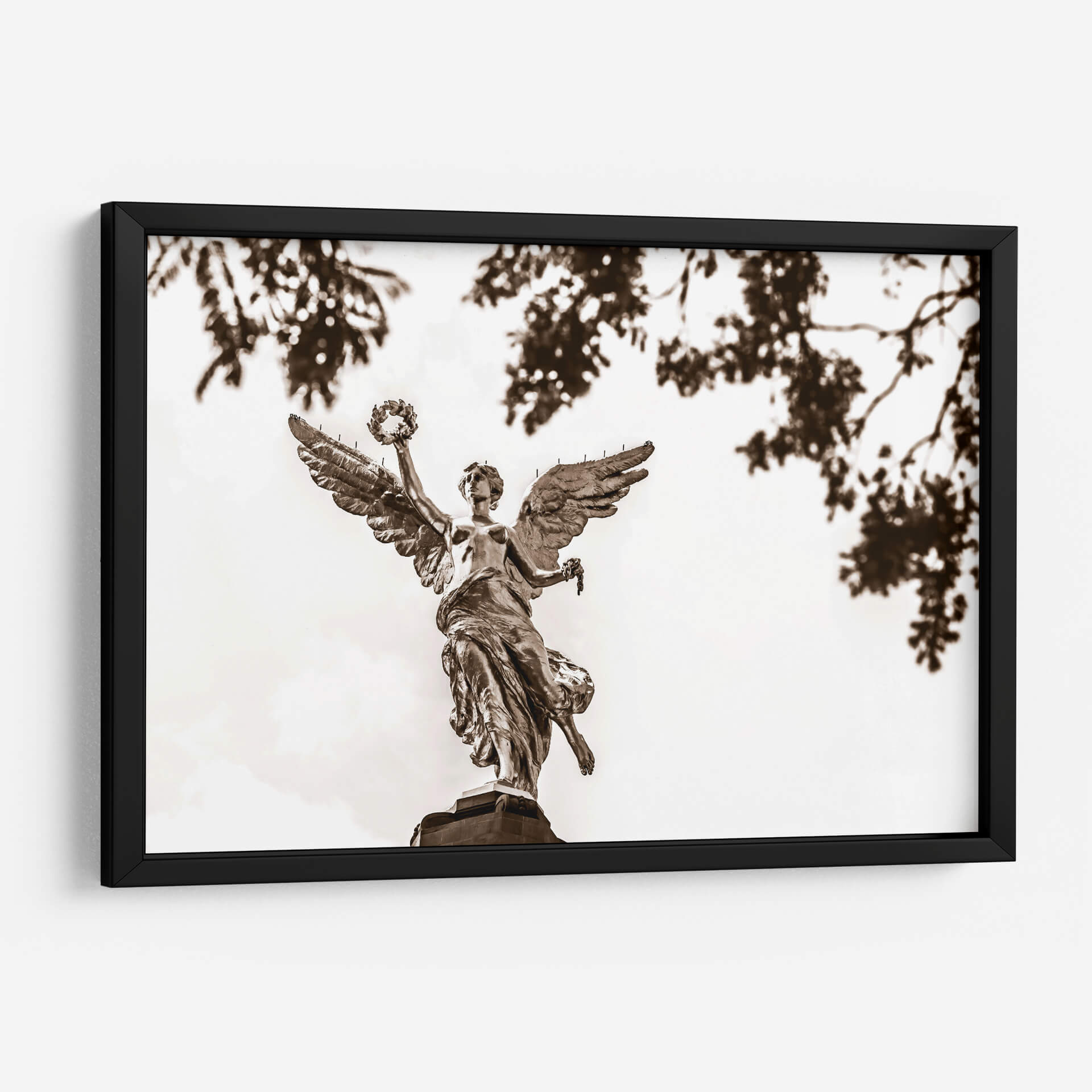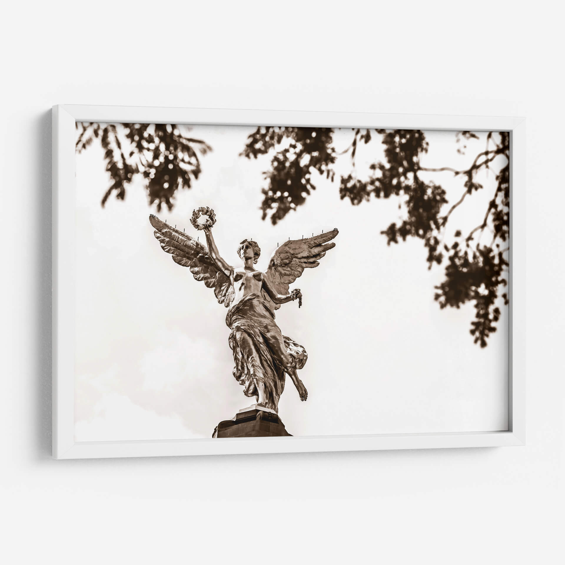 El 'Ángel de la Independencia 2' de Guillermo Aparicio es una obra cautivadora que evoca un sentido de poder y trascendencia. Captura la icónica figura alada, representada con un detalle exquisito, elevándose con majestuosidad. La paleta de sepia, con sus ricos tonos tierra y contrastes sutiles, imparte una cualidad atemporal y solemne a la pieza, mientras que las hojas tenues y desenfocadas en primer plano añaden profundidad y un toque etéreo. Esta obra de arte es perfecta para quienes buscan infundir en su hogar u oficina un aire de inspiración y grandeza. Su composición, que centra la figura celestial contra un cielo luminoso, atrae la mirada y genera un punto focal digno de admiración. Ideal para salas de estar, estudios o cualquier espacio que se beneficie de una declaración artística audaz y evocadora. Este cuadro decorativo contemporáneo es más que una imagen; es una invitación a la contemplación, un símbolo de libertad y resiliencia, listo para convertirse en el corazón de tu decoración.