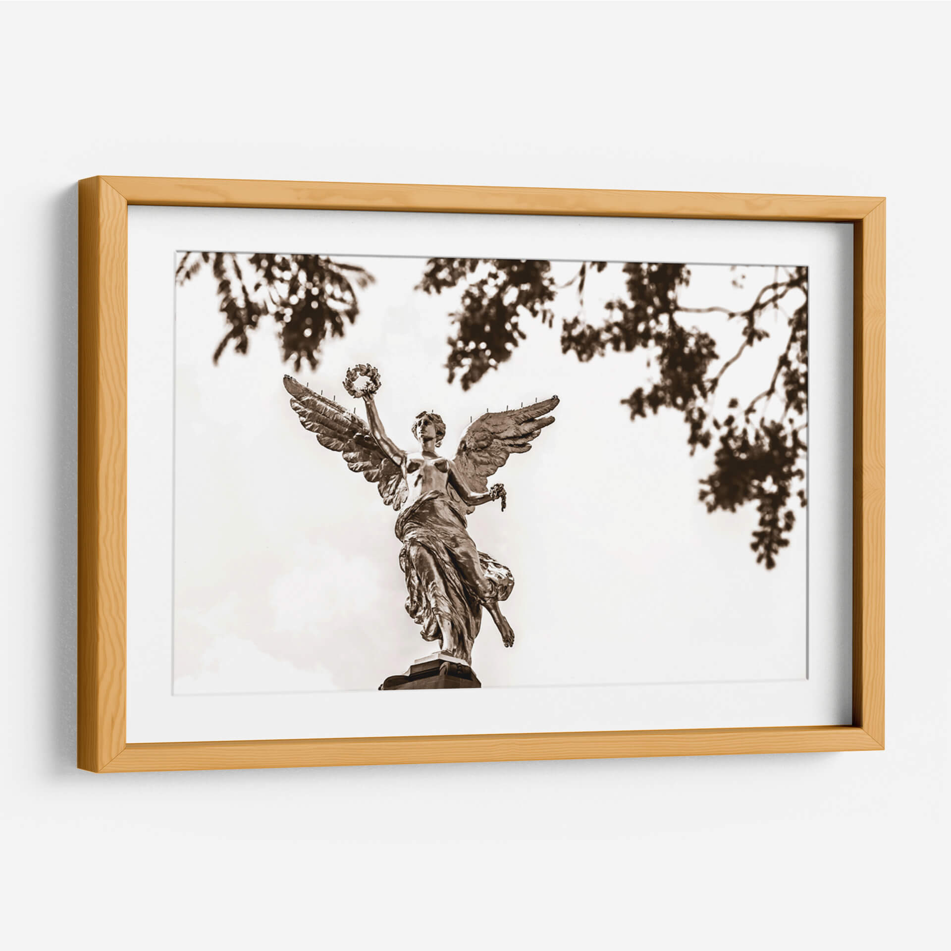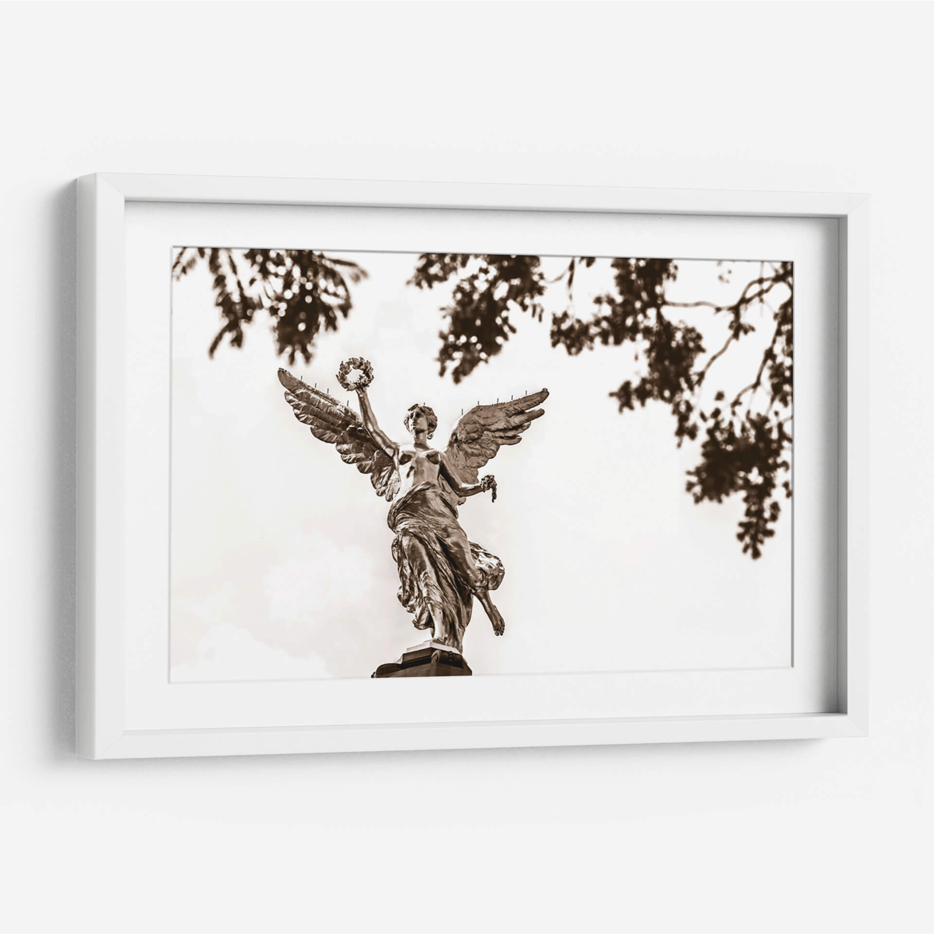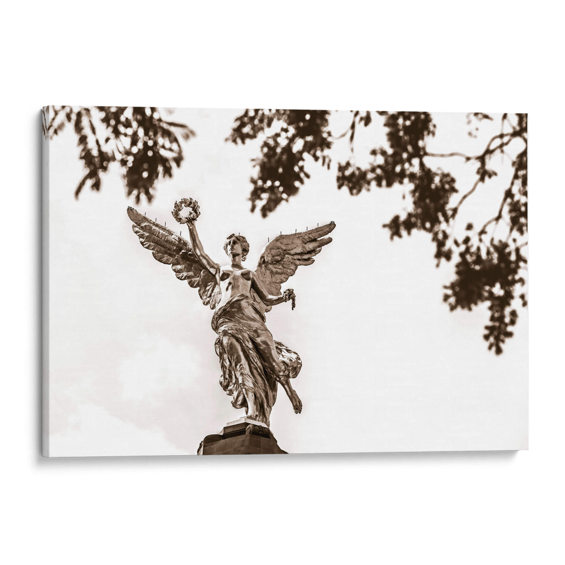 El 'Ángel de la Independencia 2' de Guillermo Aparicio es una obra cautivadora que evoca un sentido de poder y trascendencia. Captura la icónica figura alada, representada con un detalle exquisito, elevándose con majestuosidad. La paleta de sepia, con sus ricos tonos tierra y contrastes sutiles, imparte una cualidad atemporal y solemne a la pieza, mientras que las hojas tenues y desenfocadas en primer plano añaden profundidad y un toque etéreo. Esta obra de arte es perfecta para quienes buscan infundir en su hogar u oficina un aire de inspiración y grandeza. Su composición, que centra la figura celestial contra un cielo luminoso, atrae la mirada y genera un punto focal digno de admiración. Ideal para salas de estar, estudios o cualquier espacio que se beneficie de una declaración artística audaz y evocadora. Este cuadro decorativo contemporáneo es más que una imagen; es una invitación a la contemplación, un símbolo de libertad y resiliencia, listo para convertirse en el corazón de tu decoración.