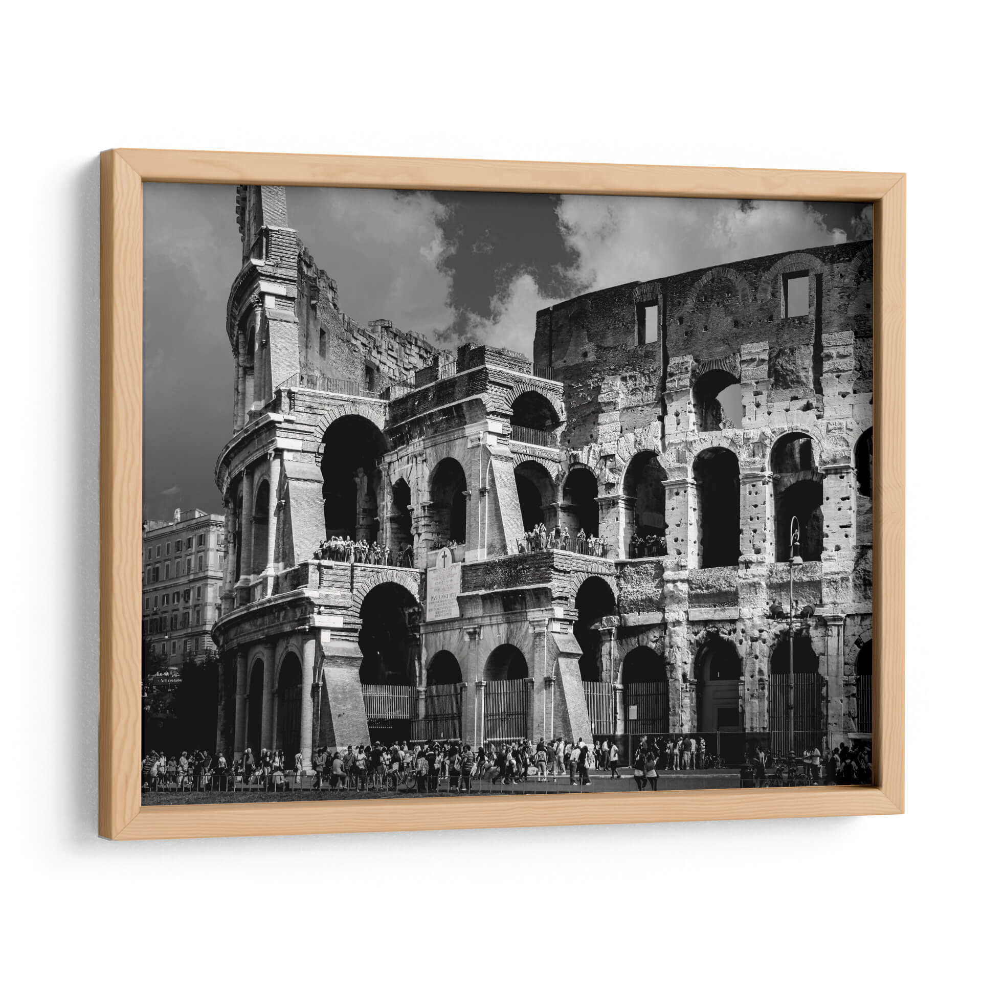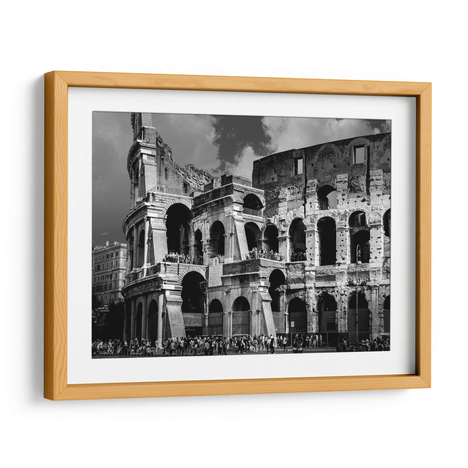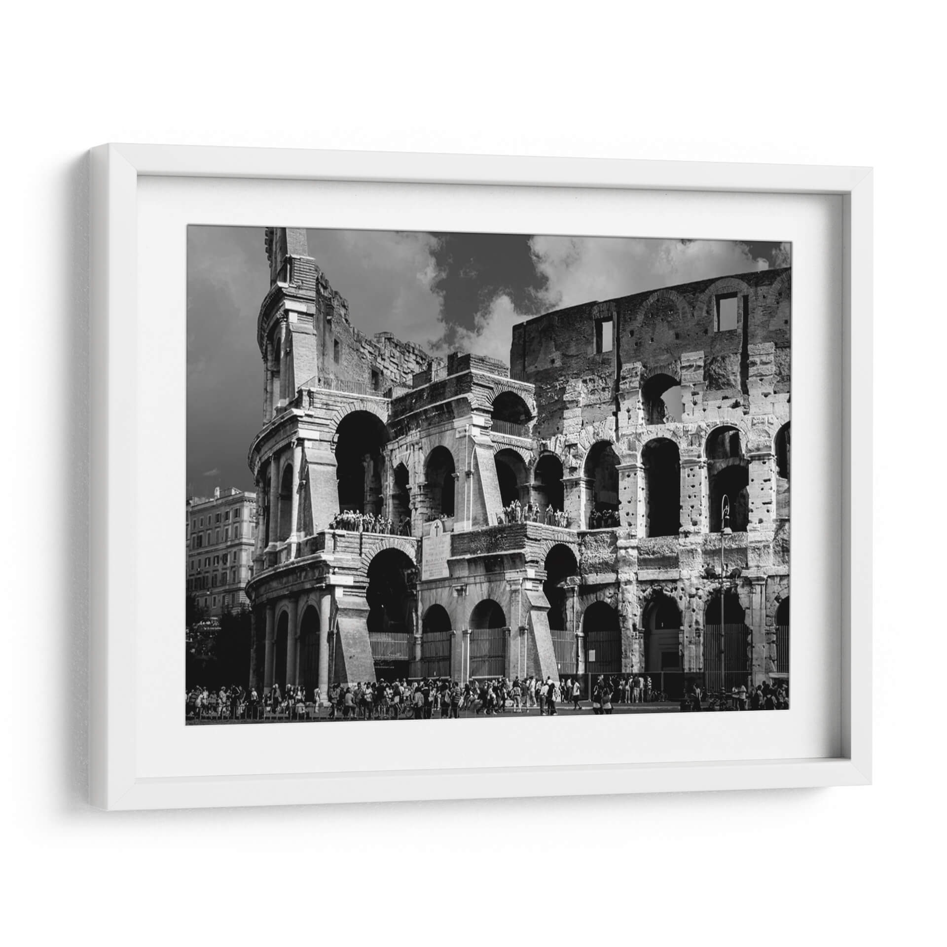 Sumérgete en la majestuosidad de Roma con este evocador cuadro decorativo del Coliseo Romano. La obra captura la grandiosidad de uno de los monumentos más icónicos del mundo en una cautivadora fotografía en blanco y negro. La imponente arquitectura del anfiteatro romano, con sus arcos centenarios y texturas desgastadas por el tiempo, se despliega ante tus ojos, invitándote a un viaje a través de la historia y la cultura. La paleta monocromática, llena de contrastes dramáticos entre luces y sombras, realza la monumentalidad de la estructura y crea una atmósfera de solemnidad y poder perdurable. Las pequeñas figuras humanas en la base y en las gradas añaden una escala fascinante, permitiéndote apreciar la magnitud del Coliseo y recordándonos las innumerables historias que estas ruinas han presenciado. Este cuadro decorativo es una pieza de arte de pared ideal para aquellos que aprecian la arquitectura clásica, la historia antigua o simplemente buscan una imagen con un fuerte impacto visual y una elegancia atemporal. Perfecto para añadir un toque de sofisticación y carácter a tu sala de estar, estudio u oficina, este retrato del Coliseo Romano se convertirá en un punto focal que inspira admiración y conversación.
