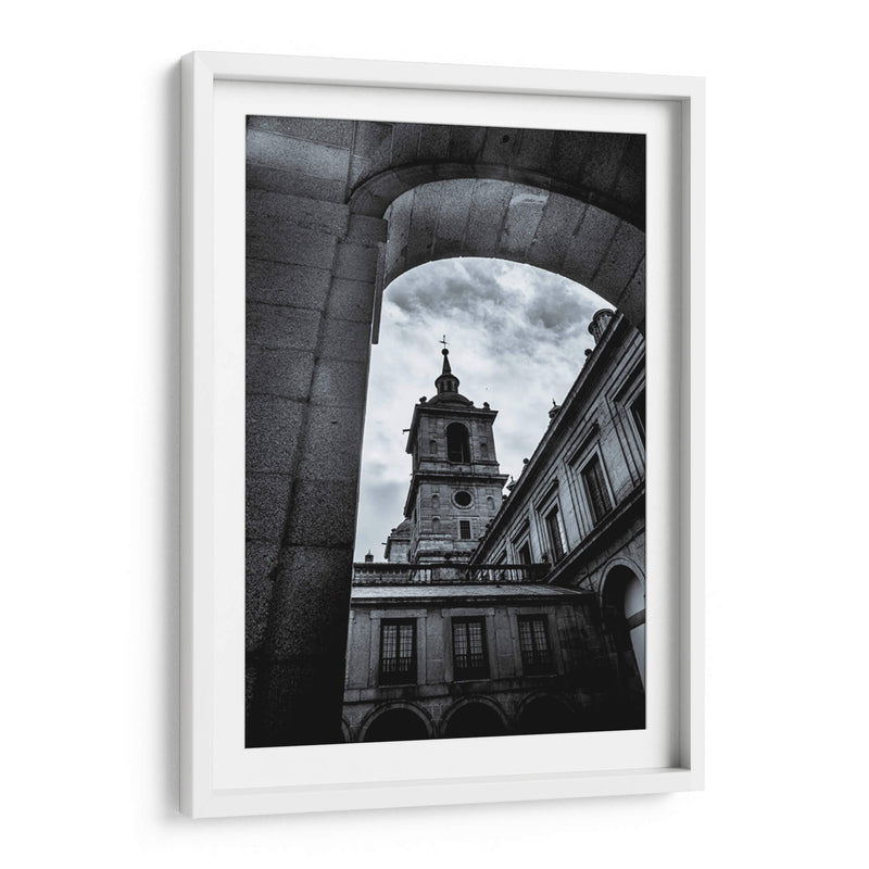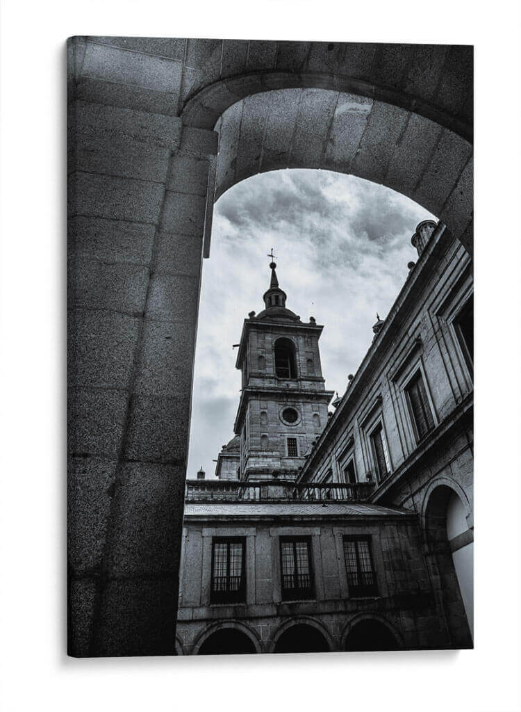 Sumérgete en la majestuosidad arquitectónica con "El Escorial II", una obra fotográfica de Jaime López Portillo que captura la grandiosidad del histórico Monasterio de El Escorial. Esta pieza, presentada en un evocador blanco y negro, te transporta a través de un imponente arco de piedra, revelando la silueta de una torre campanario que se eleva hacia un cielo nublado y dramático. La composición juega con luces y sombras, destacando la textura rugosa de la cantería y la solidez de los edificios. Cada detalle, desde las ventanas enrejadas hasta la cúpula puntiaguda, habla de historia, poder y una sobriedad que impone respeto. Es un cuadro decorativo ideal para espacios que buscan transmitir elegancia, profundidad y un toque de solemnidad. Perfecto para salones de lectura, estudios o cualquier rincón donde se desee añadir un elemento de reflexión y cultura visual. "El Escorial II" no es solo una imagen, es una ventana a la historia y la arquitectura monumental, diseñada para inspirar y enriquecer tu decoración.