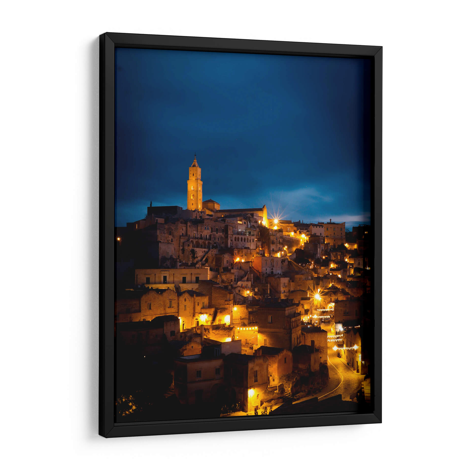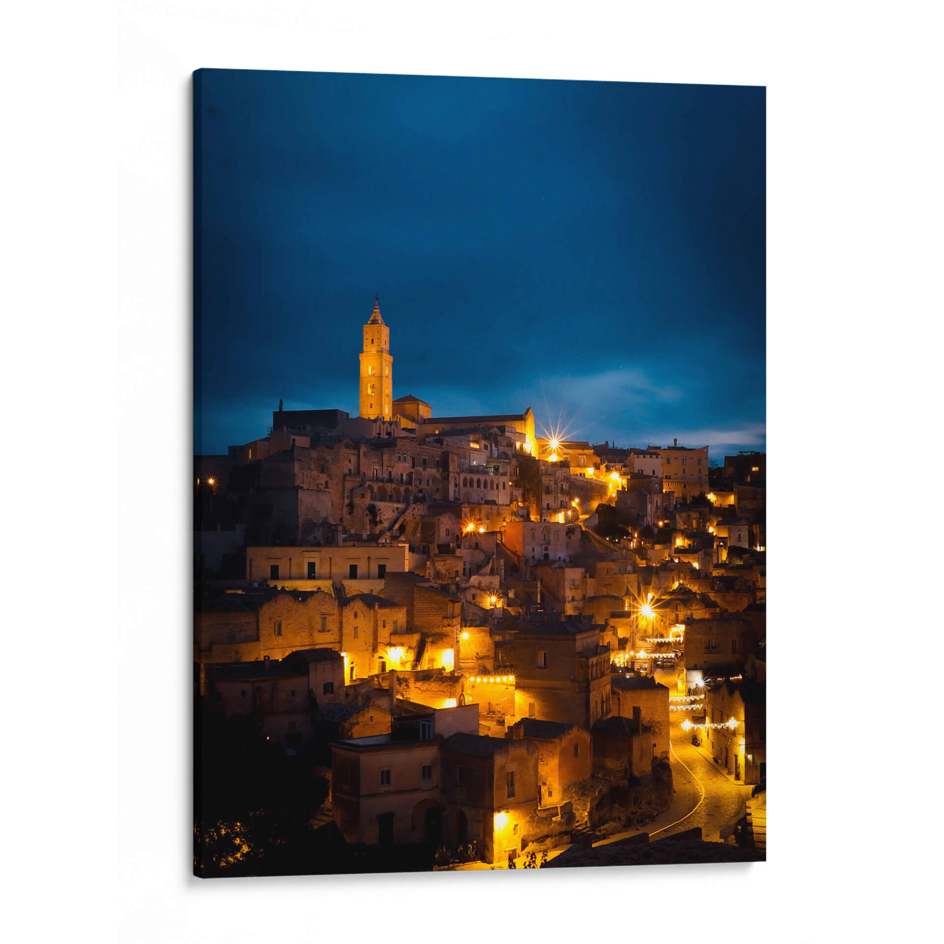 Captura la esencia mágica de Italia con esta impresionante obra de arte, "Huellas de Italia - Matera, Italia", del artista HiLalo. Esta pieza evoca la atmósfera nocturna de la histórica ciudad de Matera, con sus edificios de piedra iluminados por cálidas luces doradas que contrastan con el profundo azul del cielo. La composición detallada de la arquitectura antigua, las calles empedradas y la imponente torre central crean una sensación de profundidad y encanto atemporal. La paleta de colores, dominada por tonos tierra cálidos y el contraste con el azul oscuro, genera un ambiente íntimo y acogedor, perfecto para transformar cualquier espacio. Ideal para quienes buscan añadir un toque de historia, cultura y serenidad a su hogar u oficina, este cuadro decorativo es una ventana a uno de los paisajes urbanos más fascinantes del mundo. Imagina este cuadro aportando calidez y un sentido de escapada a tu sala de estar, o un punto de reflexión en tu estudio. Su estilo fotográfico y realista, capturado con maestría, permite apreciar los detalles de la ciudad iluminada, invitando a la contemplación y al disfrute de la belleza arquitectónica y la atmósfera nocturna. Una pieza que habla de viajes, de historia y de la luz que emana de los lugares con alma.