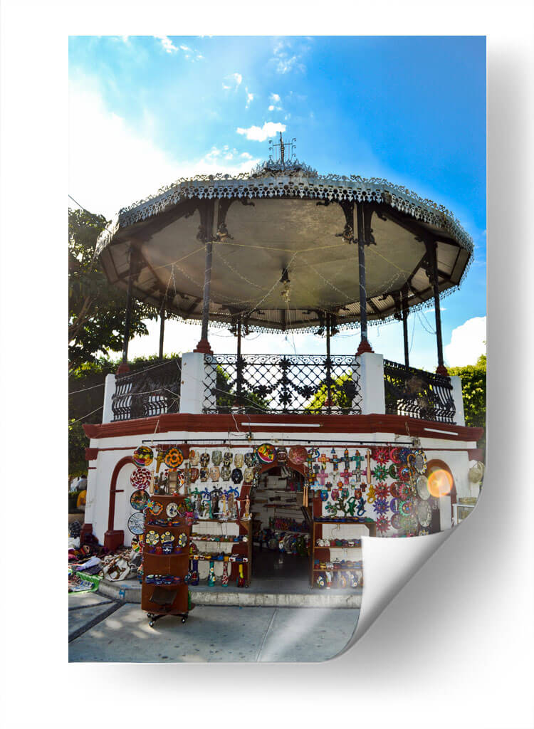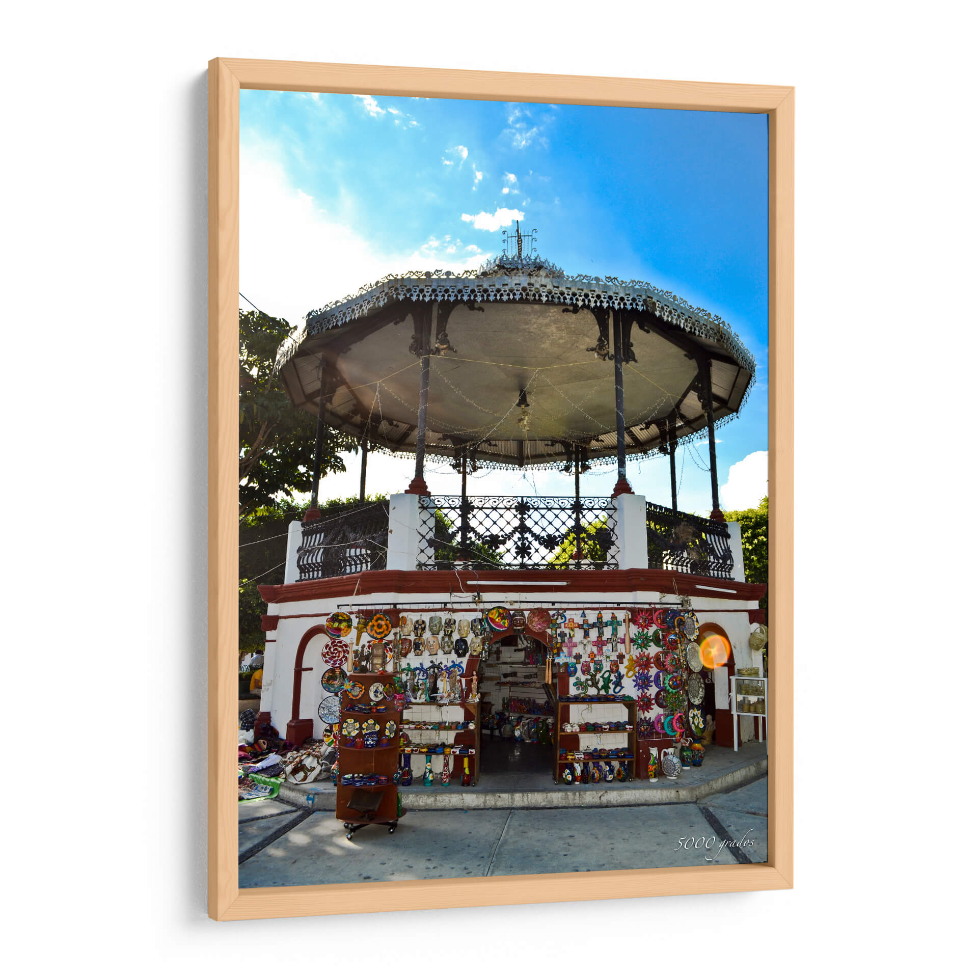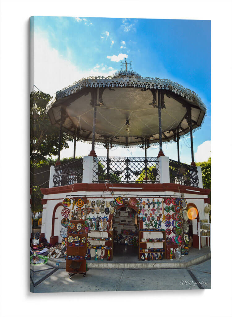 Captura la vibrante esencia de México con este cautivador cuadro decorativo que inmortaliza un quiosco rebosante de artesanías locales. La obra, titulada 'Quiosco con artesanias mexicanas' por 5000 grados, te transporta a un mercado tradicional bajo un cielo azul intenso y nubes algodonosas. Observa la riqueza de detalles en las coloridas piezas expuestas: desde intrincados discos de talavera hasta figuras cerámicas y textiles vibrantes, cada elemento evoca la maestría artesanal y la calidez de la cultura mexicana. La arquitectura del quiosco, con sus columnas ornamentadas y techo intrincado, añade un toque de encanto histórico y rústico a la escena. La paleta de colores es un festín visual, dominada por los tonos tierra de la estructura, el azul profundo del cielo y una explosión de colores vivos provenientes de las artesanías. Este cuadro es ideal para infundir carácter y un espíritu bohemio a cualquier espacio, ya sea una sala de estar, un comedor o un estudio. Aporta una atmósfera de autenticidad, alegría y celebración de la herencia cultural a tus paredes, convirtiéndose en un punto focal que invita a la conversación y al disfrute de la belleza artesanal mexicana. Perfecto para amantes de la cultura, los viajes y el arte con alma.