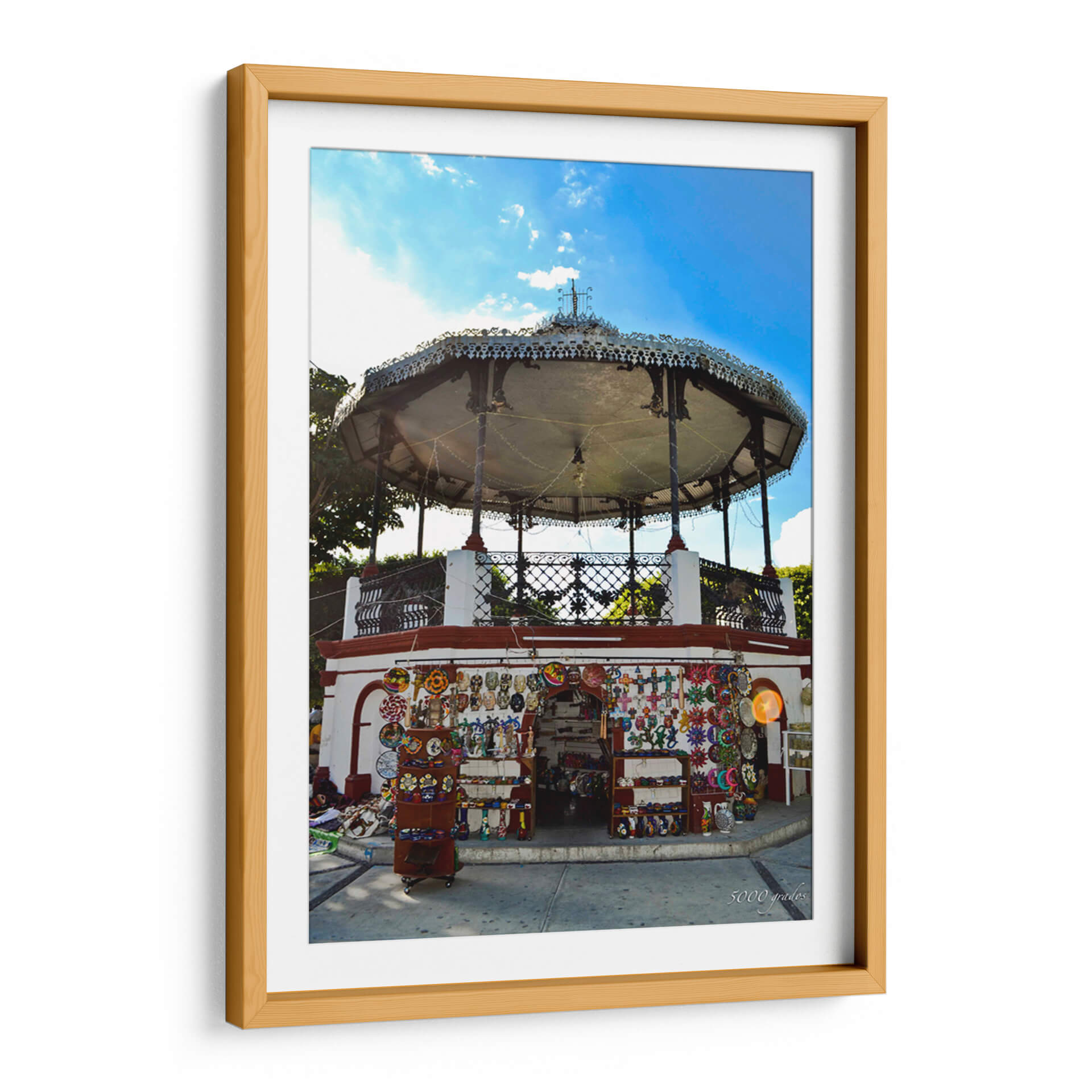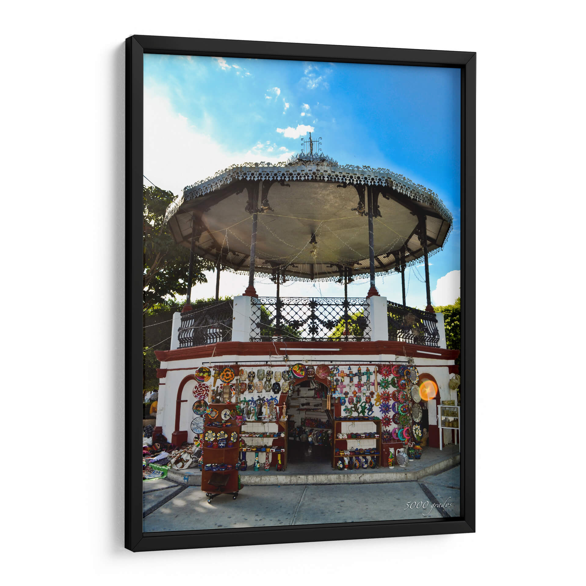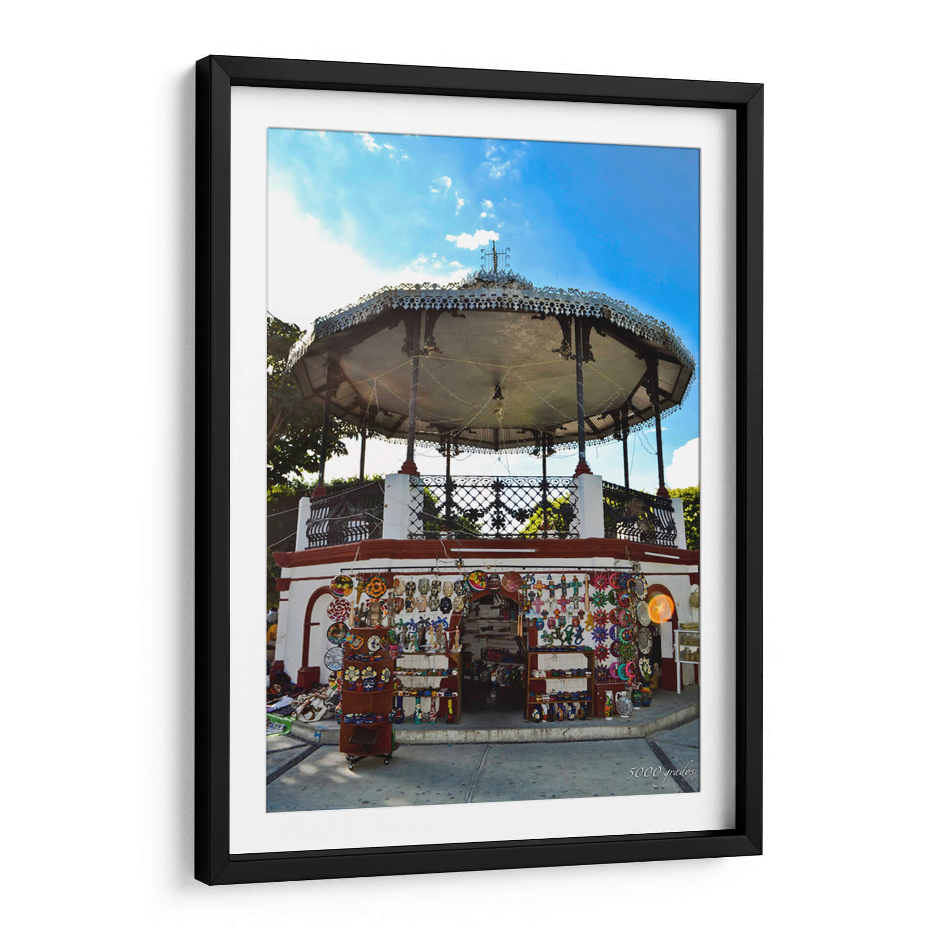 Captura la vibrante esencia de México con este cautivador cuadro decorativo que inmortaliza un quiosco rebosante de artesanías locales. La obra, titulada 'Quiosco con artesanias mexicanas' por 5000 grados, te transporta a un mercado tradicional bajo un cielo azul intenso y nubes algodonosas. Observa la riqueza de detalles en las coloridas piezas expuestas: desde intrincados discos de talavera hasta figuras cerámicas y textiles vibrantes, cada elemento evoca la maestría artesanal y la calidez de la cultura mexicana. La arquitectura del quiosco, con sus columnas ornamentadas y techo intrincado, añade un toque de encanto histórico y rústico a la escena. La paleta de colores es un festín visual, dominada por los tonos tierra de la estructura, el azul profundo del cielo y una explosión de colores vivos provenientes de las artesanías. Este cuadro es ideal para infundir carácter y un espíritu bohemio a cualquier espacio, ya sea una sala de estar, un comedor o un estudio. Aporta una atmósfera de autenticidad, alegría y celebración de la herencia cultural a tus paredes, convirtiéndose en un punto focal que invita a la conversación y al disfrute de la belleza artesanal mexicana. Perfecto para amantes de la cultura, los viajes y el arte con alma.