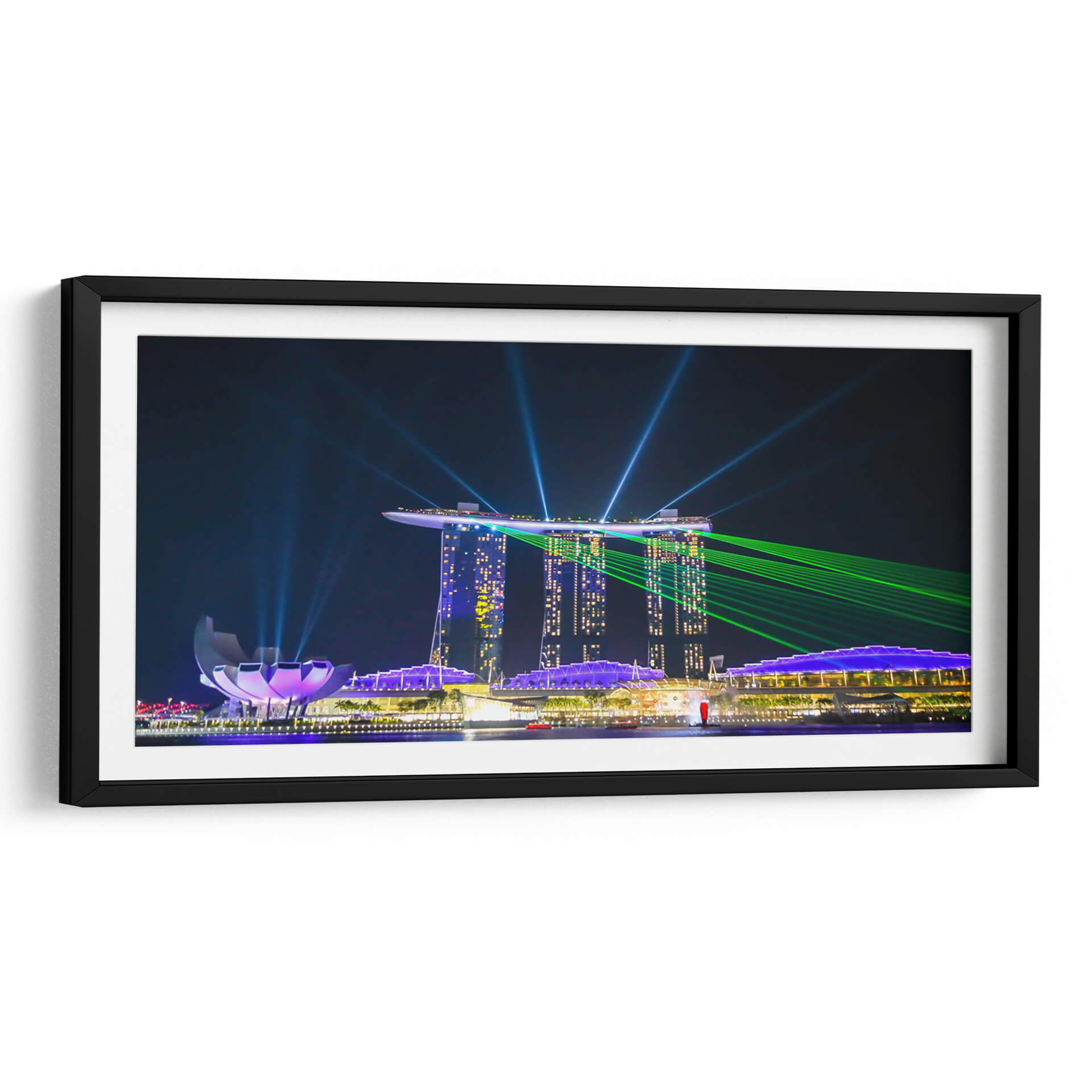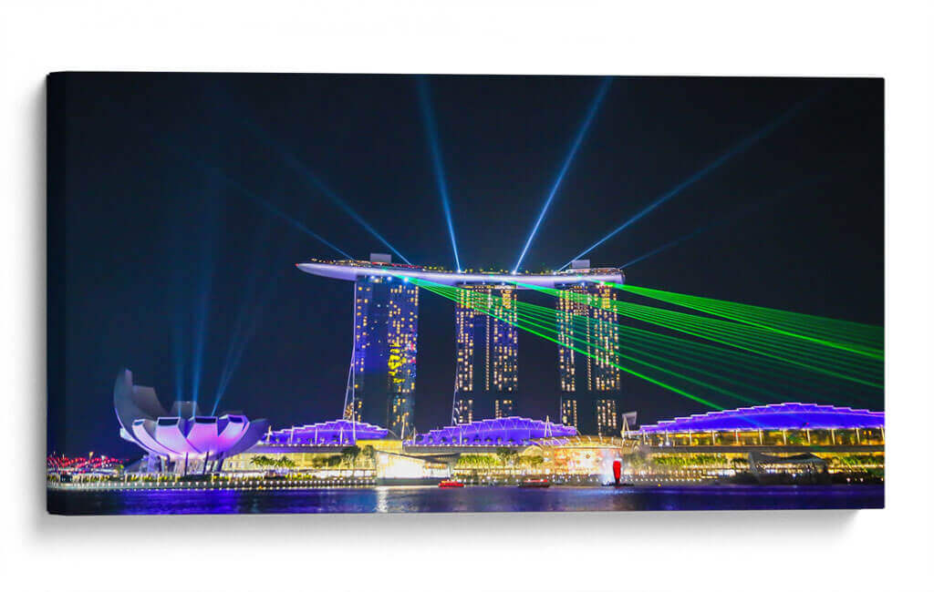Sumérgete en la vibrante energía nocturna de Singapur con este impresionante cuadro decorativo que captura el icónico espectáculo de luces del Marina Bay Sands Hotel. La obra de arte presenta una vista nocturna espectacular, donde rayos de luz azul y verde emergen de la arquitectura moderna, iluminando el cielo oscuro y reflejándose en las tranquilas aguas. Los edificios, adornados con miles de luces, crean un tapiz urbano deslumbrante, evocando una sensación de sofisticación y modernidad. Los tonos predominantes de azul profundo, verde eléctrico y toques de púrpura y amarillo vibrante generan una atmósfera cautivadora, perfecta para añadir un toque de dinamismo y elegancia a cualquier espacio. Este cuadro es ideal para salones modernos, oficinas ejecutivas o cualquier lugar que busque un punto focal audaz y contemporáneo. La composición captura la magnificencia de la ciudad-estado, invitando a la contemplación de la innovación y el esplendor urbano. Transforma tu hogar u oficina con esta pieza de arte digital que celebra la belleza de la arquitectura nocturna y la tecnología lumínica, ofreciendo una ventana a uno de los paisajes urbanos más fascinantes del mundo.