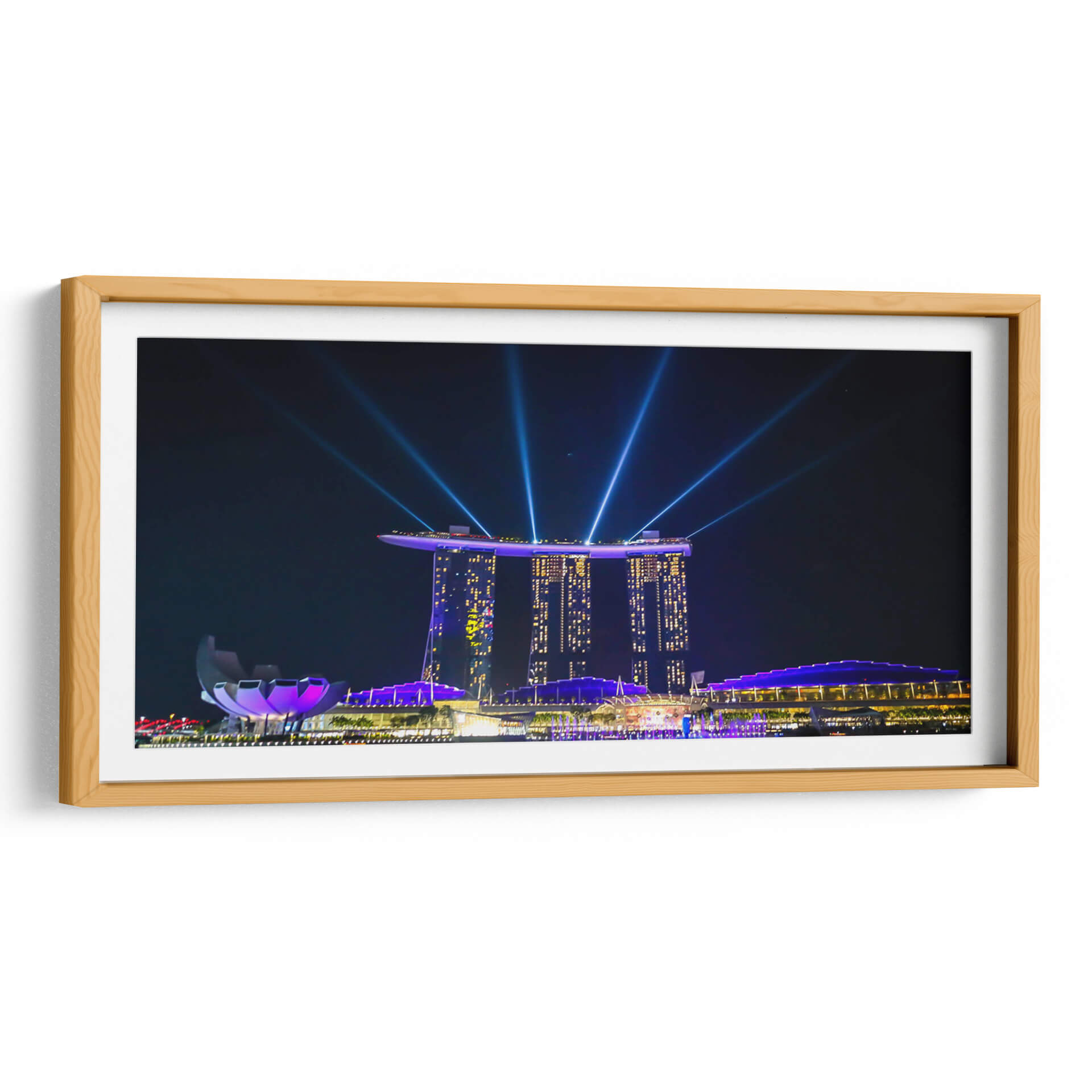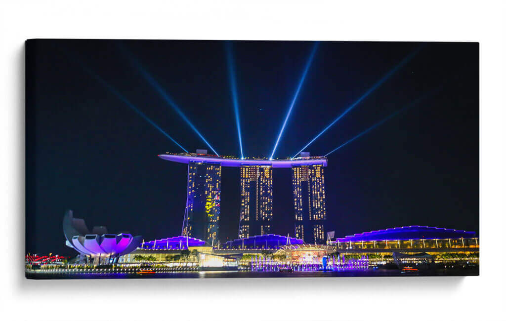 Sumérgete en la vibrante energía de Singapur con este espectacular cuadro decorativo nocturno. La obra captura la majestuosidad del icónico Marina Bay Sands, iluminado por un espectáculo de luces deslumbrante que atraviesa el cielo oscuro. Los haces de luz azul y los reflejos púrpuras crean una atmósfera futurista y emocionante, resaltando la arquitectura moderna y el dinamismo de la ciudad. Los detalles luminosos de los edificios contrastan con la profunda oscuridad de la noche, generando un efecto visual cautivador. Este cuadro es ideal para quienes buscan añadir un toque de sofisticación urbana y un punto focal de conversación a su sala de estar, oficina o cualquier espacio que desee una dosis de modernidad y energía. Su composición paisajística urbana nocturna evoca una sensación de asombro y aventura, transportando al espectador a una de las metrópolis más fascinantes del mundo. La paleta de colores, dominada por azules intensos, púrpuras eléctricos y destellos dorados de las luces, infunde una sensación de lujo y vanguardia. Perfecto para inspirar y transformar ambientes.