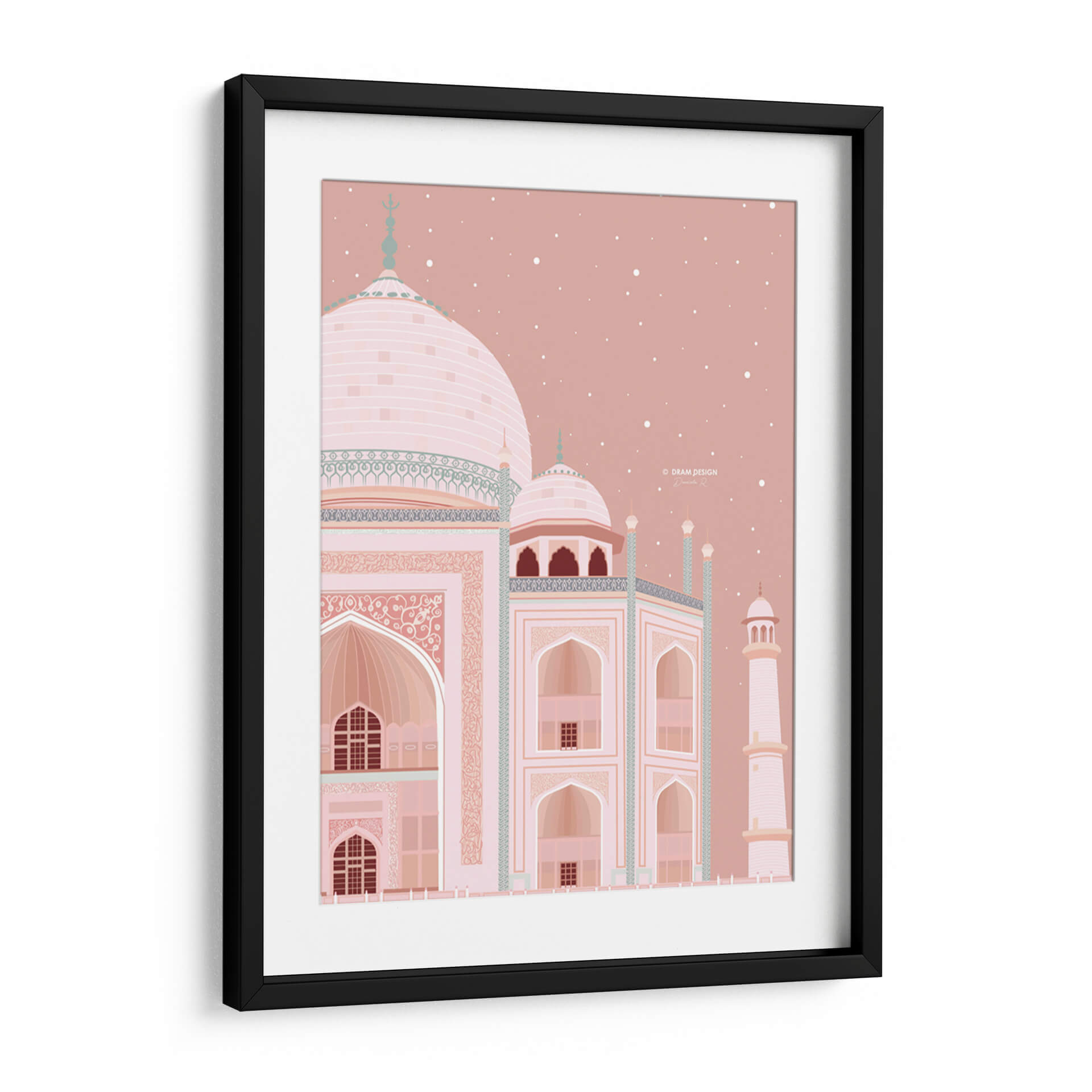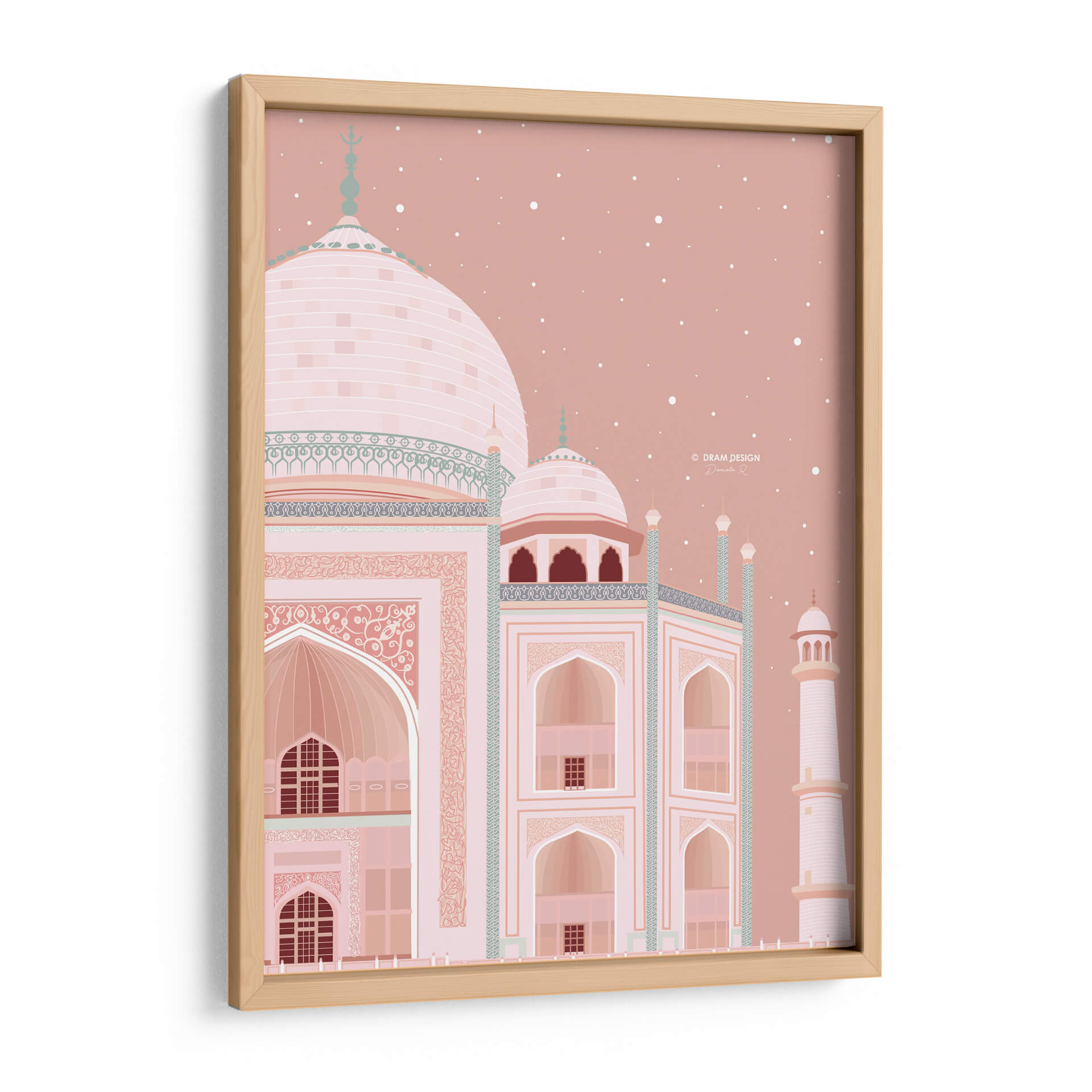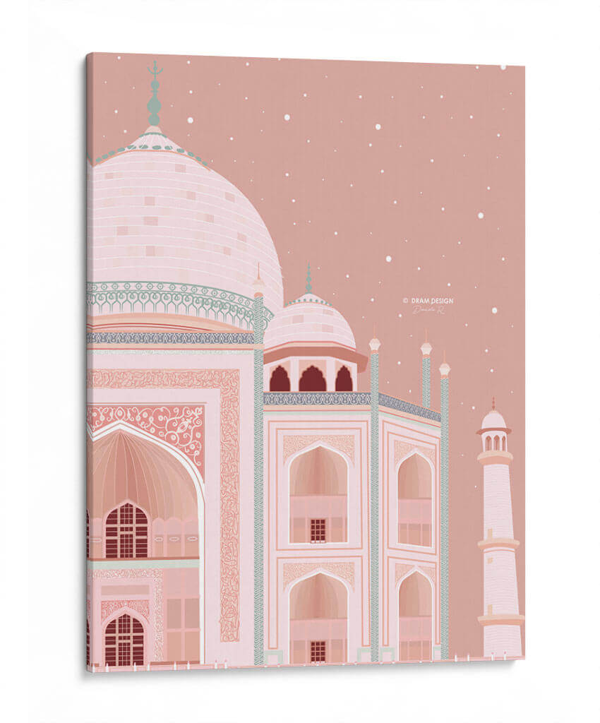 Sumérgete en la serena belleza del Taj Mahal reinventado con un toque etéreo en este cautivador cuadro decorativo. La obra maestra, titulada "Taj Mahal en rosa" por el artista DRAM, presenta una interpretación estilizada y moderna de la icónica maravilla arquitectónica. Los suaves tonos rosados y melocotón dominan la paleta de colores, creando una atmósfera de ensueño y tranquilidad. Delicados detalles en verde menta y blanco añaden un contraste sutil, realzando la intrincada arquitectura del mausoleo y sus minaretes. Las pequeñas motas dispersas por el fondo evocan una sensación de magia, como si la escena estuviera bañada por una luz celestial o cubierta por un velo de estrellas. El estilo minimalista y la composición equilibrada hacen de esta pieza una adición versátil para cualquier espacio, aportando un aire de sofisticación y calma. Ideal para salones, dormitorios o estudios, este cuadro decorativo invita a la contemplación y transporta al espectador a un lugar de paz y maravilla. Su diseño contemporáneo lo convierte en una elección perfecta para interiores modernos y eclécticos, añadiendo un punto focal artístico que inspira serenidad y elegancia. Descubre la magia de la India con esta interpretación única de un monumento histórico, transformado en una obra de arte evocadora y contemporánea.