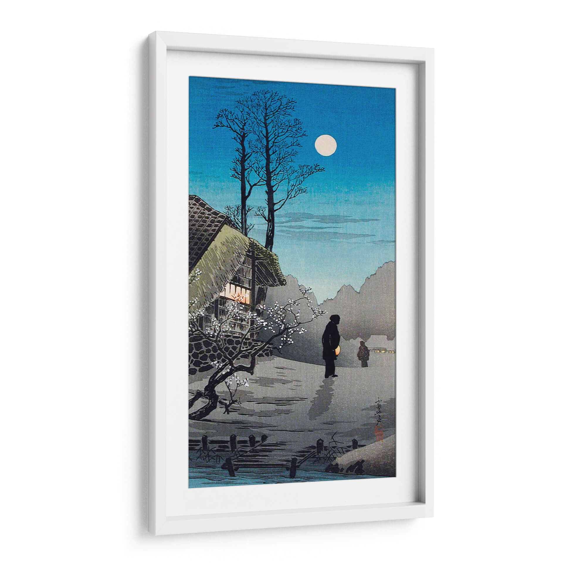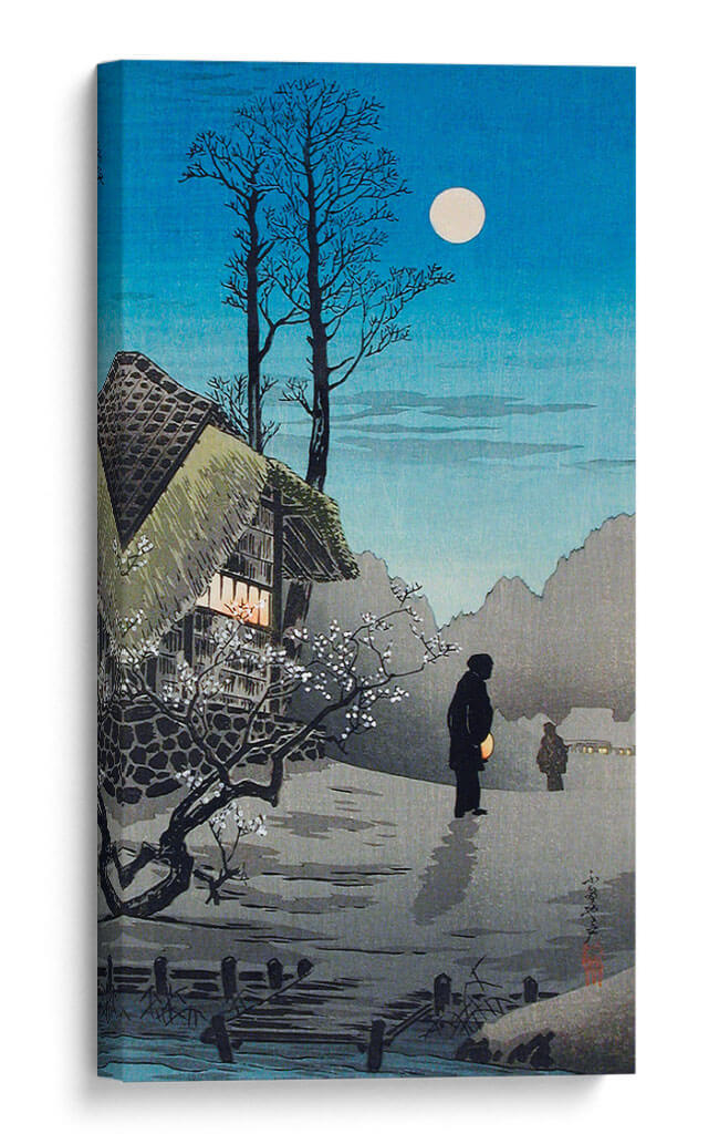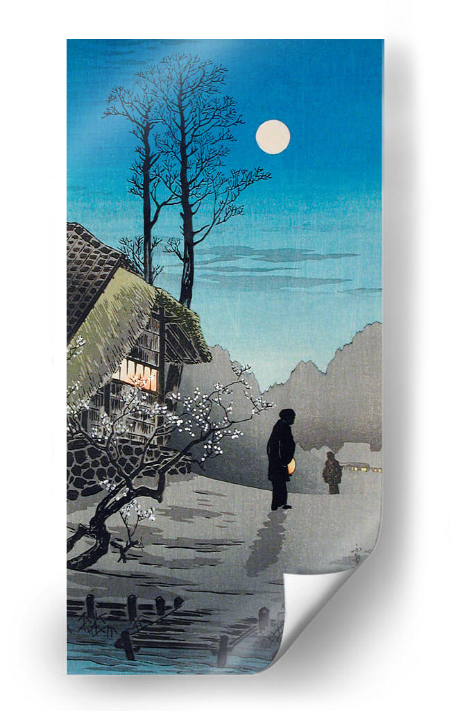 Sumérgete en la serena belleza de "Antigua posada", una obra maestra del artista Hiroaki Takahashi. Este cuadro decorativo captura un momento de tranquilidad invernal bajo un cielo estrellado y una luna llena que ilumina un paisaje nevado. Se observa una posada tradicional con techo de paja, de cuya ventana emana una cálida luz que contrasta con la fría atmósfera exterior. Dos figuras solitarias se adentran en la noche, añadiendo un toque de misterio y contemplación a la escena. Los árboles desnudos y la delicada floración de un cerezo en invierno crean una composición visualmente cautivadora, evocando la delicadeza de la naturaleza y la conexión humana. Los tonos azules profundos del cielo y los contrastes de luz y sombra invitan a la reflexión y la paz interior. Este cuadro es ideal para añadir un toque de elegancia y serenidad a tu hogar u oficina, creando un ambiente de calma y sofisticación. Perfecto para amantes del arte japonés, paisajes serenos y escenas evocadoras que invitan a la introspección y la admiración por la belleza efímera de la vida y las estaciones.