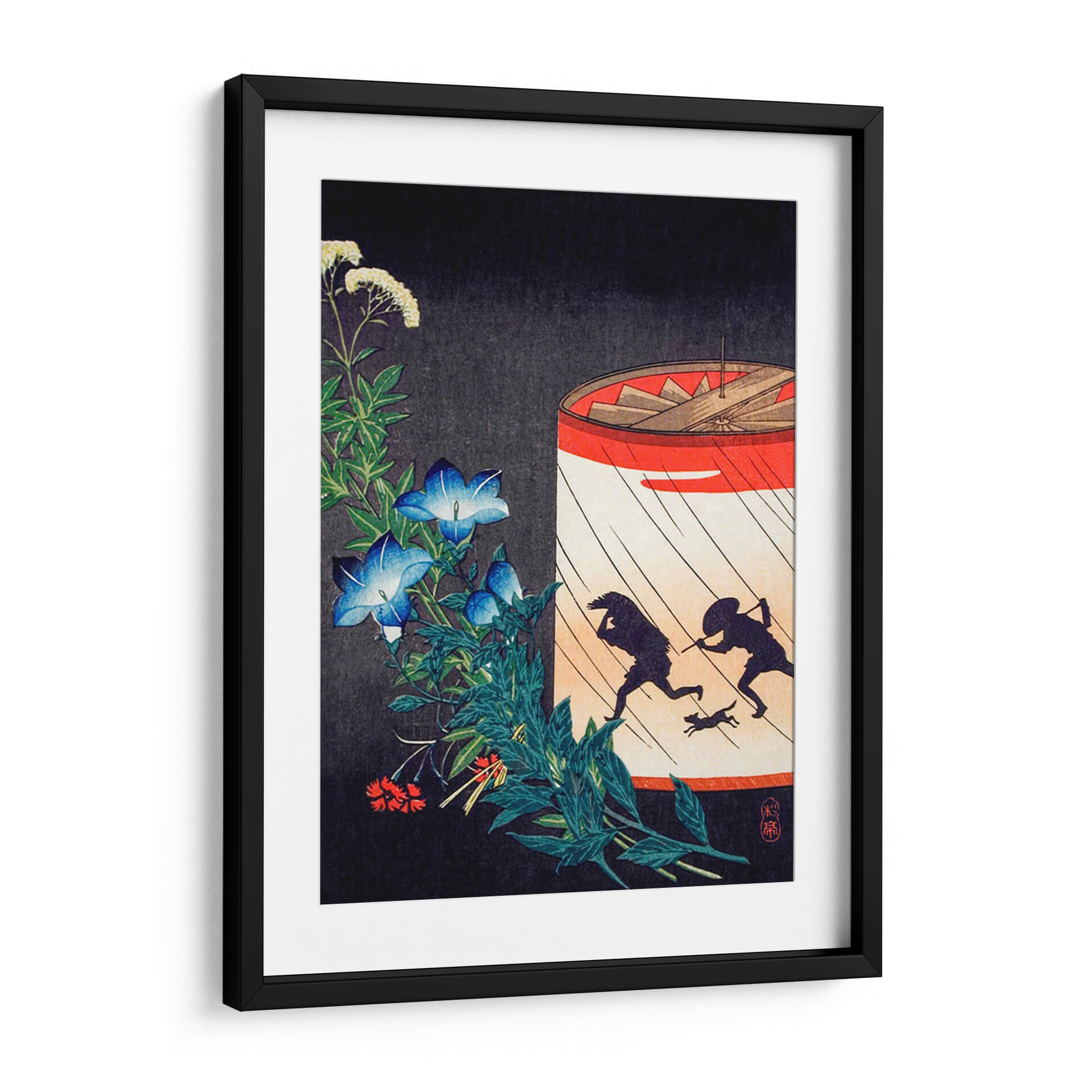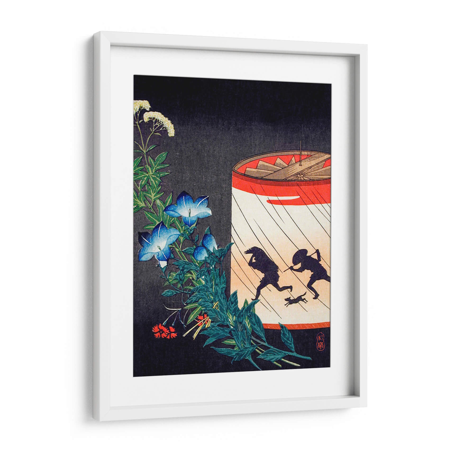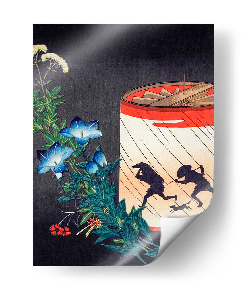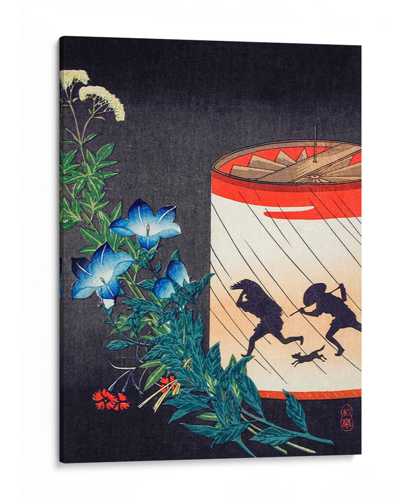 Sumérgete en la evocadora obra "Campanilla y Linterna" de Hiroaki Takahashi, una pieza que captura la esencia de un momento fugaz con una delicadeza excepcional. El cuadro presenta una vibrante explosión de campanillas azules y flores blancas delicadas, enmarcadas por un follaje verde exuberante que contrasta con un fondo oscuro y texturizado. En el lado derecho, una linterna circular con vivos detalles rojos y blancos ilumina una escena dinámica: dos siluetas humanas y un perro corren a través de lo que parecen ser gotas de lluvia. Esta composición, inspirada en el arte tradicional japonés Ukiyo-e, combina la serenidad de la naturaleza con la narración visual de una escena en movimiento, creando una atmósfera de intriga y belleza efímera. Los tonos azules profundos de las flores, el verde intenso de las hojas y los vibrantes acentos rojos y naranjas de la linterna se equilibran magistralmente, ofreciendo un punto focal cautivador. Este cuadro decorativo es ideal para añadir un toque de elegancia y misterio a cualquier hogar u oficina, transformando un espacio ordinario en un rincón de contemplación artística. Perfecto para quienes aprecian el arte japonés, la naturaleza y las narrativas visuales sutiles.