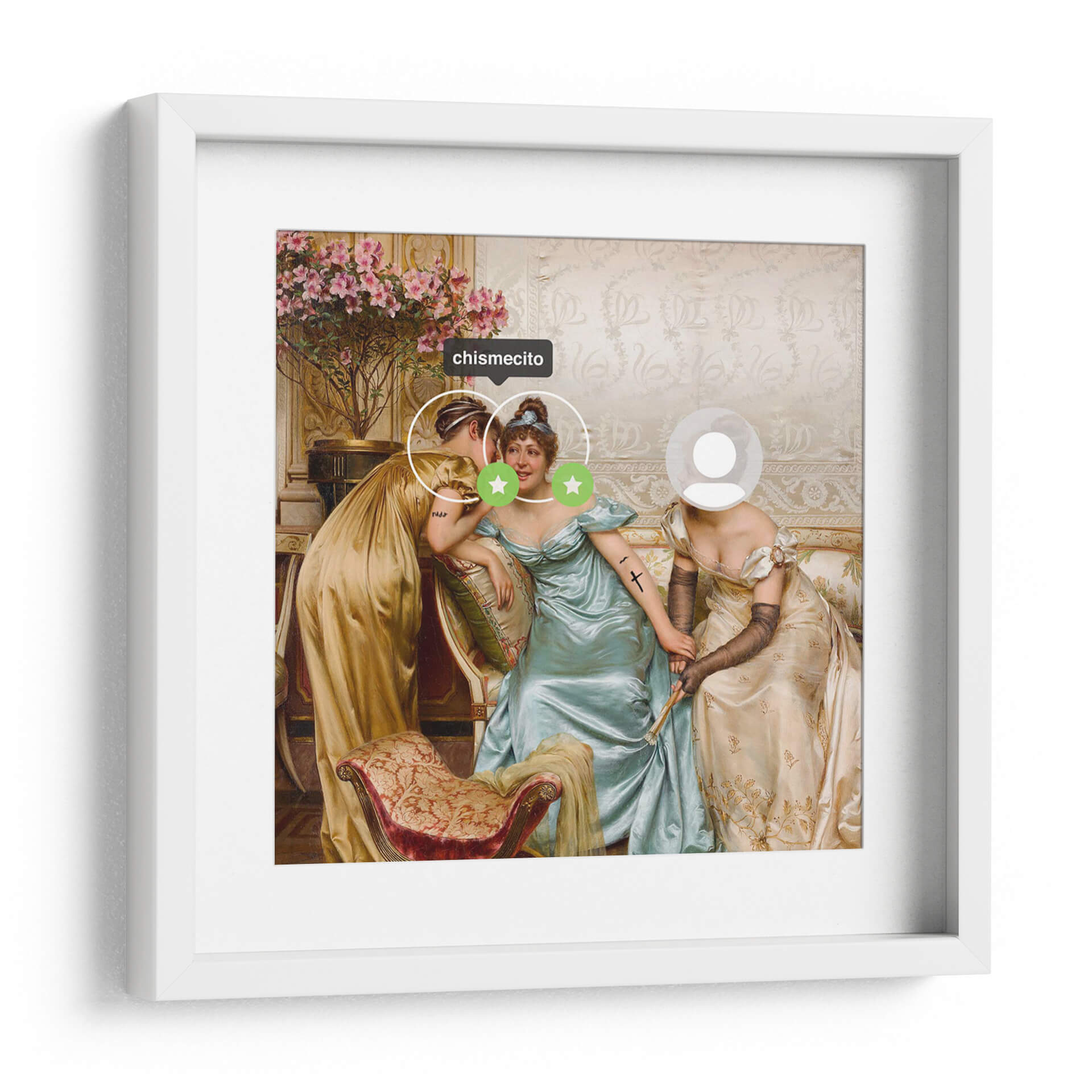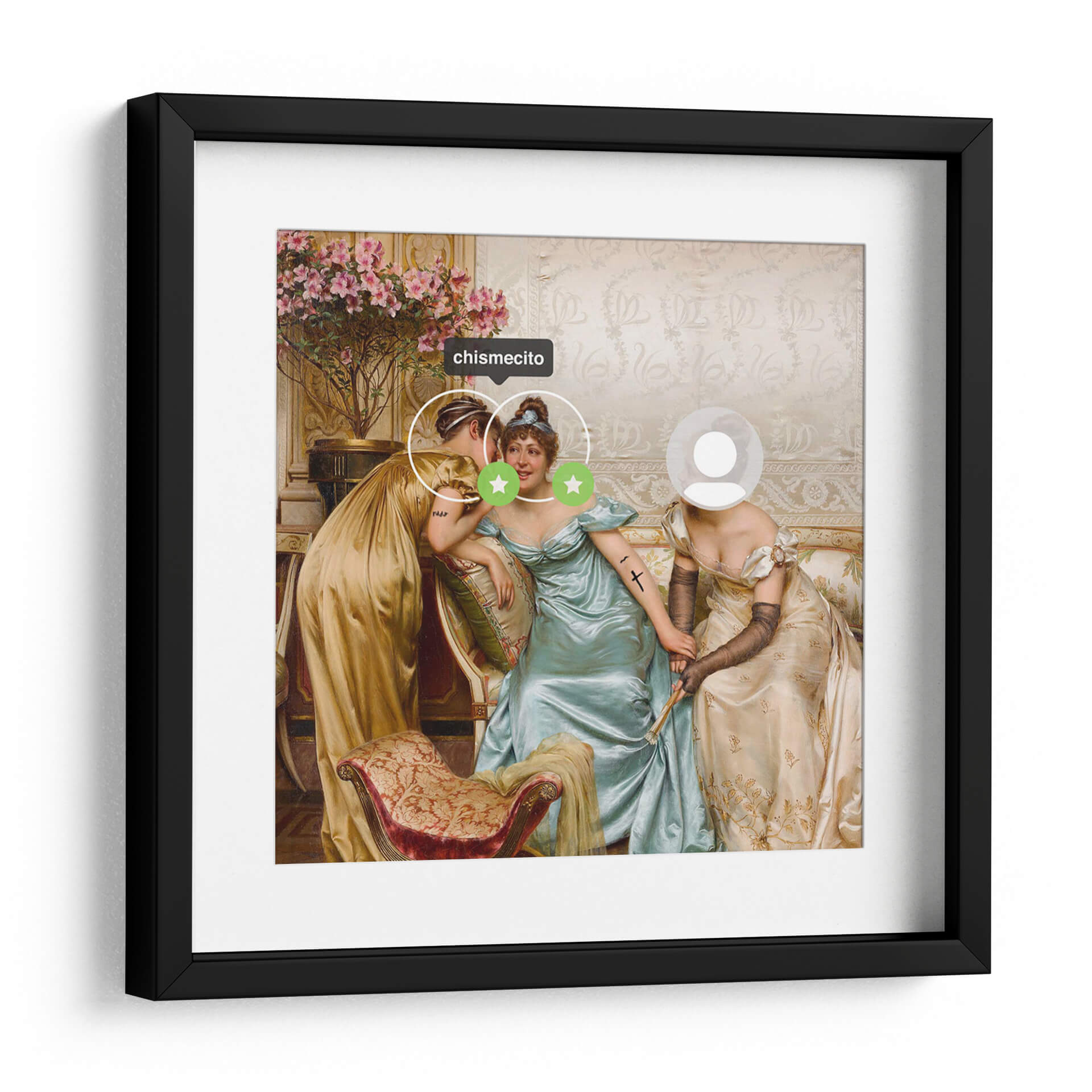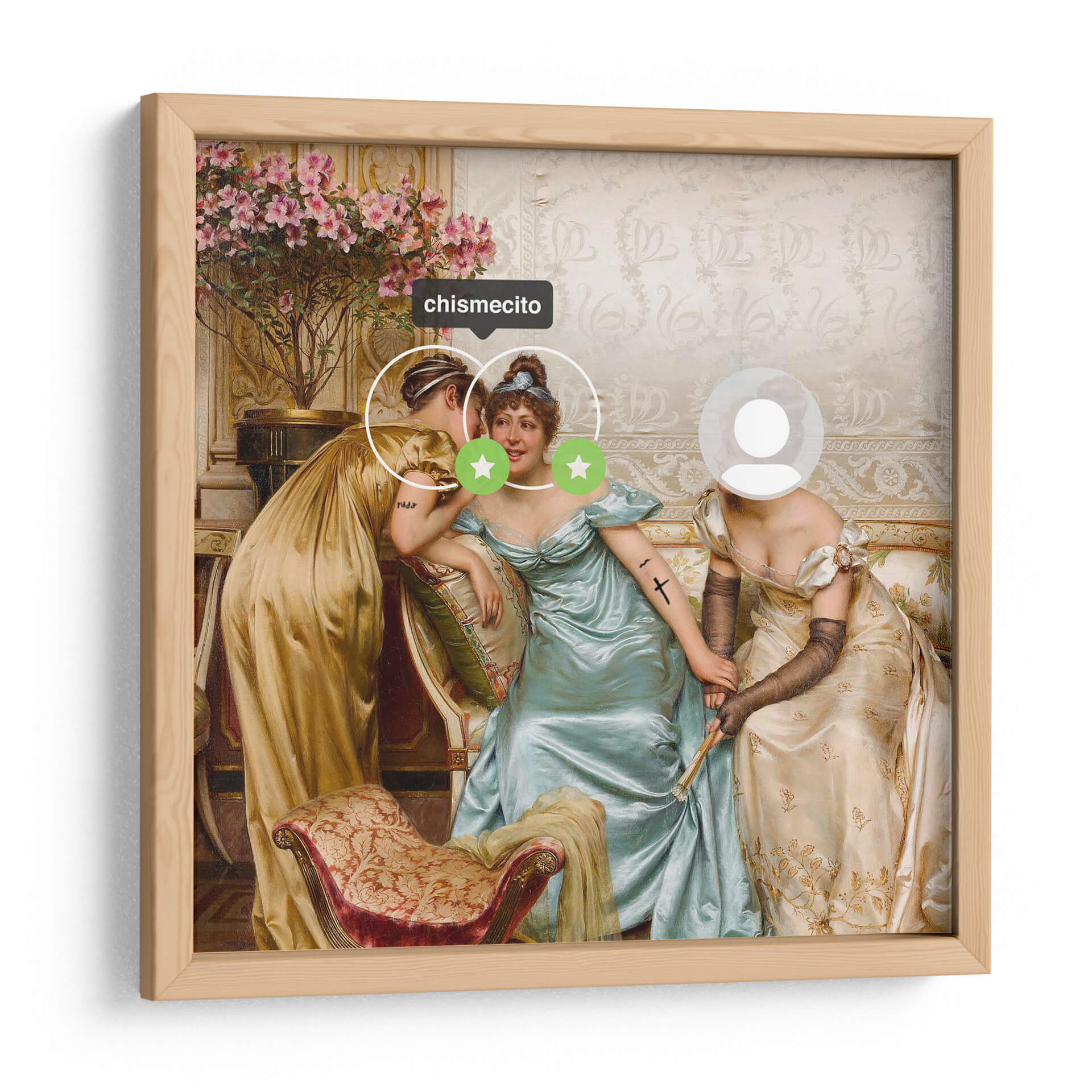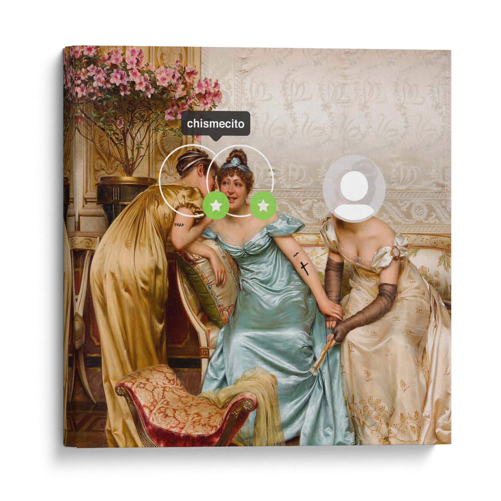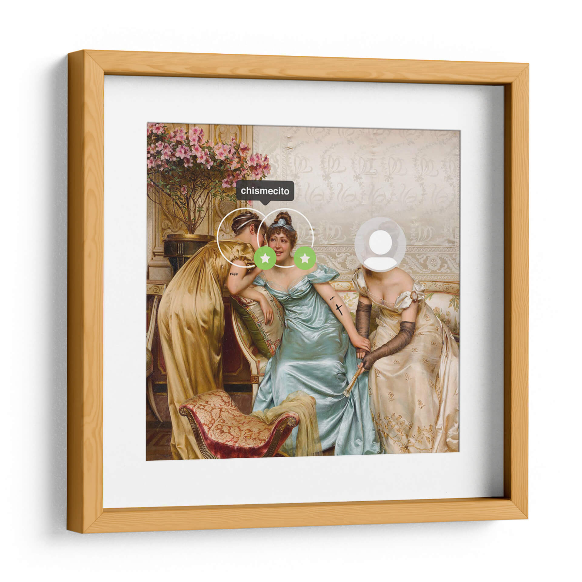 Sumérgete en el encanto del "Chismecito Close Friends", una obra maestra del artista ruda que captura un momento íntimo y juguetón entre tres mujeres. La pintura evoca una atmósfera de camaradería y secretos compartidos, representada con una paleta de colores sutiles y elegantes que resaltan la opulencia de los vestidos y el entorno. Los tonos dorados y pasteles se entrelazan con detalles delicados, creando una escena rica en texturas y matices. El estilo clásico, con influencias del realismo, da vida a las expresiones y gestos de las figuras, invitando al espectador a ser testigo de esta confidencia. Este cuadro decorativo es ideal para añadir un toque de sofisticación y conversación a tu sala de estar, estudio o incluso un dormitorio principal. Su capacidad para evocar intriga y elegancia lo convierte en una pieza de arte de pared que no solo embellece, sino que también inspira admiración y debate. Perfecto para quienes aprecian el arte que cuenta historias y celebra las conexiones humanas, "Chismecito Close Friends" es una adición cautivadora a cualquier colección de decoración interior moderna o tradicional.