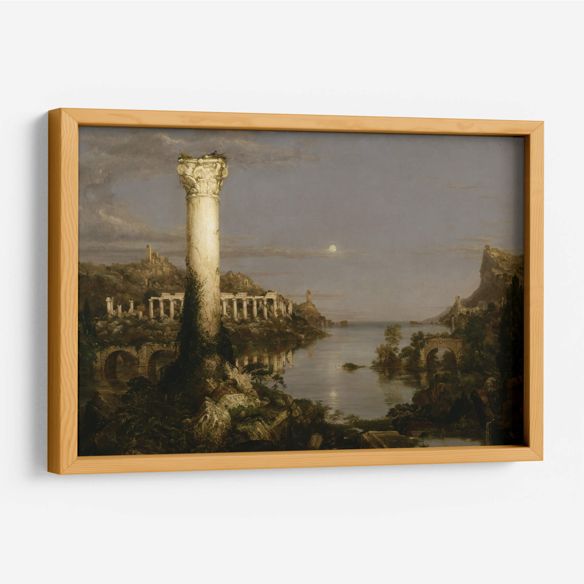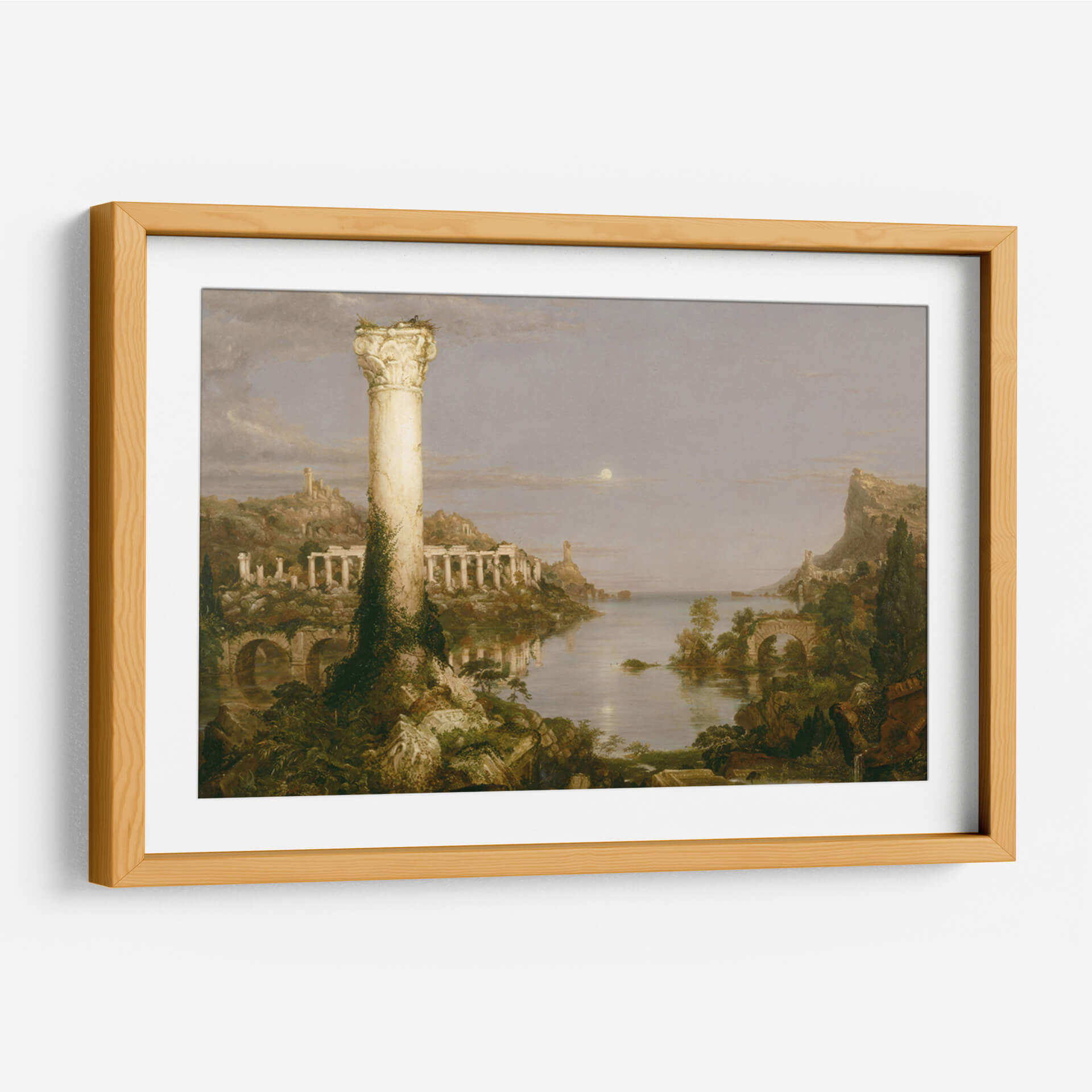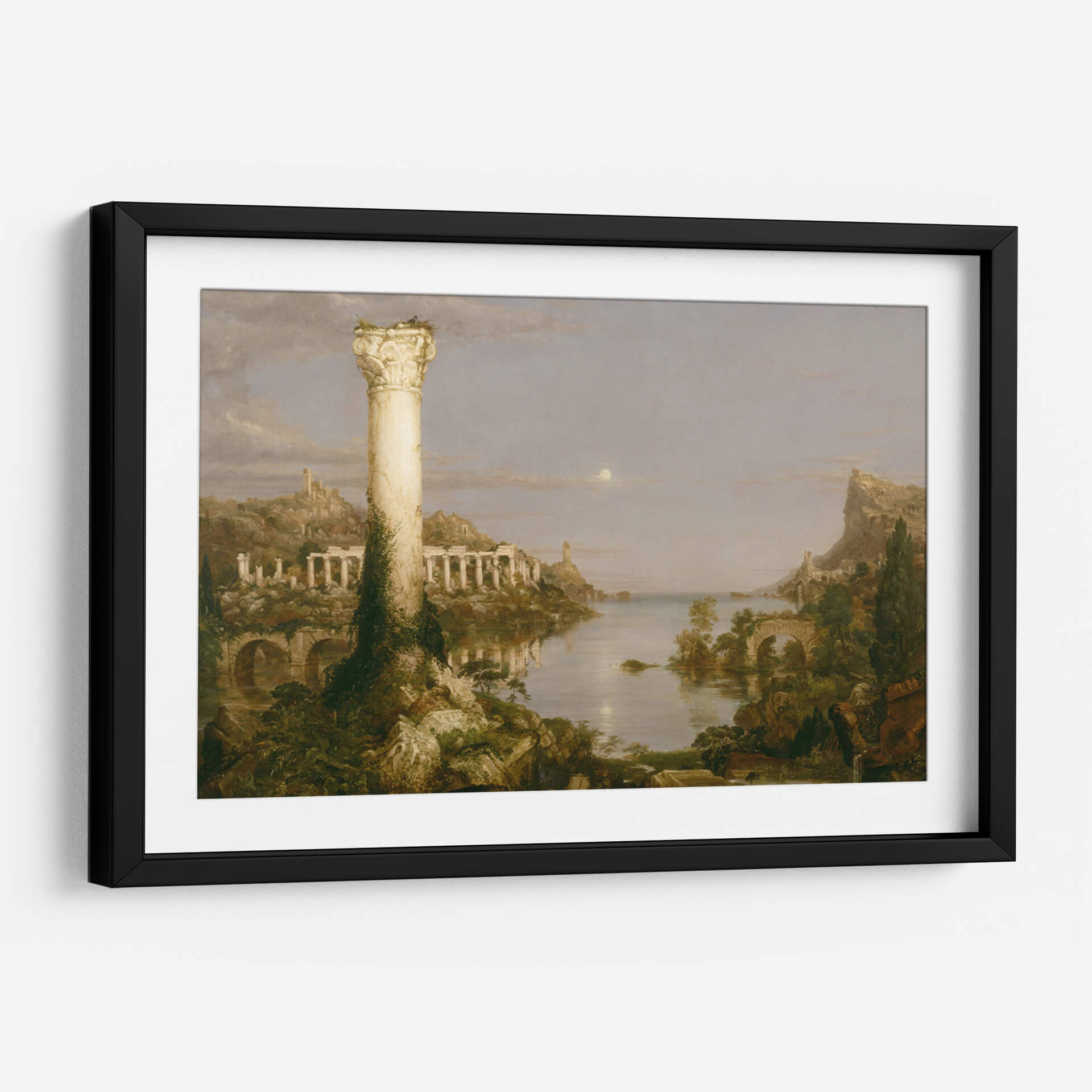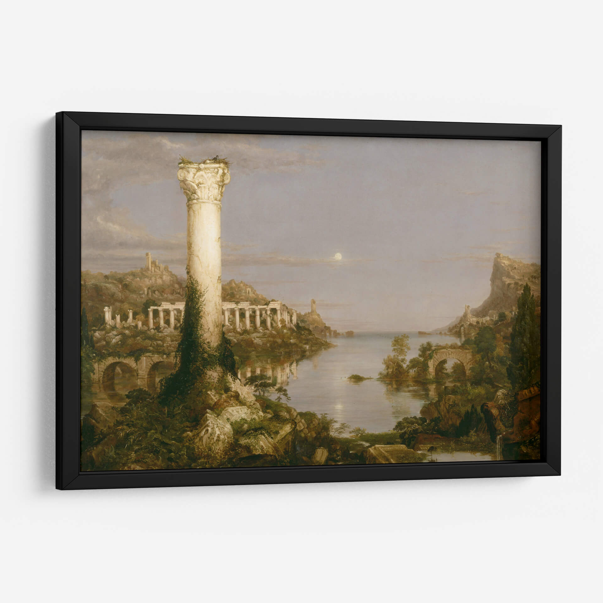 Sumérgete en la melancolía y la grandiosidad de "El Curso del Imperio: Desolación", una obra maestra del arte de Thomas Cole. Este cuadro decorativo captura la esencia de un paisaje arruinado, donde vestigios de una civilización antigua yacen junto a aguas serenas y una luna pálida en el cielo crepuscular. La paleta de colores, dominada por tonos tierra, verdes apagados y grises sutiles, crea una atmósfera de introspección y contemplación. El imponente primer plano de una columna corintia, cubierta de vegetación, dialoga con las ruinas de acueductos y edificios a lo lejos, invitando a reflexionar sobre el paso del tiempo y la fugacidad de los imperios. La composición, con el agua reflejando la luz tenue, añade una cualidad etérea a la escena. Ideal para quienes buscan infundir un sentido de historia, reflexión o un toque dramático a su hogar u oficina, este cuadro es una invitación a meditar sobre la belleza de lo efímero y la persistencia de la naturaleza sobre las creaciones humanas. Transforma tu espacio con esta pieza evocadora que promete ser un tema de conversación y una fuente de inspiración diaria.