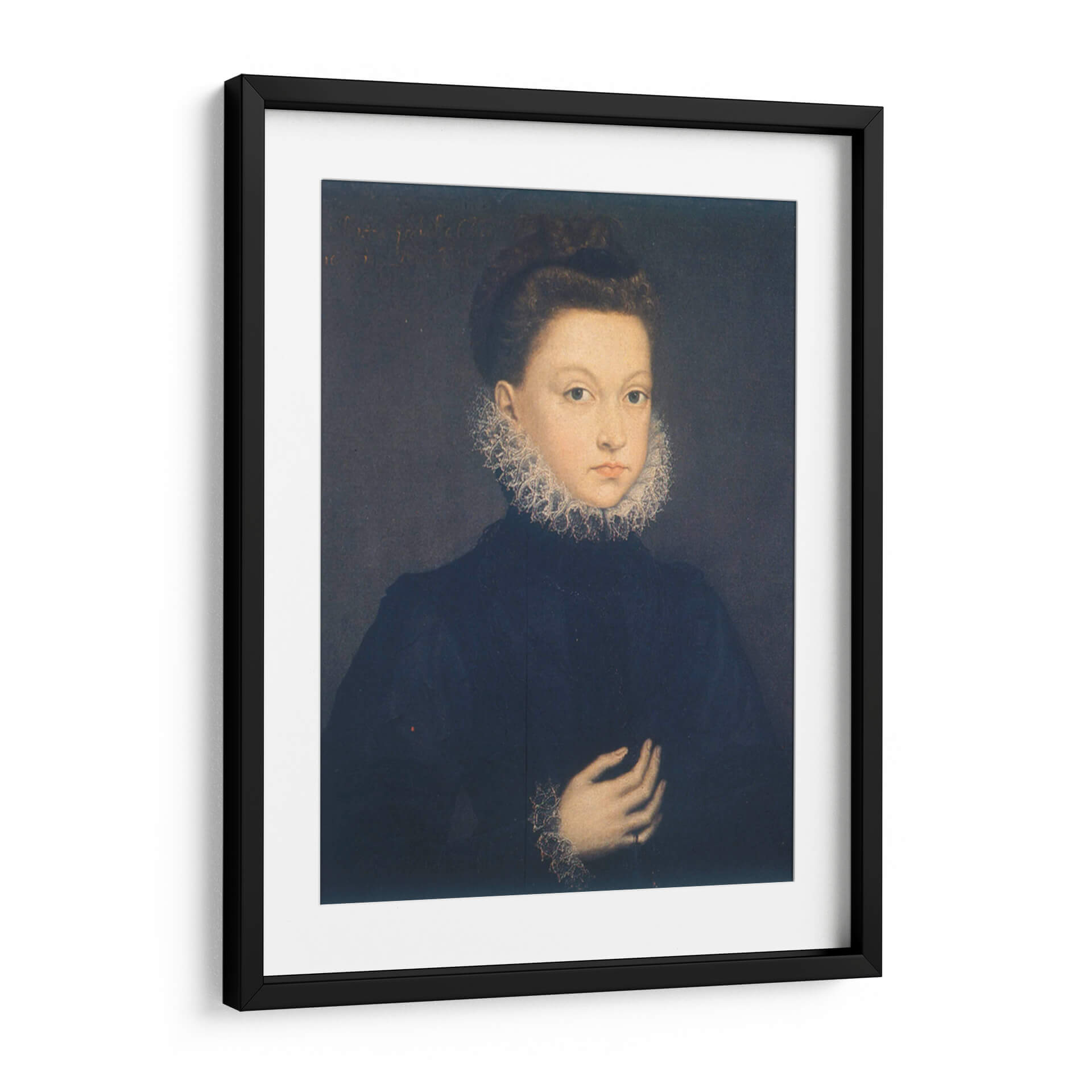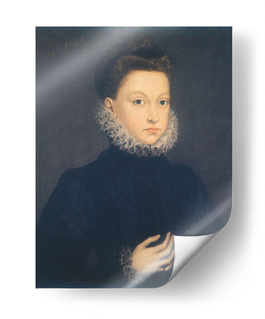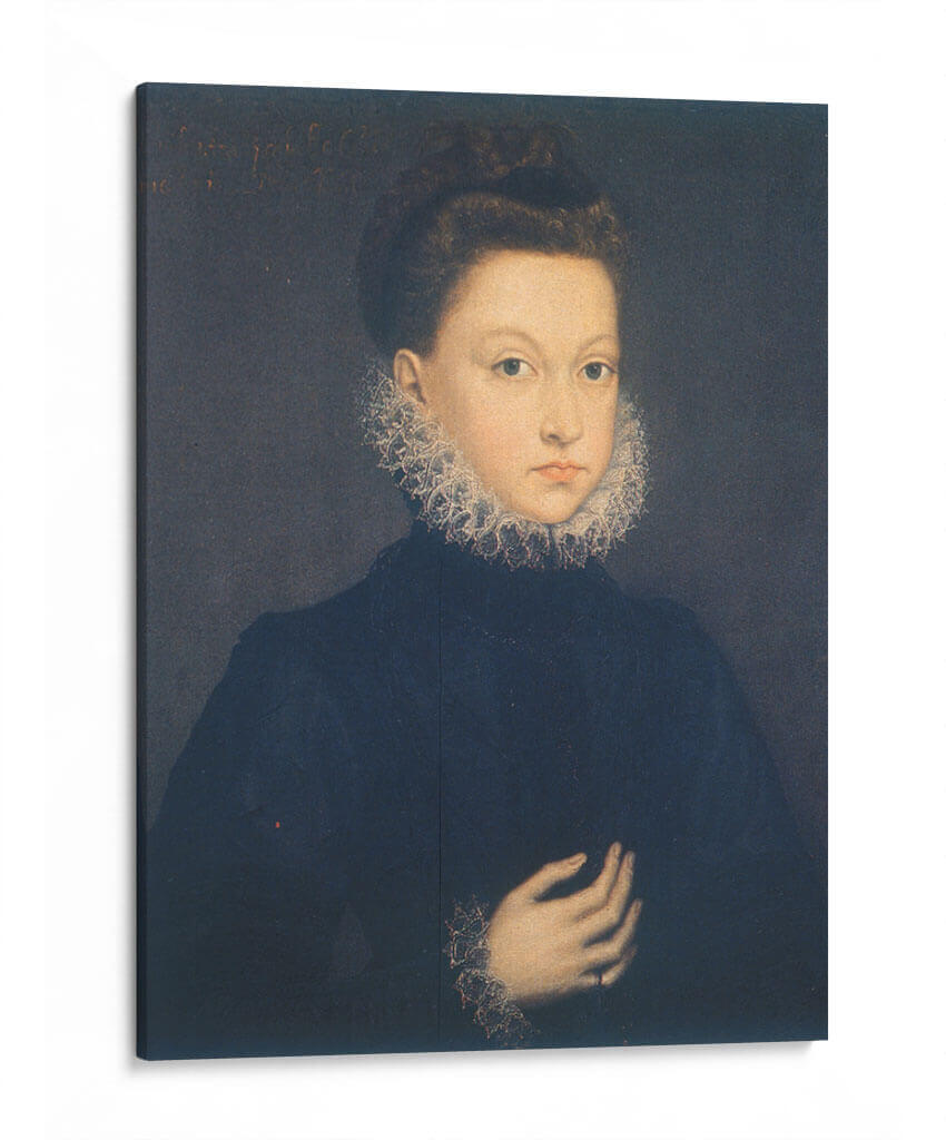 Sumérgete en la elegancia atemporal con este cautivador cuadro decorativo de "Infanta Isabel Clara Eugenia", una obra maestra inspirada en el estilo de Sofonisba Anguissola. La pieza presenta un retrato íntimo de una joven figura noble, destacando su mirada directa y serena, enmarcada por un elaborado cuello de encaje que evoca la opulencia y la delicadeza de la época. La paleta de colores se centra en tonos oscuros y profundos, con el azul marino del vestido contrastando sutilmente con la luminosidad del rostro y los detalles del atuendo, creando una atmósfera de sofisticación y misterio. La composición clásica, con la figura ocupando el centro, dirige la atención del espectador hacia la expresión y los gestos sutiles de la infanta. Este cuadro decorativo es ideal para añadir un toque de historia y refinamiento a cualquier espacio, desde un estudio hasta una sala de estar, convirtiéndose en un punto focal que invita a la contemplación y al diálogo. Transforma tu hogar u oficina con esta pieza que celebra la maestría del retrato renacentista y la belleza clásica.