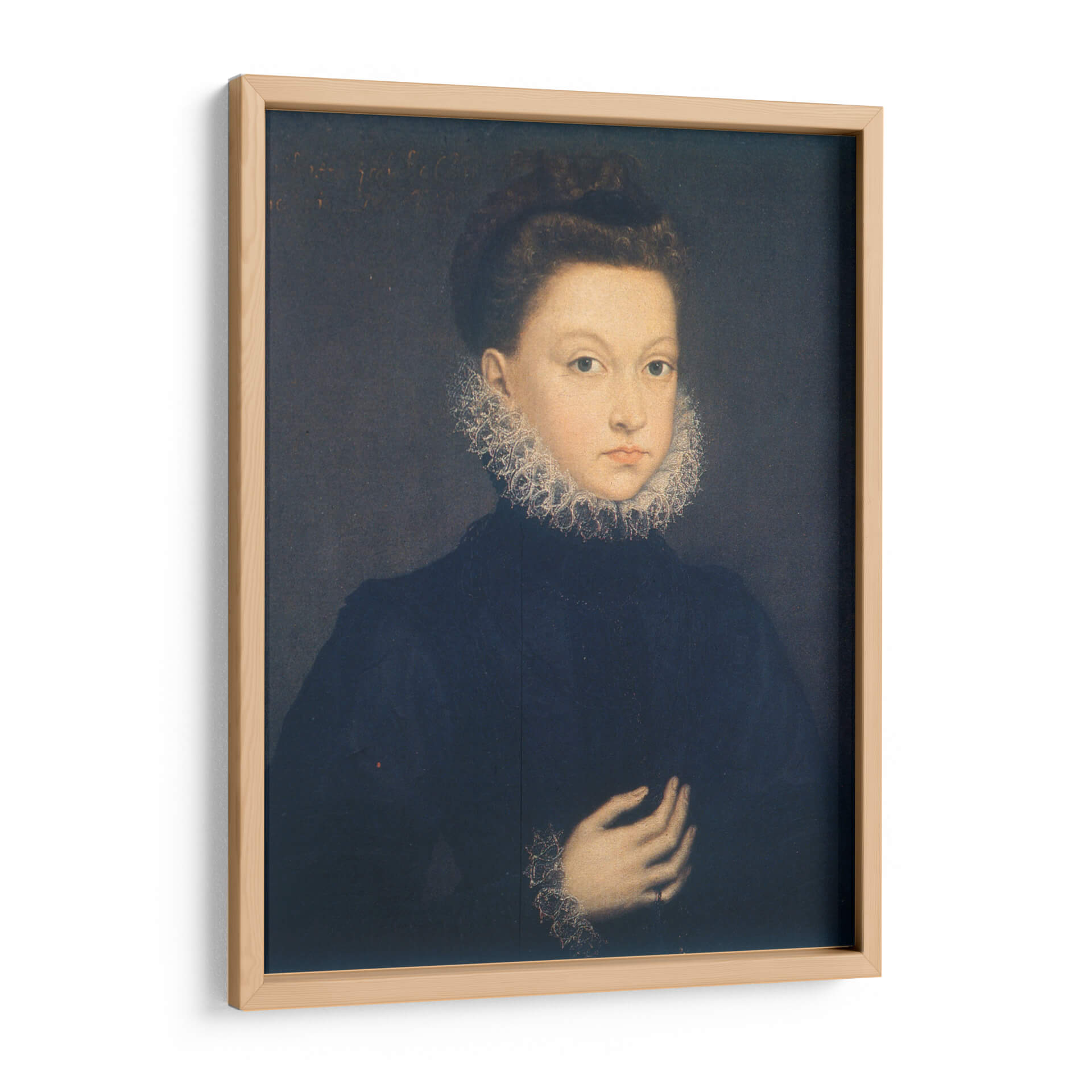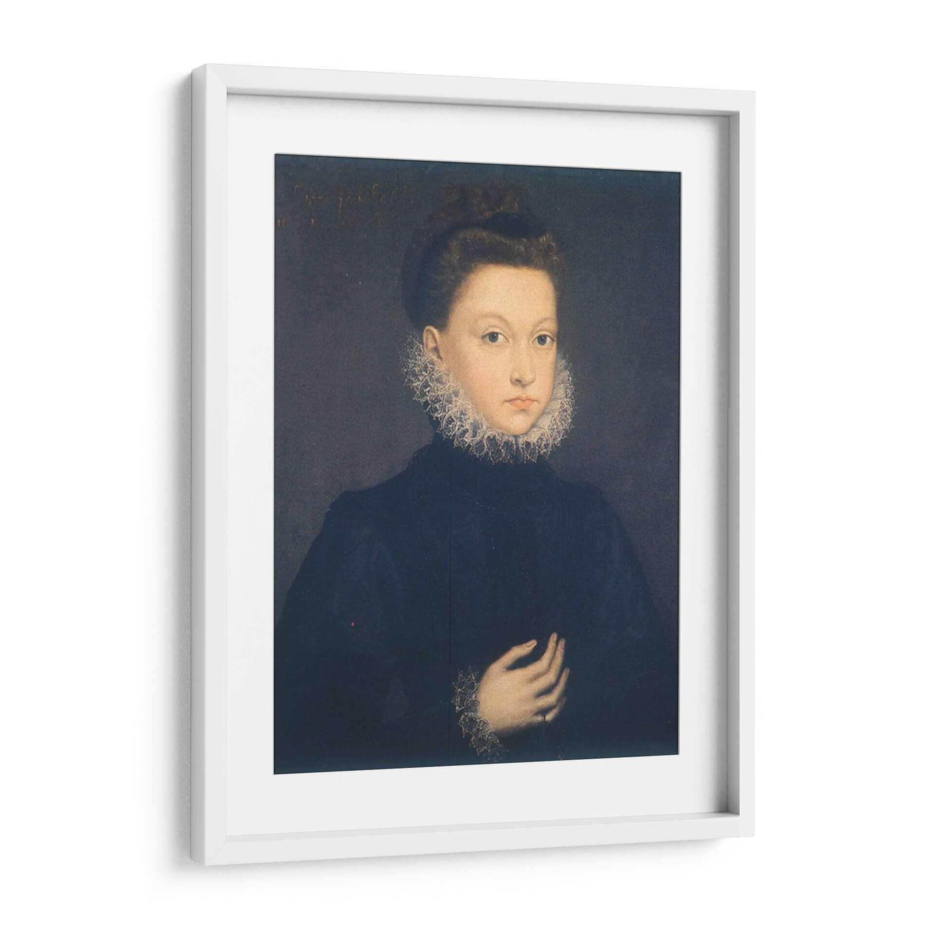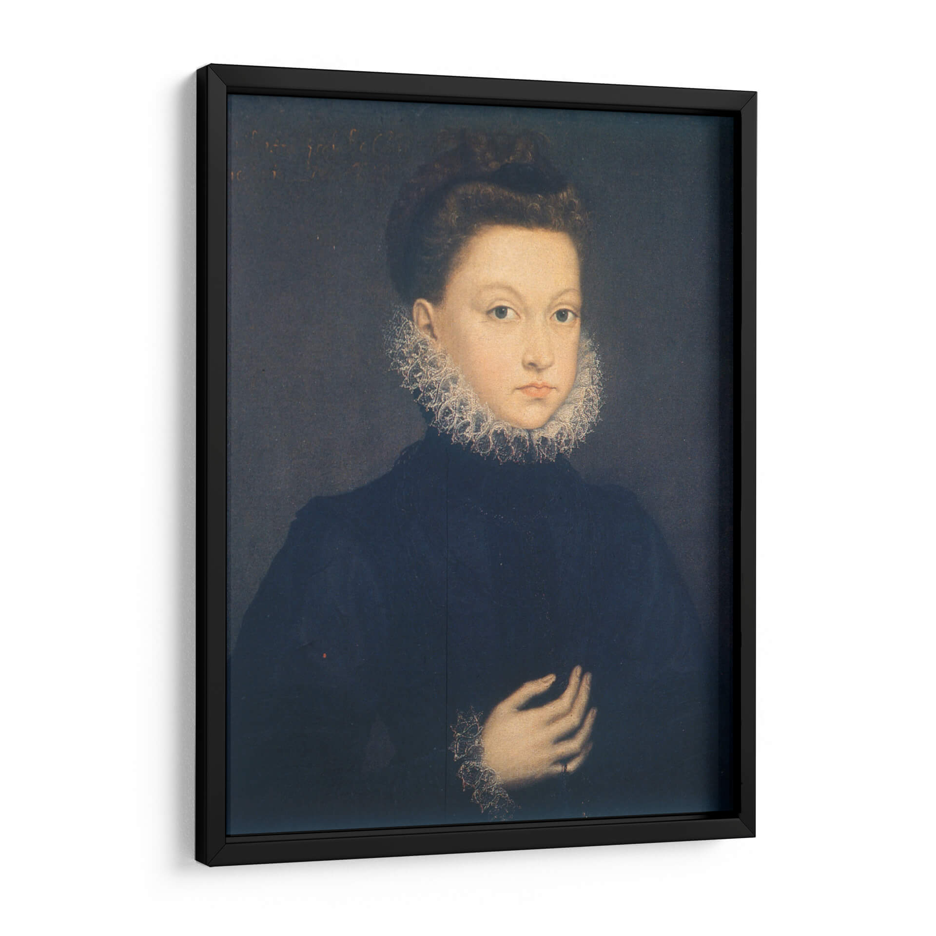 Sumérgete en la elegancia atemporal con este cautivador cuadro decorativo de "Infanta Isabel Clara Eugenia", una obra maestra inspirada en el estilo de Sofonisba Anguissola. La pieza presenta un retrato íntimo de una joven figura noble, destacando su mirada directa y serena, enmarcada por un elaborado cuello de encaje que evoca la opulencia y la delicadeza de la época. La paleta de colores se centra en tonos oscuros y profundos, con el azul marino del vestido contrastando sutilmente con la luminosidad del rostro y los detalles del atuendo, creando una atmósfera de sofisticación y misterio. La composición clásica, con la figura ocupando el centro, dirige la atención del espectador hacia la expresión y los gestos sutiles de la infanta. Este cuadro decorativo es ideal para añadir un toque de historia y refinamiento a cualquier espacio, desde un estudio hasta una sala de estar, convirtiéndose en un punto focal que invita a la contemplación y al diálogo. Transforma tu hogar u oficina con esta pieza que celebra la maestría del retrato renacentista y la belleza clásica.