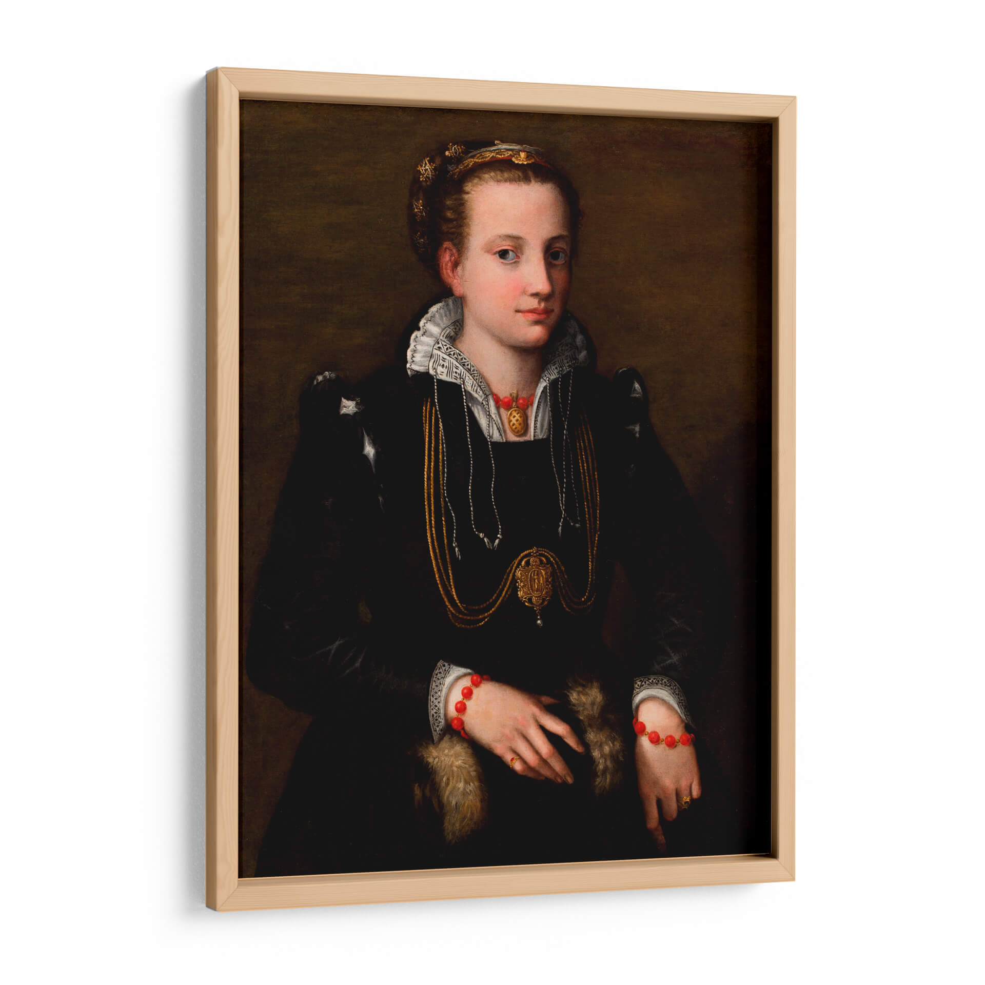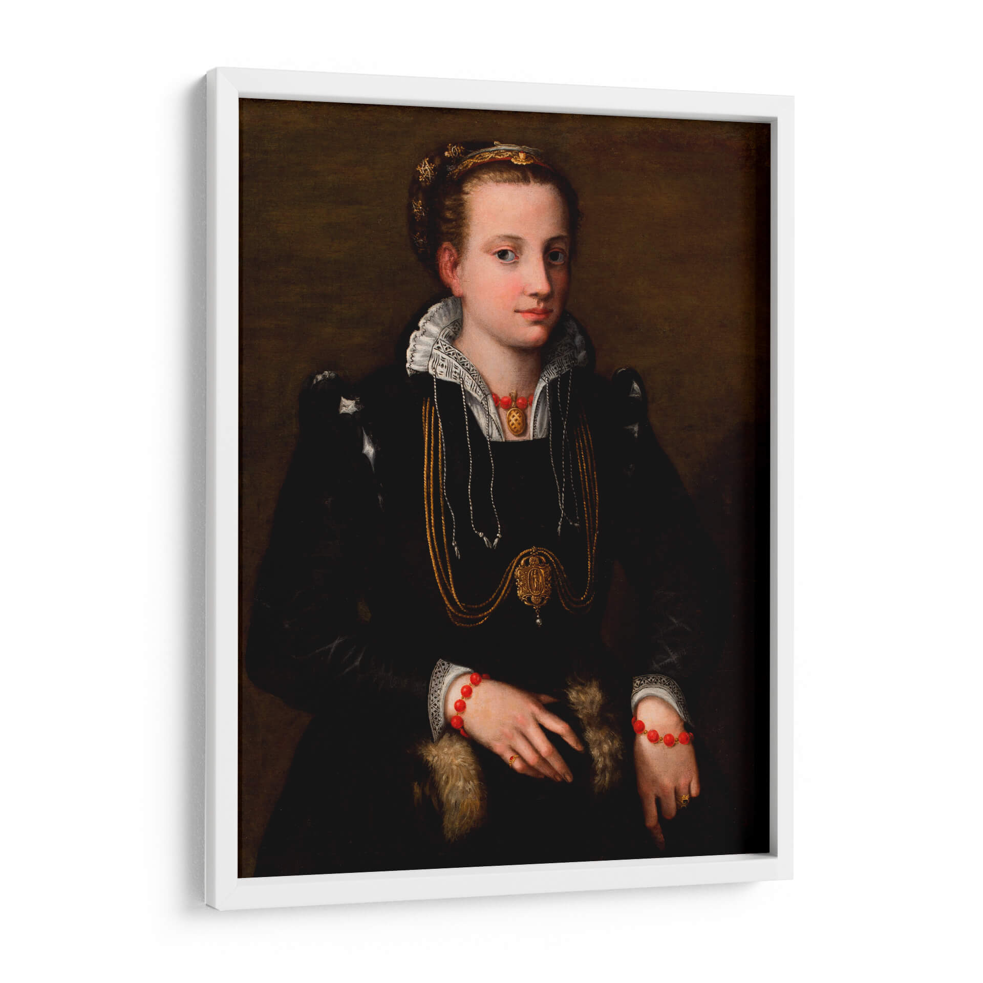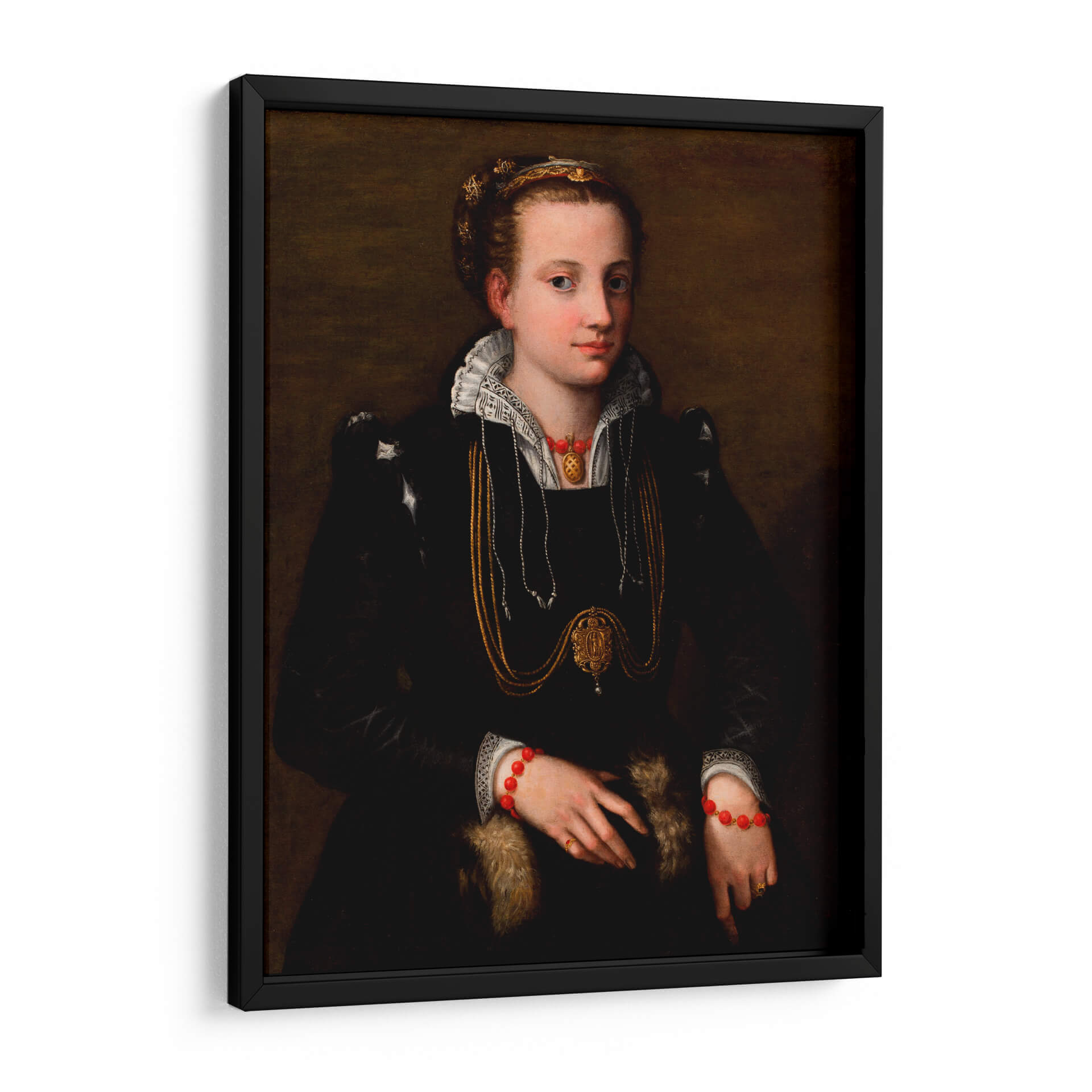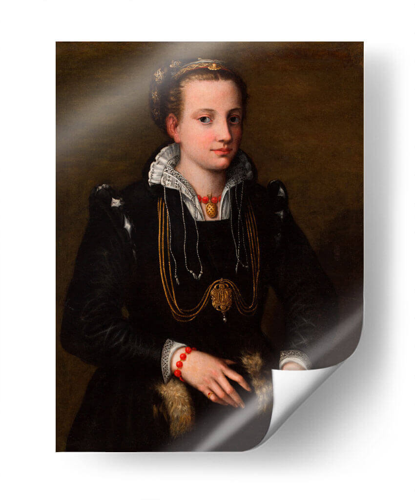 Sumérgete en la elegancia atemporal con este cautivador cuadro decorativo, una reproducción de "La hermana de la artista" de Sofonisba Anguissola. Esta obra maestra renacentista captura la esencia de una dama noble, con una mirada serena y una pose introspectiva que invitan a la contemplación. La rica paleta de colores, dominada por profundos tonos oscuros y acentuada por el brillo del oro en sus joyas y atuendo, crea una atmósfera de sofisticación y misterio. Los detalles intrincados del vestido, el cuello de encaje y las elaboradas joyas, incluyendo un llamativo collar y pulseras rojas, añaden un toque de opulencia. Este retrato es ideal para enriquecer salones, estudios o cualquier espacio que busque una dosis de historia y arte clásico. Su presencia aportará un aire de refinamiento y una conexión con el legado artístico, convirtiéndose en un punto focal de conversación y admiración. Una pieza que trasciende el tiempo, perfecta para los amantes del arte clásico y la decoración con carácter.