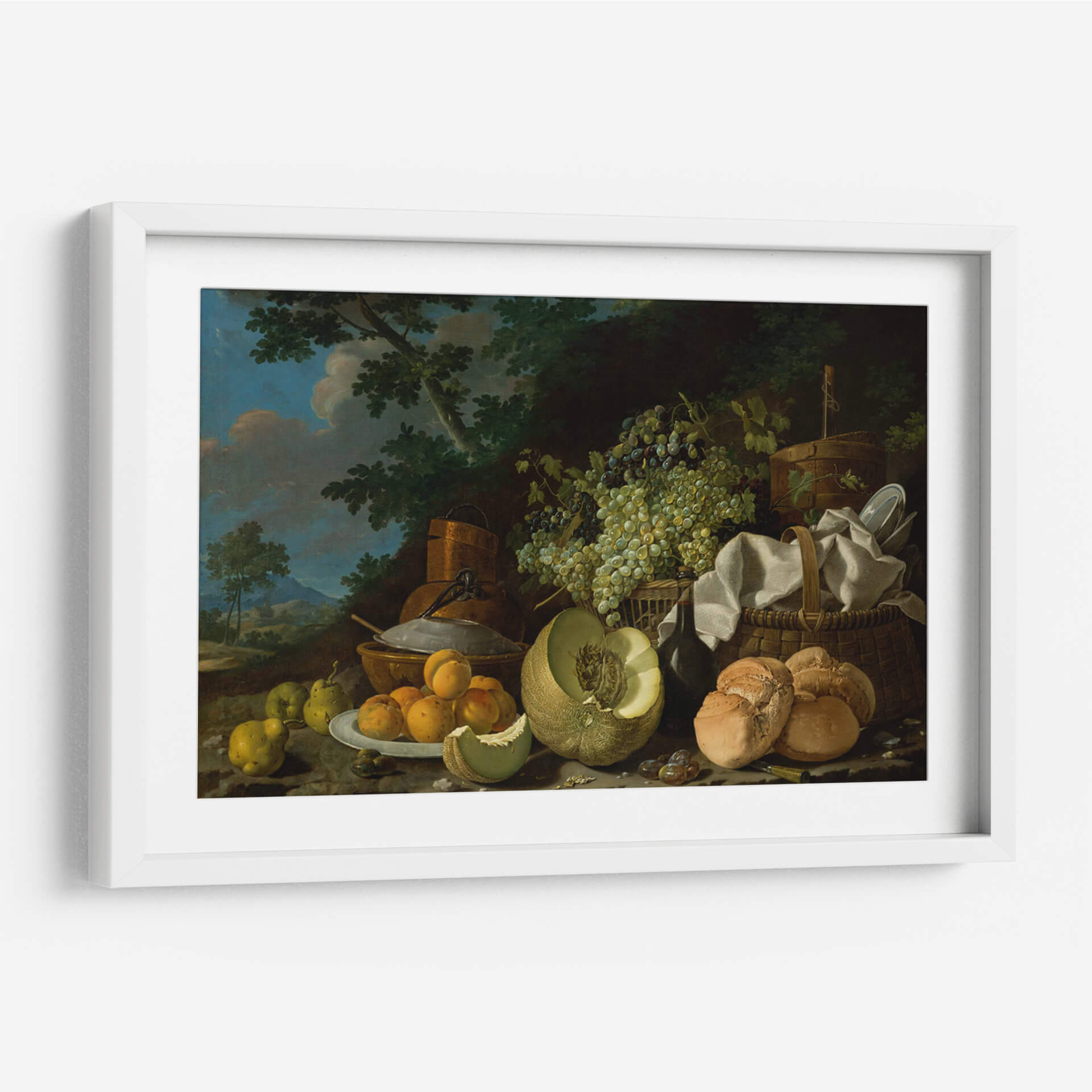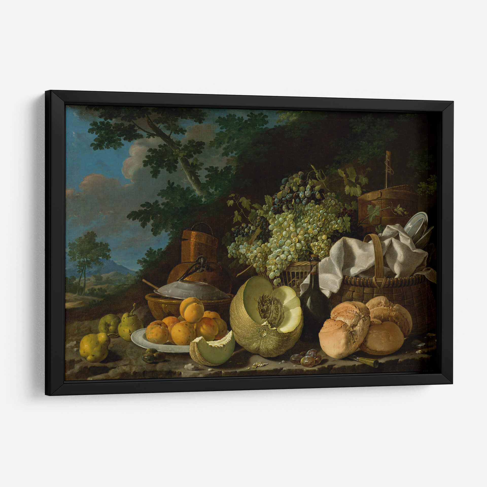 Sumérgete en la riqueza visual de "La Merienda", una obra maestra que evoca la abundancia y la tranquilidad de un festín al aire libre. Este cuadro decorativo captura la esencia de la naturaleza y la generosidad de la tierra a través de una composición detallada y una paleta de colores cálidos y vibrantes. La obra presenta una suntuosa exhibición de frutas maduras, racimos de uvas jugosas, pan recién horneado y melón refrescante, todo dispuesto con maestría sobre una superficie rocosa que se funde con un exuberante paisaje boscoso. La luz, cuidadosamente manejada, resalta las texturas y volúmenes de cada elemento, creando un ambiente de realismo y serenidad. Los tonos terrosos y verdes predominantes se entrelazan con los cálidos dorados de la fruta y el pan, ofreciendo una sensación de confort y calidez. "La Merienda" es más que una simple representación; es una invitación a disfrutar de los placeres simples de la vida, ideal para añadir un toque de elegancia rústica y sofisticación a tu comedor, cocina o sala de estar. Este cuadro decorativo es perfecto para aquellos que aprecian el arte clásico y buscan infundir sus espacios con una atmósfera de calma y abundancia, convirtiéndose en el punto focal de cualquier habitación y un tema de conversación garantizado.