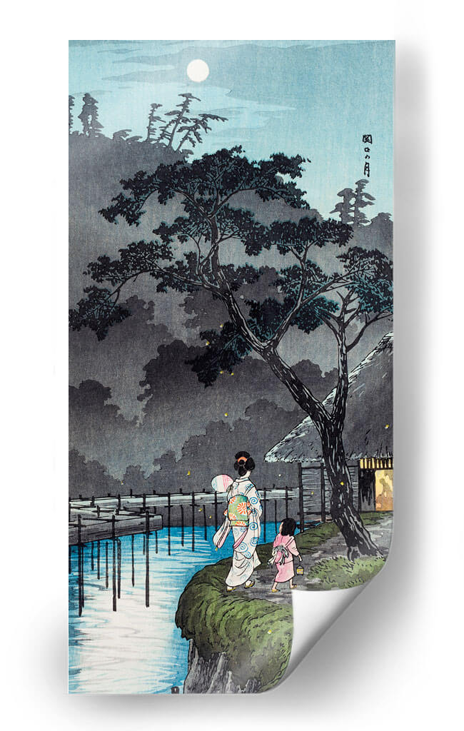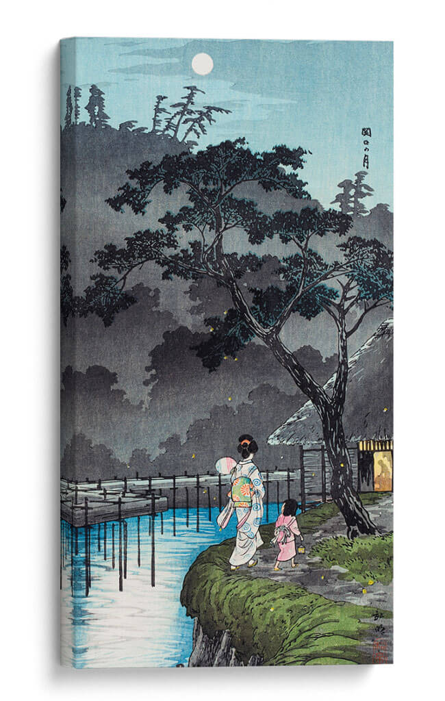 Sumérgete en la serena belleza de "Luna en Sekiguchi", una obra maestra del artista Hiroaki Takahashi que captura la magia de una noche japonesa bajo la luz de la luna. Esta exquisita pieza evoca un ambiente de tranquilidad y misterio, transportando al espectador a un paisaje onírico. La composición presenta una mujer y una niña vestidas con kimonos tradicionales, caminando junto a un cuerpo de agua sereno, iluminado por el resplandor de la luna llena y el parpadeo de las luciérnagas. Los tonos fríos del cielo nocturno, el azul profundo del agua y los verdes exuberantes de la orilla crean una paleta de colores armoniosa y envolvente. El estilo, reminiscente de las xilografías ukiyo-e, añade una dimensión cultural y artística única. "Luna en Sekiguchi" es ideal para quienes buscan añadir un toque de elegancia serena y encanto histórico a su hogar u oficina. Este cuadro decorativo no solo embellece el espacio, sino que también invita a la contemplación y a la apreciación de la delicadeza artística, convirtiéndose en un punto focal cautivador que inspira calma y admiración en cualquier ambiente.