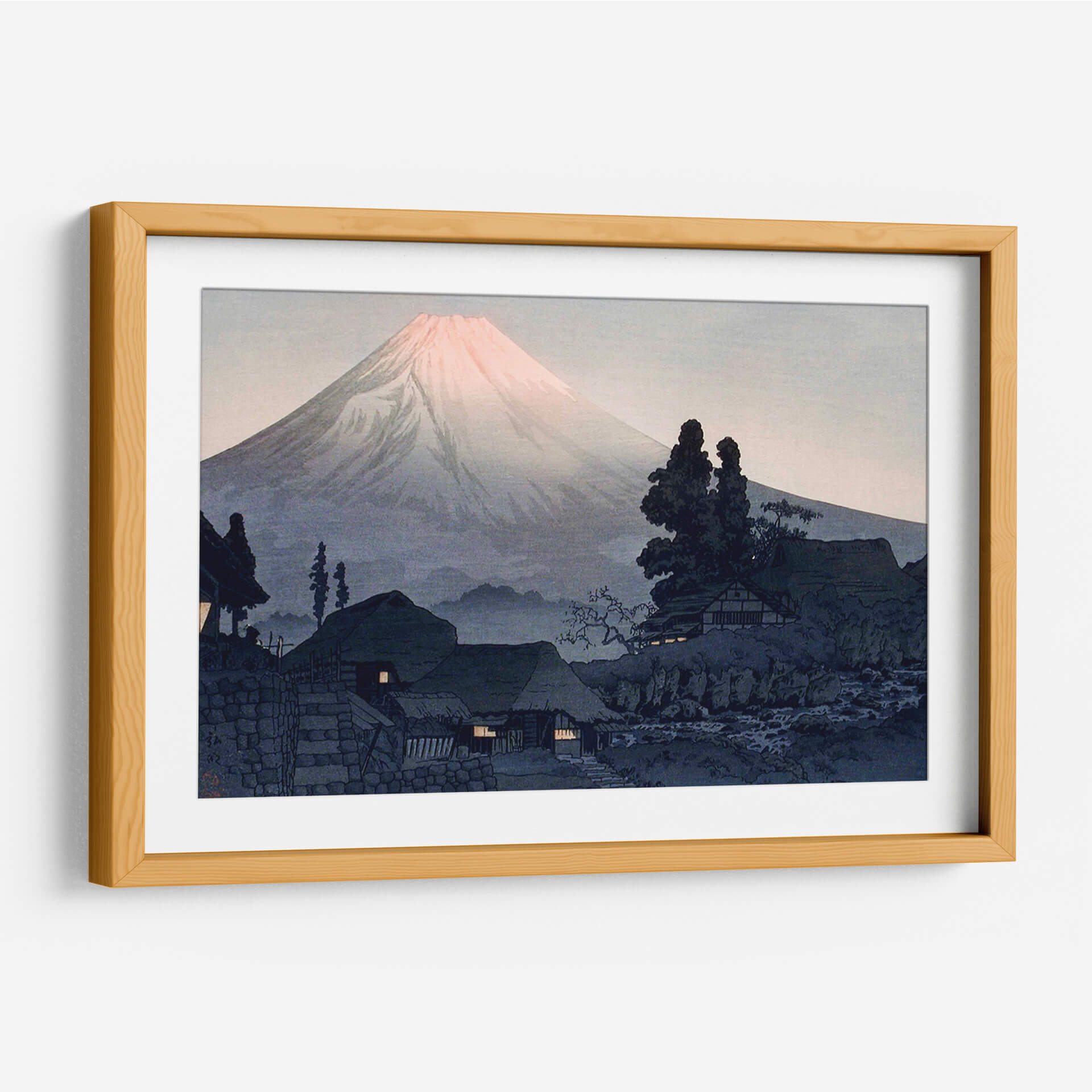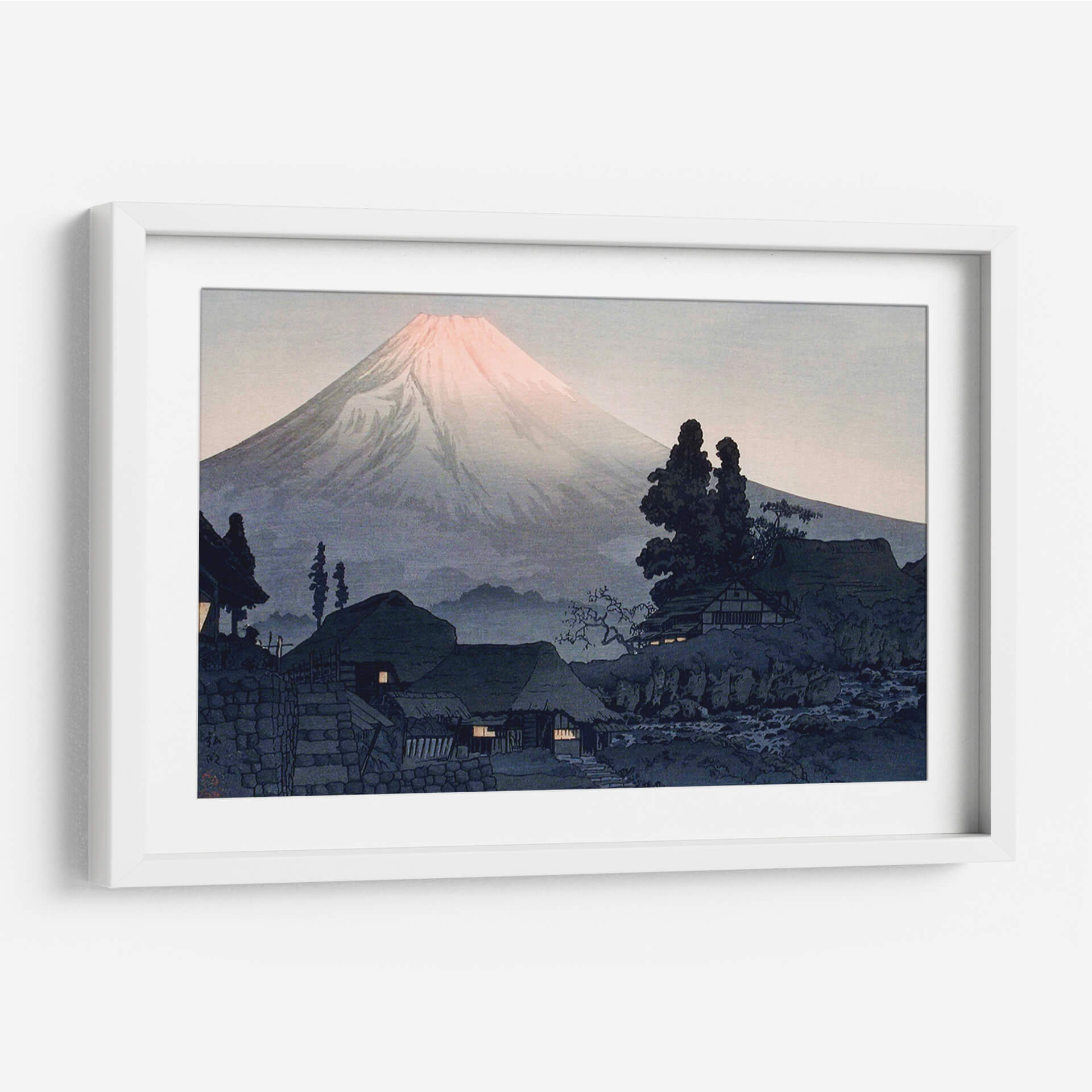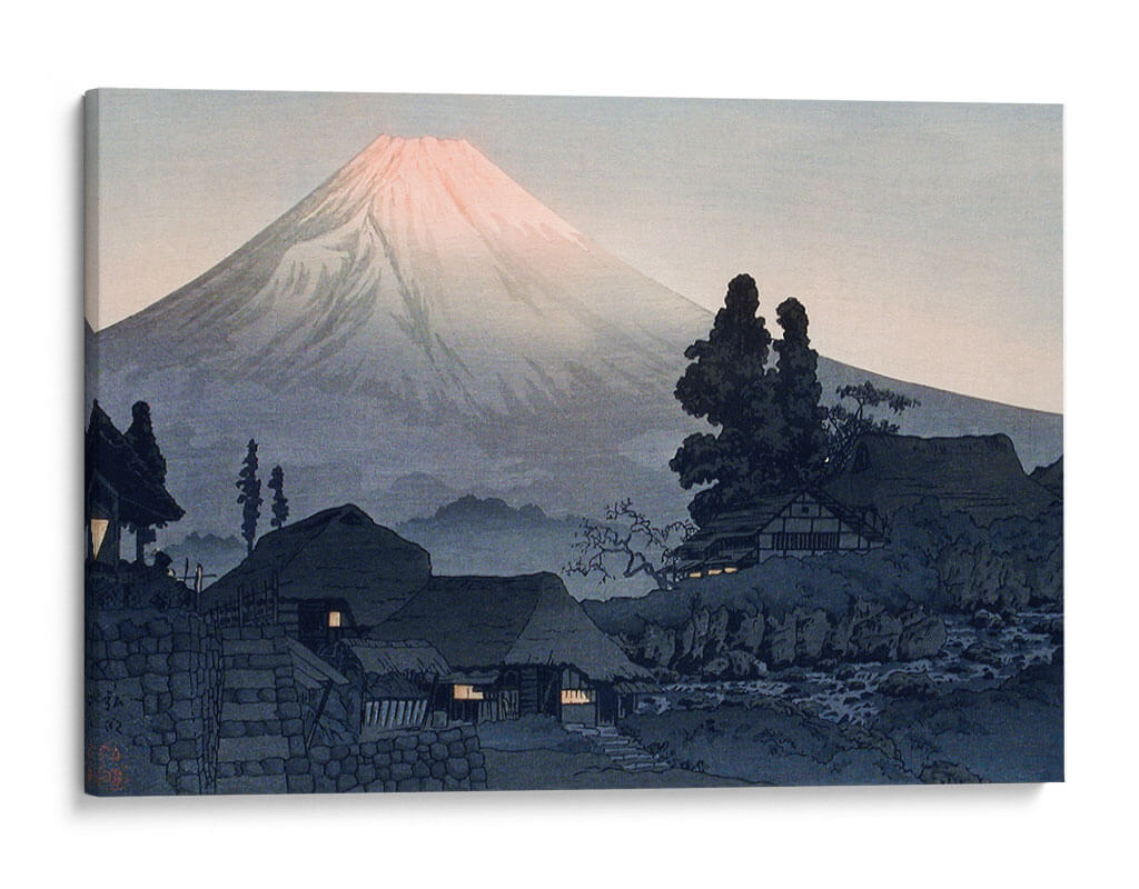 Sumérgete en la serena belleza de 'Monte Fuji desde Mizukubo', una obra maestra del artista Hiroaki Takahashi. Este cuadro decorativo captura la majestuosidad del icónico Monte Fuji con una delicada paleta de colores que evoca tranquilidad y contemplación. Las suaves tonalidades del amanecer tiñen la cima del volcán de un rosado etéreo, contrastando con las sombras profundas y azules del paisaje montañoso y las casas tradicionales en primer plano. La composición, influenciada por el arte Ukiyo-e japonés, presenta una perspectiva que invita a la introspección, con la imponente montaña como punto focal y un sereno asentamiento humano a sus pies. Las luces cálidas que emanan de las ventanas de las casas sugieren un refugio acogedor, añadiendo un toque de intimidad a la grandiosidad del entorno natural. Este lienzo es ideal para infundir calma y un toque de la estética japonesa a cualquier espacio, ya sea un salón, un estudio o un dormitorio. Transforma tu hogar en un santuario de paz y belleza con esta evocadora pieza, perfecta para amantes del arte que aprecian la armonía entre la naturaleza y la vida cotidiana. Una invitación visual a la serenidad y al asombro.
