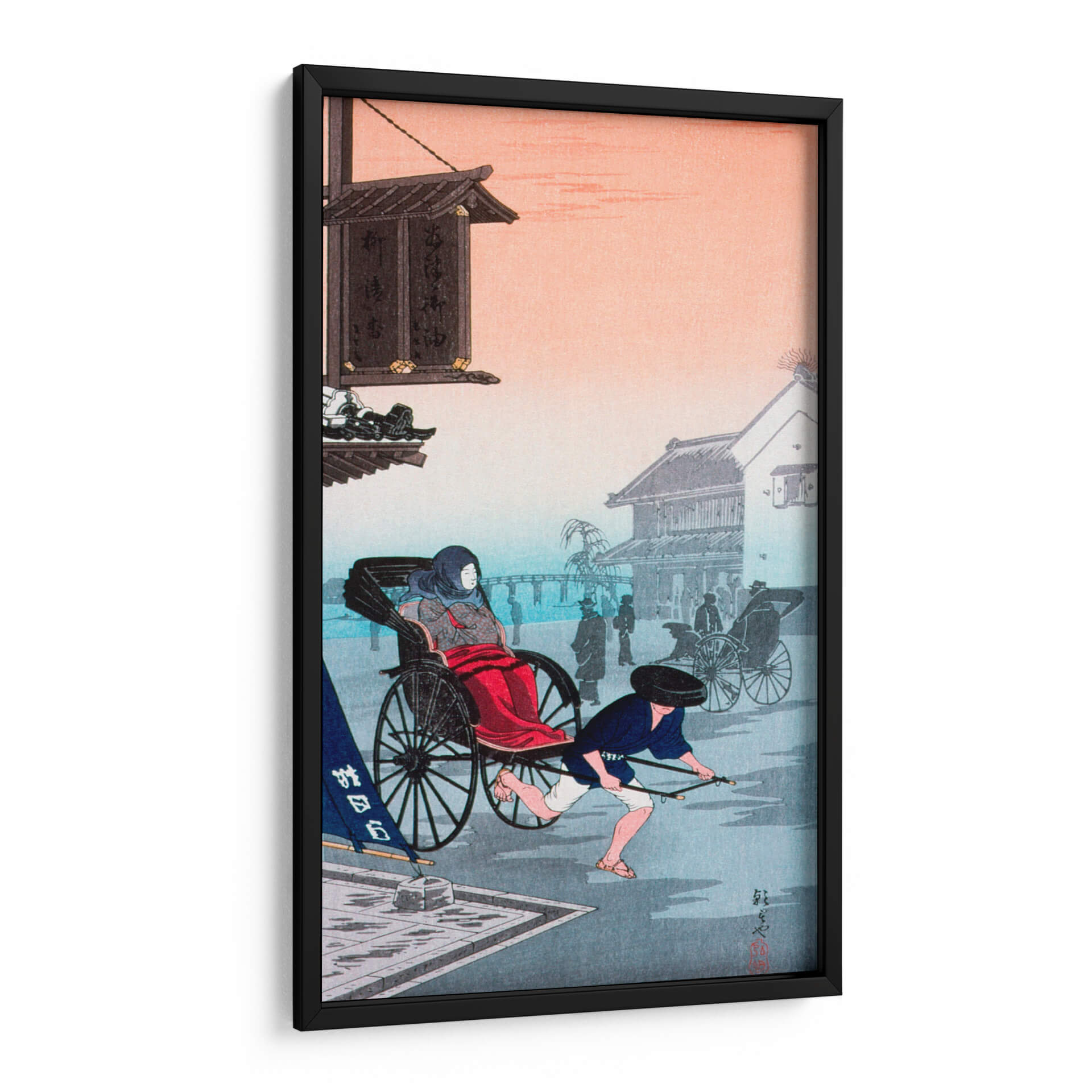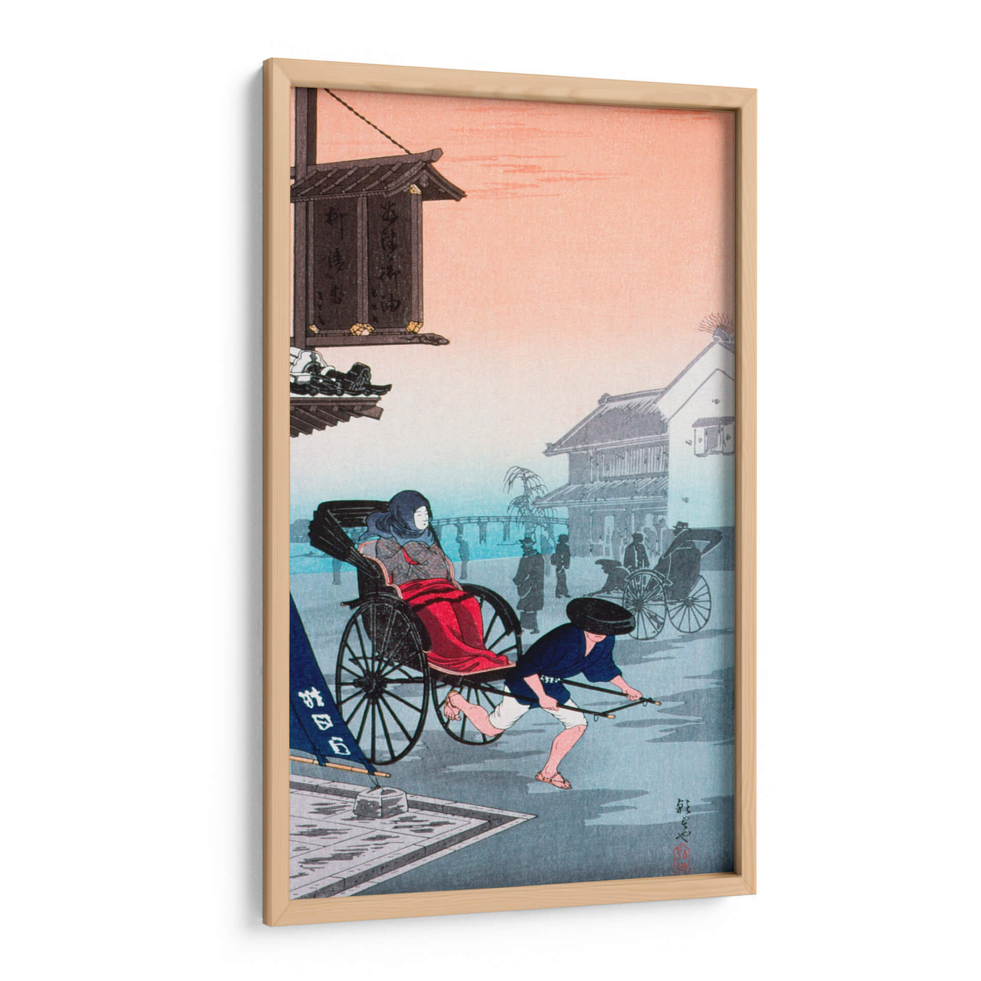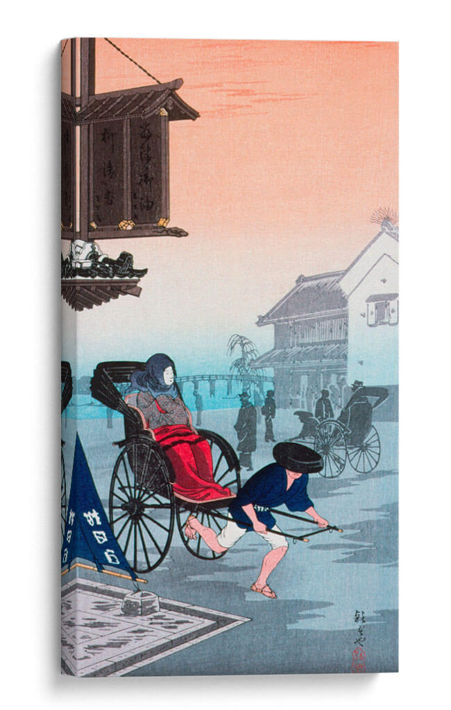 Sumérgete en la atmósfera serena de "Niebla por la mañana", una cautivadora obra de Hiroaki Takahashi. Este cuadro decorativo captura un instante efímero en un paisaje urbano japonés, donde la luz suave de la mañana se filtra a través de una ligera bruma, creando un ambiente de tranquilidad y contemplación. La pieza presenta una escena con un rickshaw tradicional, una figura sentada vestida con colores vibrantes y un porteador en movimiento, evocando una sensación de la vida cotidiana de antaño. La paleta de colores, dominada por tonos suaves de coral, azul pálido y grises, junto con sutiles toques de rojo, contribuye a la atmósfera pacífica y melancólica. El estilo distintivo de Takahashi, que combina la precisión del grabado japonés con una sensibilidad moderna, da como resultado una composición equilibrada y estéticamente agradable. Este cuadro es ideal para añadir un toque de sofisticación y calma a cualquier espacio, ya sea un salón moderno, un estudio tranquilo o un dormitorio acogedor. "Niebla por la mañana" no es solo una pieza de decoración, sino una invitación a la reflexión y al aprecio por la belleza en los momentos cotidianos.