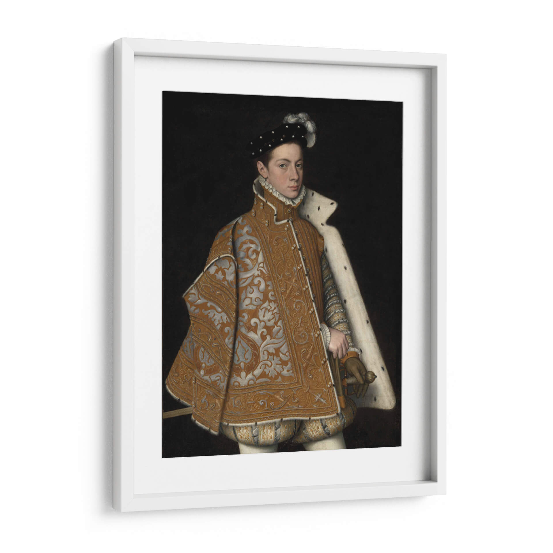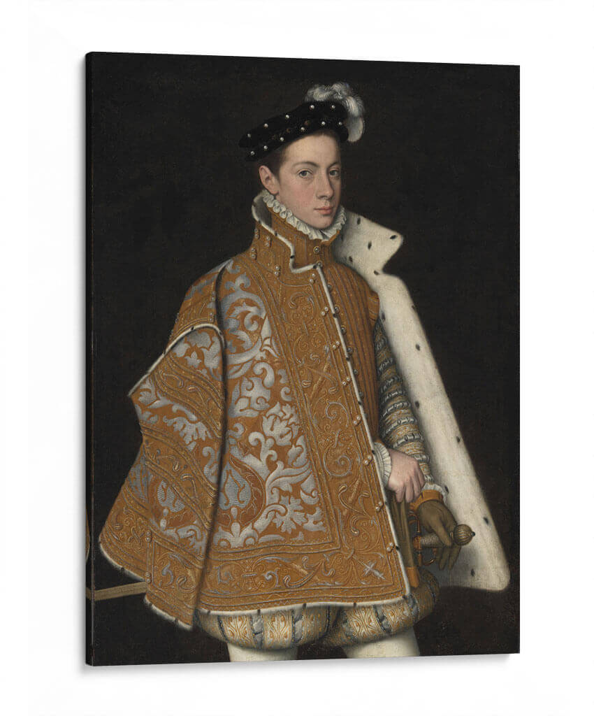 Descubre la magnificencia de "Príncipe Alessandro Farnese" de Sofonisba Anguissola, una obra maestra que trasciende el tiempo para adornar tus espacios con elegancia renacentista. Este retrato cautivador presenta a un joven noble ataviado con una opulenta vestimenta, destacando la riqueza de los detalles en su jubón ricamente ornamentado con motivos florales y geométricos en tonos dorados y plateados. La expresión serena y la postura segura del príncipe invitan a la contemplación, mientras que el fondo oscuro y la capa de armiño que lo envuelve añaden un aire de misterio y autoridad. La paleta de colores, dominada por cálidos dorados, contrastes de luz y sombra y toques de plata, crea una atmósfera de sofisticación y poder. Ideal para añadir un punto focal de distinción a tu estudio, sala de estar o incluso una oficina que busque un toque de historia y refinamiento. Este cuadro decorativo es perfecto para los amantes del arte clásico y para quienes aprecian la maestría de los grandes pintores del Renacimiento, aportando una pieza de conversación y belleza atemporal a cualquier pared.