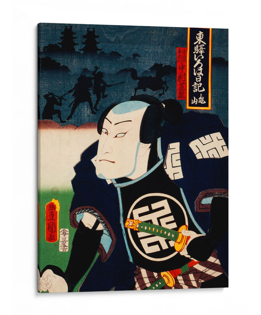 Sumérgete en la intensidad del arte japonés con este cautivador cuadro decorativo inspirado en la obra "Retrato de un actor 13" de Toyohara Kunichika. Esta pieza evoca el dramatismo y la elegancia del teatro Kabuki, presentando a un actor con una expresión enigmática y un vestuario detallado que habla de tradición y carácter. Los vibrantes contrastes de color, con el azul profundo del fondo y los toques de rojo y dorado en el atuendo y las espadas, crean una atmósfera de poder y misterio. La composición, centrada en el rostro expresivo del actor y los sutiles detalles de su vestimenta, invita a una contemplación profunda. Ideal para añadir un toque de sofisticación cultural y un punto de interés visual a cualquier sala de estar, estudio u oficina, este cuadro es una ventana a la rica historia artística de Japón, perfecto para quienes aprecian la estética tradicional y las narrativas visuales potentes. Transforma tu espacio con esta obra maestra que combina historia, arte y un diseño impactante.