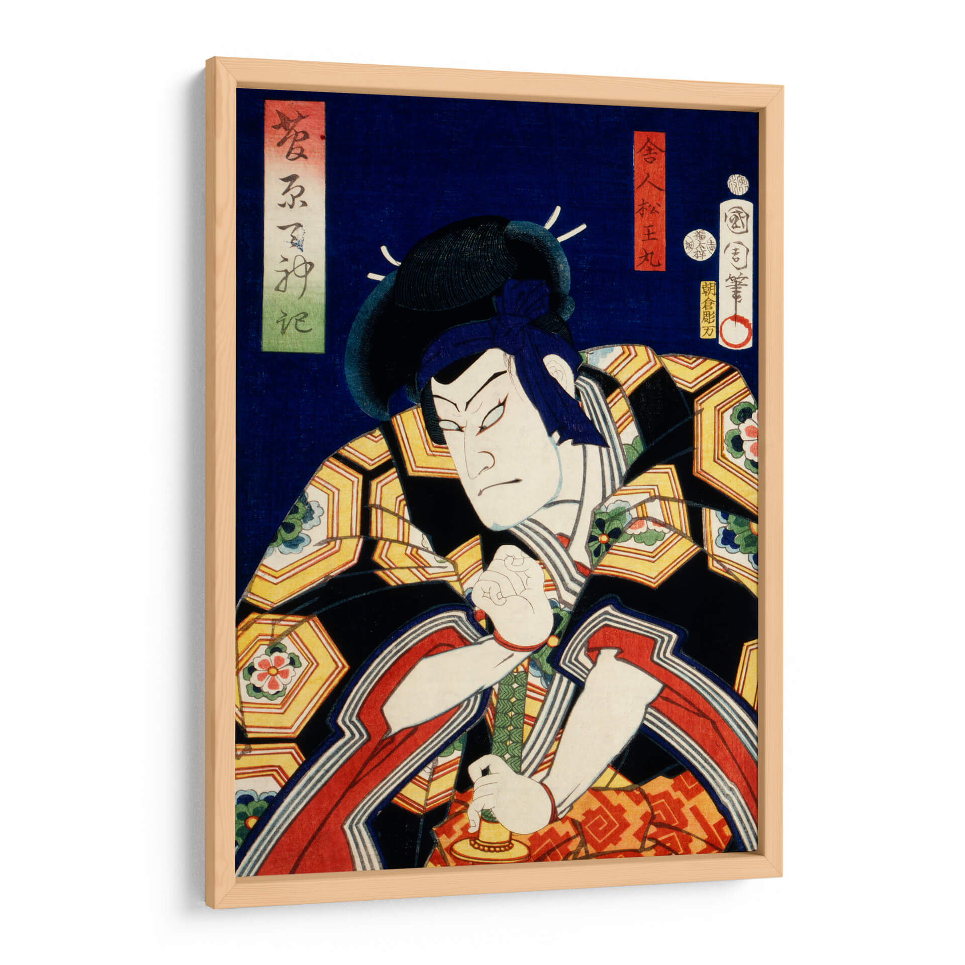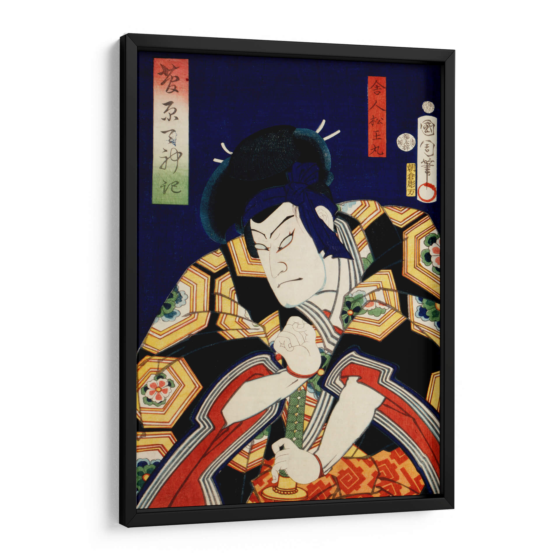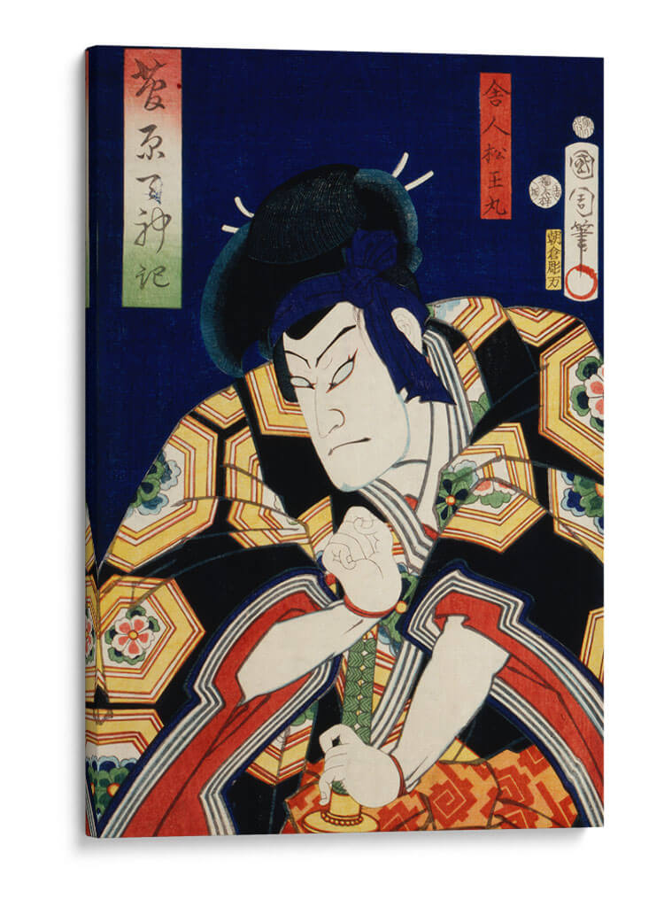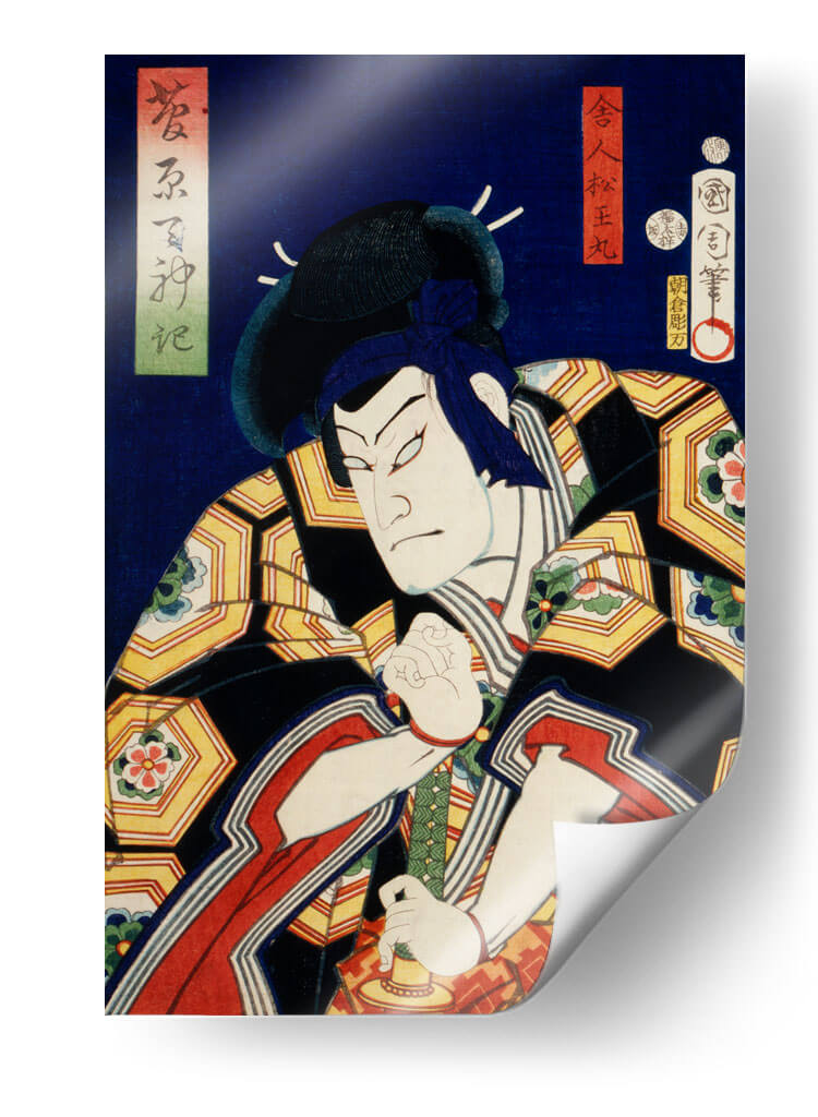Sumérgete en la intensidad del arte Ukiyo-e con este cautivador cuadro decorativo que presenta un retrato de actor japonés, obra del célebre artista Toyohara Kunichika. La pieza captura la esencia dramática de una figura escénica, con un gesto enfocado y una expresión penetrante que evocan potencia y misterio. La paleta de colores vibrantes, dominada por profundos azules, negros, dorados y toques de rojo y verde, crea un contraste visual impactante, propio del estilo japonés tradicional. Los intrincados patrones en la vestimenta del actor añaden una capa de detalle y sofisticación a la composición. Este cuadro decorativo es ideal para quienes buscan añadir un elemento de historia, cultura y arte asiático a sus espacios, ya sea en una sala de estar, un estudio o una oficina. Su naturaleza narrativa y su fuerte presencia visual lo convierten en un punto focal irresistible, capaz de transformar cualquier ambiente y despertar la conversación. Añade un toque de autenticidad y carácter a tu decoración con esta exquisita representación de la tradición teatral japonesa, perfecta para amantes del arte clásico y contemporáneo que aprecian la maestría y la profundidad emocional en cada trazo.