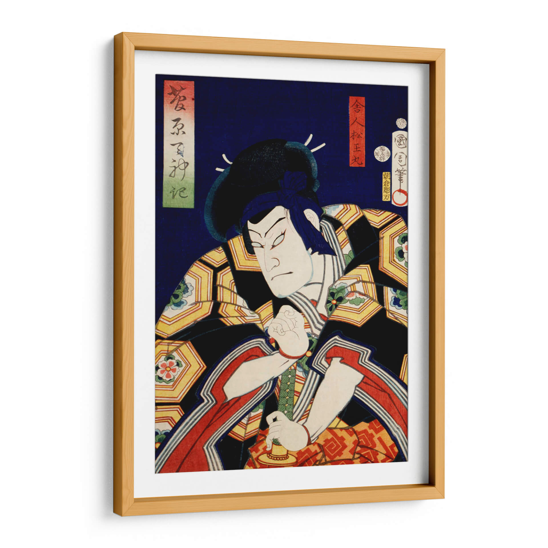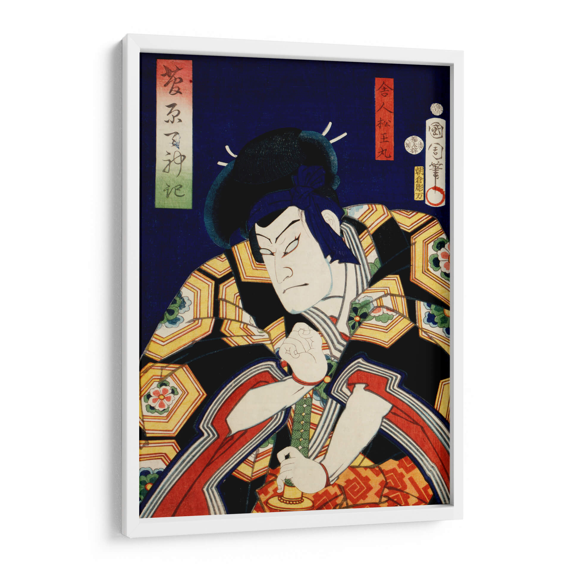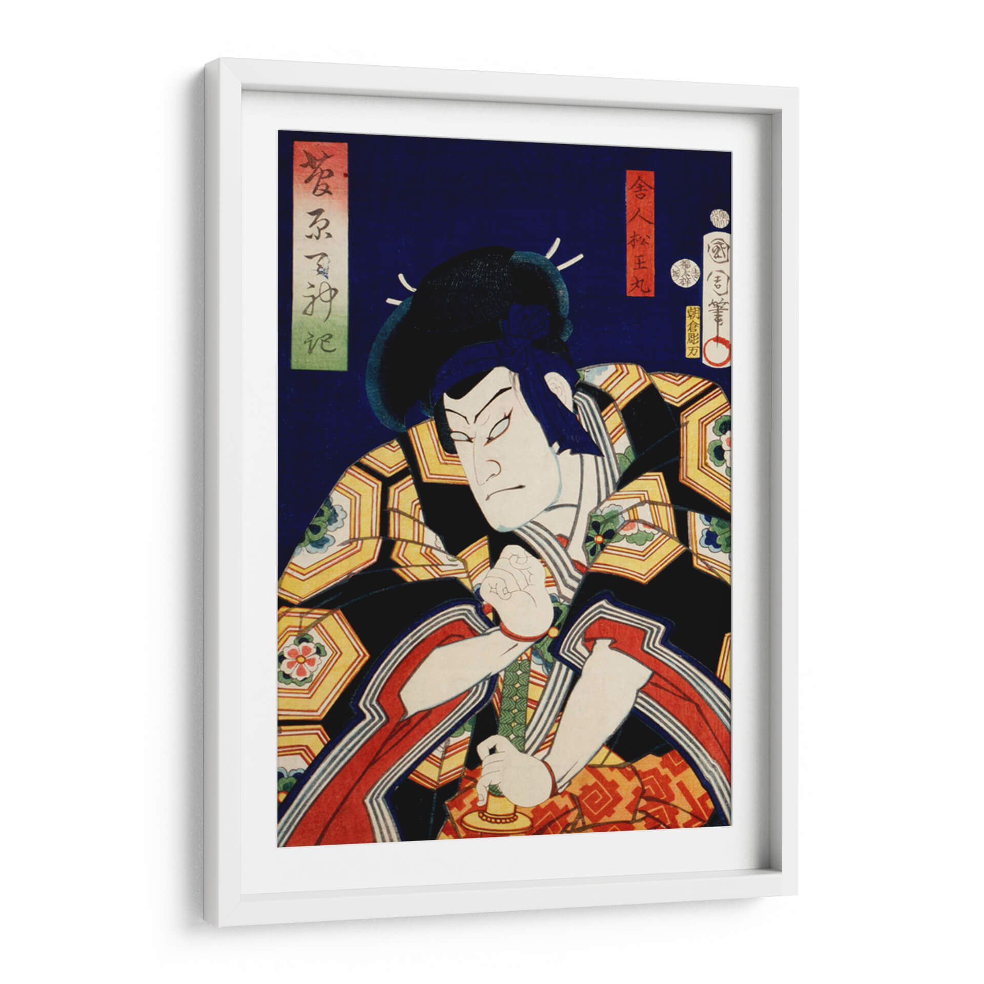 Sumérgete en la intensidad del arte Ukiyo-e con este cautivador cuadro decorativo que presenta un retrato de actor japonés, obra del célebre artista Toyohara Kunichika. La pieza captura la esencia dramática de una figura escénica, con un gesto enfocado y una expresión penetrante que evocan potencia y misterio. La paleta de colores vibrantes, dominada por profundos azules, negros, dorados y toques de rojo y verde, crea un contraste visual impactante, propio del estilo japonés tradicional. Los intrincados patrones en la vestimenta del actor añaden una capa de detalle y sofisticación a la composición. Este cuadro decorativo es ideal para quienes buscan añadir un elemento de historia, cultura y arte asiático a sus espacios, ya sea en una sala de estar, un estudio o una oficina. Su naturaleza narrativa y su fuerte presencia visual lo convierten en un punto focal irresistible, capaz de transformar cualquier ambiente y despertar la conversación. Añade un toque de autenticidad y carácter a tu decoración con esta exquisita representación de la tradición teatral japonesa, perfecta para amantes del arte clásico y contemporáneo que aprecian la maestría y la profundidad emocional en cada trazo.