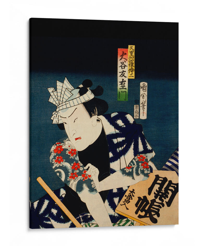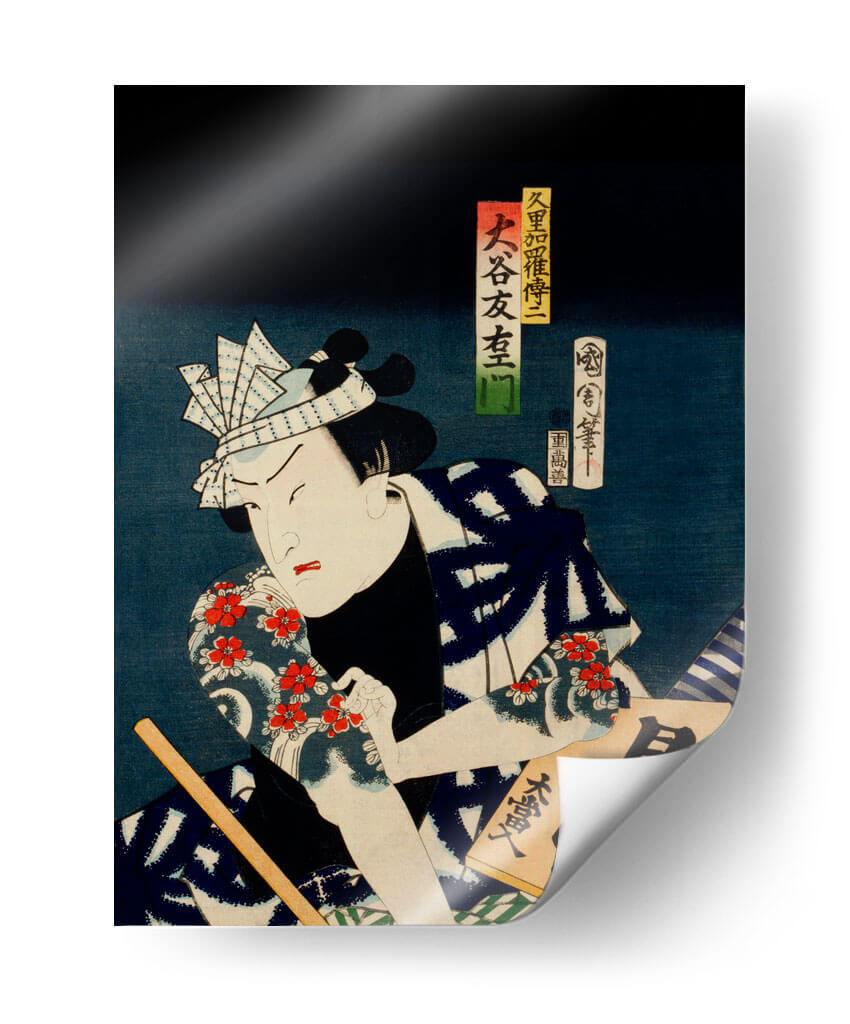 Sumérgete en la cautivadora representación de un actor japonés en esta obra de arte tradicional Ukiyo-e, atribuida al renombrado artista Toyohara Kunichika. La pieza presenta un primer plano detallado de un actor con un gesto dramático, capturando la intensidad y el carisma propios de las artes escénicas del período Edo. La paleta de colores, dominada por profundos azules, vibrantes rojos y sutiles toques de blanco y negro, crea una atmósfera de teatralidad y elegancia. El intrincado diseño del vestuario, con motivos florales y patrones geométricos, añade profundidad y riqueza visual a la composición. Este cuadro decorativo es perfecto para añadir un toque de sofisticación y cultura oriental a cualquier espacio, ya sea una sala de estar moderna, un estudio o una oficina. La expresión facial del actor y su postura transmiten una narrativa visual que invita a la contemplación, convirtiendo esta pieza en un punto focal artístico y una ventana a la historia y el arte japonés.